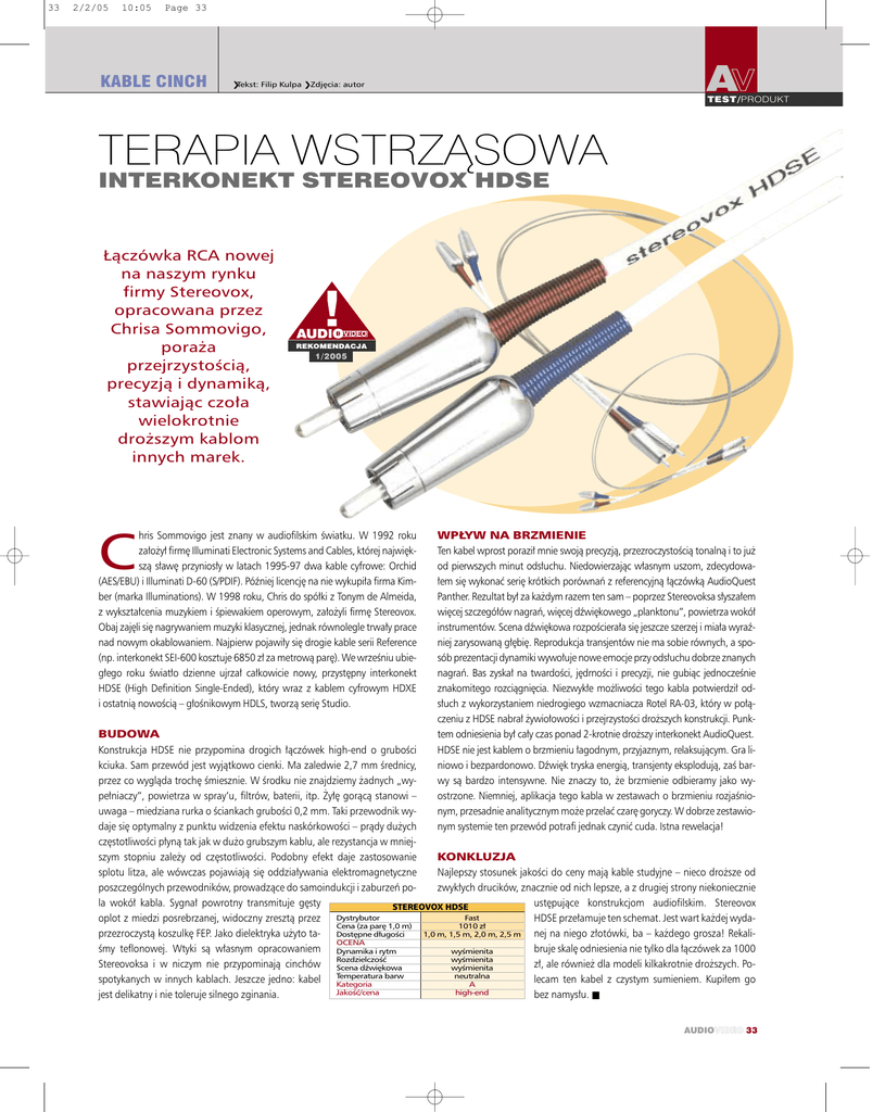 33 2/2/05 10:05 Page 33 KABLE CINCH AV Tekst: Filip Kulpa Zdj´cia: autor TEST/PRODUKT TERAPIA WSTRZÑSOWA INTERKONEKT STEREOVOX HDSE ¸àczówka RCA nowej na naszym rynku firmy Stereovox, opracowana przez Chrisa Sommovigo, pora˝a przejrzystoÊcià, precyzjà i dynamikà, stawiajàc czo∏a wielokrotnie dro˝szym kablom innych marek. 1/2005 hris Sommovigo jest znany w audiofilskim Êwiatku. W 1992 roku za∏o˝y∏ firm´ Illuminati Electronic Systems and Cables, której najwi´kszà s∏aw´ przynios∏y w latach 1995-97 dwa kable cyfrowe: Orchid (AES/EBU) i Illuminati D-60 (S/PDIF). Póêniej licencj´ na nie wykupi∏a firma Kimber (marka Illuminations). W 1998 roku, Chris do spó∏ki z Tonym de Almeida, z wykszta∏cenia muzykiem i Êpiewakiem operowym, za∏o˝yli firm´ Stereovox. Obaj zaj´li si´ nagrywaniem muzyki klasycznej, jednak równolegle trwa∏y prace nad nowym okablowaniem. Najpierw pojawi∏y si´ drogie kable serii Reference (np. interkonekt SEI-600 kosztuje 6850 z∏ za metrowà par´). We wrzeÊniu ubieg∏ego roku Êwiat∏o dzienne ujrza∏ ca∏kowicie nowy, przyst´pny interkonekt HDSE (High Definition Single-Ended), który wraz z kablem cyfrowym HDXE i ostatnià nowoÊcià – g∏oÊnikowym HDLS, tworzà seri´ Studio. C WP¸YW NA BRZMIENIE Ten kabel wprost porazi∏ mnie swojà precyzjà, przezroczystoÊcià tonalnà i to ju˝ od pierwszych minut ods∏uchu. Niedowierzajàc w∏asnym uszom, zdecydowa∏em si´ wykonaç seri´ krótkich porównaƒ z referencyjnà ∏àczówkà AudioQuest Panther. Rezultat by∏ za ka˝dym razem ten sam – poprzez Stereovoksa s∏ysza∏em wi´cej szczegó∏ów nagraƒ, wi´cej dêwi´kowego „planktonu”, powietrza wokó∏ instrumentów. Scena dêwi´kowa rozpoÊciera∏a si´ jeszcze szerzej i mia∏a wyraêniej zarysowanà g∏´bi´. Reprodukcja transjentów nie ma sobie równych, a sposób prezentacji dynamiki wywo∏uje nowe emocje przy ods∏uchu dobrze znanych nagraƒ. Bas zyska∏ na twardoÊci, j´drnoÊci i precyzji, nie gubiàc jednoczeÊnie znakomitego rozciàgni´cia. Niezwyk∏e mo˝liwoÊci tego kabla potwierdzi∏ ods∏uch z wykorzystaniem niedrogiego wzmacniacza Rotel RA-03, który w po∏àczeniu z HDSE nabra∏ ˝ywio∏owoÊci i przejrzystoÊci dro˝szych konstrukcji. Punktem odniesienia by∏ ca∏y czas ponad 2-krotnie dro˝szy interkonekt AudioQuest. HDSE nie jest kablem o brzmieniu ∏agodnym, przyjaznym, relaksujàcym. Gra liniowo i bezpardonowo. Dêwi´k tryska energià, transjenty eksplodujà, zaÊ barwy sà bardzo intensywne. Nie znaczy to, ˝e brzmienie odbieramy jako wyostrzone. Niemniej, aplikacja tego kabla w zestawach o brzmieniu rozjaÊnionym, przesadnie analitycznym mo˝e przelaç czar´ goryczy. W dobrze zestawionym systemie ten przewód potrafi jednak czyniç cuda. Istna rewelacja! BUDOWA Konstrukcja HDSE nie przypomina drogich ∏àczówek high-end o gruboÊci kciuka. Sam przewód jest wyjàtkowo cienki. Ma zaledwie 2,7 mm Êrednicy, przez co wyglàda troch´ Êmiesznie. W Êrodku nie znajdziemy ˝adnych „wype∏niaczy”, powietrza w spray’u, filtrów, baterii, itp. ˚y∏´ goràcà stanowi – uwaga – miedziana rurka o Êciankach gruboÊci 0,2 mm. Taki przewodnik wydaje si´ optymalny z punktu widzenia efektu naskórkowoÊci – pràdy du˝ych cz´stotliwoÊci p∏ynà tak jak w du˝o grubszym kablu, ale rezystancja w mniejKONKLUZJA szym stopniu zale˝y od cz´stotliwoÊci. Podobny efekt daje zastosowanie Najlepszy stosunek jakoÊci do ceny majà kable studyjne – nieco dro˝sze od splotu litza, ale wówczas pojawiajà si´ oddzia∏ywania elektromagnetyczne zwyk∏ych drucików, znacznie od nich lepsze, a z drugiej strony niekoniecznie poszczególnych przewodników, prowadzàce do samoindukcji i zaburzeƒ poust´pujàce konstrukcjom audiofilskim. Stereovox la wokó∏ kabla. Sygna∏ powrotny transmituje g´sty STEREOVOX HDSE Fast HDSE prze∏amuje ten schemat. Jest wart ka˝dej wydaoplot z miedzi posrebrzanej, widoczny zresztà przez Dystrybutor Cena (za par´ 1,0 m) 1010 z∏ nej na niego z∏otówki, ba – ka˝dego grosza! Rekaliprzezroczystà koszulk´ FEP. Jako dielektryka u˝yto ta- Dost´pne d∏ugoÊci 1,0 m, 1,5 m, 2,0 m, 2,5 m OCENA bruje skal´ odniesienia nie tylko dla ∏àczówek za 1000 Êmy teflonowej. Wtyki sà w∏asnym opracowaniem Dynamika i rytm wyÊmienita RozdzielczoÊç wyÊmienita z∏, ale równie˝ dla modeli kilkakrotnie dro˝szych. PoStereovoksa i w niczym nie przypominajà cinchów Scena dêwi´kowa wyÊmienita barw neutralna lecam ten kabel z czystym sumieniem. Kupi∏em go spotykanych w innych kablach. Jeszcze jedno: kabel Temperatura Kategoria A JakoÊç/cena high-end bez namys∏u. ■ jest delikatny i nie toleruje silnego zginania. AUDIOVIDEO 33