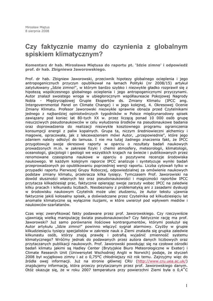 Mirosław Miętus 8 sierpnia 2008 Czy faktycznie mamy do czynienia z globalnym spiskiem klimatycznym? Komentarz dr hab. Mirosława Miętusa do raportu pt. 'Idzie zimno' i odpowiedź prof. dr hab. Zbigniewa Jaworowskiego. Prof. dr hab. Zbigniew Jaworowski, przeciwnik hipotezy globalnego ocieplenia i jego antropogenicznych przyczyn opublikował na łamach Polityki (nr 2008/15) artykuł zatytułowany „Idzie zimno!", w którym bardzo szybko i niezwykle gładko rozprawił się z hipotezą współczesnego globalnego ocieplenia i jego antropogenicznymi przyczynami. Autor znalazł swoistego wroga w ubiegłorocznym współlaureacie Pokojowej Nagrody Nobla - Międzyrządowej Grupie Ekspertów ds. Zmiany Klimatu (IPCC ang. Intergovernmental Panel on Climate Change) i w jego kolejnej, 4. Okresowej Ocenie Zmiany Klimatu. Profesor Jaworowski niezwykle sprawnie obnaŜa przed Czytelnikami jednego z najbardziej opiniotwórczych tygodników w Polsce międzynarodowy spisek zawiązany pod koniec lat 80-tych XX w. przez liczącą ponad 10 000 osób grupę nieuczciwych pseudonaukowców w celu wyłudzenia środków na pseudonaukowe badania oraz doprowadzenia do realizacji niezwykle kosztownego programu ograniczenia konsumpcji energii z paliw kopalnych. Grupa ta, niczym średniowieczni alchemicy i magowie, opracowała, jak z lekcewaŜeniem mówi Autor, „przepowiednie", które jego zdaniem naleŜy odłoŜyć do lamusa. I nie ma tutaj Ŝadnego znaczenia fakt, Ŝe IPCC przygotowuje swoje okresowe raporty w oparciu o rezultaty badań naukowych prowadzonych m.in. w zakresie fizyki i chemii atmosfery, meteorologii, klimatologii, oceanologii, glacjologii i geologii we wszystkich krajach na świecie i publikowanych przez renomowane czasopisma naukowe w oparciu o pozytywne recenzje środowiska naukowego. W kaŜdym kolejnym raporcie IPCC analizuje i syntetyzuje wyniki badań przeprowadzonych po opublikowaniu poprzedniej wersji raportu. Liczba cytowań tylko w przypadki raportu Pierwszej Grupy Roboczej, odpowiedzialnej za omówienie naukowych podstaw zmiany klimatu, przekracza kilka tysięcy. Tymczasem Prof. Jaworowiski na dowód słuszności własnych tez oraz pseudonaukowości i magiczności raportów IPCC przytacza kilkadziesiąt prac, faktycznie opierając swoje zarzuty wobec IPCC na zaledwie kilku pracach i kilkunastu liczbach. Nieobeznany z problematyką ani z zasadami dyskusji w środowisku naukowym Czytelnik moŜe ulec złudzeniu, Ŝe Autor tekstu ujawnia faktycznie jakiś kolosalny spisek, a doświadczane przez Czytelnika od kilkudziesięciu lat anomalie klimatyczne są wyłącznie iluzjami, w które uwierzył pod wpływem mediów i naukowców-szarlatanów. Czas więc zweryfikować fakty podawane przez prof. Jaworowskiego. Czy rzeczywiście ujawniają wielką manipulację świata pseudonaukowców? Czy faktycznie rację ma prof. Jaworowski? JuŜ samo porównanie ilościowe kontrargumentów, którymi posłuŜył się Autor artykułu „Idzie zimno!" powinno włączyć sygnał alarmowy. CzyŜby w grupie kilkudziesięciu tysięcy specjalistów w zakresie nauk o Ziemi znalazła się grupka zaledwie kilkunastu osób, którzy znają prawdę i potrafią wyjaśnić zmienność systemu klimatycznego? Wróćmy jednak do podawanych przez autora danych liczbowych oraz przytaczanych publikacji naukowych. Prof. Jaworowski powołując się na czołowe ośrodki badań klimatu jakimi są Hadley Center (Brytyjskie Biuro Meteorologiczne w Exeter) i Climate Research Unit (Uniwersytet Wschodniej Anglii w Norwich) podaje, Ŝe styczeń 2008 był wyjątkowo zimny i aŜ o 0,75°C chłodniejszy niŜ rok temu. Zajrzyjmy więc do źródła owej informacji. JuŜ na stronie głównej CRU (http://www.cru.uea.ac.uk/) znajdujemy informację, która przeczy przytaczanym przez prof. Jaworowskiego danym. OtóŜ okazuje się, Ŝe w roku 2007 temperatura przy powierzchni Ziemi była o 0,4˚C 1 wyŜsza od średniej wieloletniej a nie niŜsza od niej, jak podawał Autor wspomnianego artykułu. Nie występuje więc ochłodzenie, proces ocieplenia utrwala się. Jednocześnie CRU podaje, Ŝe rok 2007 był 8. w rankingu najcieplejszych lat od momentu prowadzenia systematycznych pomiarów instrumentalnych. Cieplejszymi była jedynie lata 1998, 2005, 2003, 2002, 2004, 2006 i 2001. Na serwerze tego samego centrum (http://www.cru.uea.ac.uk/cru/climon/monthly/2008/1/) znajdujemy informacje, Ŝe styczeń 2008 roku był takŜe cieplejszy niŜ zwykle, temperatura przy powierzchni globu była o 0,075˚C wyŜsza niŜ średnia (na półkuli północnej była wyŜsza o 0,088˚C). Cieplej było równieŜ w lutym i w marcu. Gdzie jest więc owe ochłodzenie? Analogiczne dane podaje cytowane przez Autora artykułu amerykańskie National Climatic Data Center (NCDC). W raporcie dotyczącym charakterystyki stanu systemu klimatycznego w styczniu 2008 roku (http://www.ncdc.noaa.gov/oa/climate/research/2008/jan/global.html) czytamy, Ŝe globalna temperatura powietrza nad lądami i oceanami była w styczniu wyŜsza od średniej aŜ o 0,18˚C (o 0,10˚C na półkuli północnej i o 0,28˚C na półkuli południowej). Jednocześnie specjaliści amerykańscy piszą, Ŝe w styczniu br. cieplej niŜ zwykle było w Europie, północnej Azji, we wschodnich i centralnych częściach USA i na większości terytorium Australii. Chłodniej niŜ zwykle było natomiast na Środkowym Wschodzie, w Centralnej Azji, południowo-wschodnich Chinach, zachodniej części USA i w zachodniej Alasce. W tym samym raporcie znajdujemy informacje, Ŝe pomimo to, iŜ środkowa troposfera była w styczniu 2008 chłodniejsza niŜ zwykle to nadal utrzymuje się dodatni trend temperatury wynoszący 0,05˚C/dekadę oraz ochładzanie się stratosfery (zgodne zresztą z teorią globalnego ocieplenia). Jest prawdą, Ŝe półkula północna była w styczniu pokryta śniegiem na obszarze niespotykanym od momentu rozpoczęcia systematycznego monitorowania jej zasięgu tj. od roku 1967, jednak na obszarze Stanów 