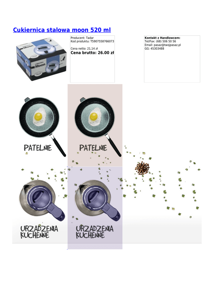 Cukiernica stalowa moon 520 ml Producent: Tadar Kod produktu: T5907558766073 Cena netto: 21,14 zł Cena brutto: 26.00 zł Kontakt z Handlowcem: Tel/Fax: (68) 506 50 56 Email: [email protected] GG: 45303488 Cukiernica stalowa MOON 520 ml - Tadar Kod produktu: T5907558766073 Cukiernica stalowa MOON 520 ml Cukiernica ze stali nierdzewnej z łyżeczką w komplecie. Jej klasyczny kształt i eleganckie wykończenie, zachwyci swoją prostotą każdego z zaproszonych gości. Jej uniwersalny wygląd sprawi, że będzie idealnym prezentem dla każdego. W skład kompletu wchodzi niebanalna, elegancka cukiernica z przykrywką oraz poręczną, zgrabną łyżeczką do cukru. Ze względu na wykorzystanie najwyższej jakości materiałów, produkt jest bardzo łatwy w utrzymaniu czystości i prosty w użytkowaniu. Specyfikacja: ● ● ● Cukiernica z pokrywką i łyżeczką Wykonana z wysokiej jakości stali nierdzewnej Pojemność całkowita: 520 ml Użytkowanie: ● kontakt z żywnością Kod produktu:T5907558766073 ID produktu:154942 Granos Group sp. z o.o. ul. Sulechowska 4a budynek 45 65-001 Zielona Góra