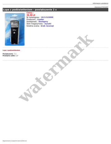 Informacje o produkcie Utworzono 07-03-2017 Lupa z podświetleniem - powiększenie 2 x Cena : 36,90 zł Lupa z podświetleniem w at Powiększenie: 2 x Przekątna szkła: 2,2" er m ar k Nr katalogowy : 10/115/0000 Producent : Leader Dostępność : Dostępny Stan magazynowy : wysoki Średnia ocena : brak recenzji Wygenerowano w programie www.oscGold.com