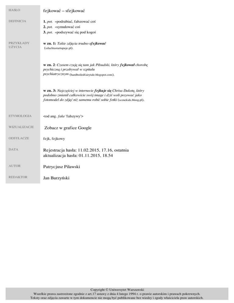 HASŁO fejkować – sfejkować DEFINICJA 1. pot. «podrabiać, fałszować coś» 2. pot. «symulować coś» 3. pot. «podszywać się pod kogoś» PRZYKŁADY UŻYCIA w zn. 1: Takie zdjęcia trudno sfejkować (szlachtastartupuje.pl). w zn. 2: Czasem czuję się tam jak Piłsudski, który fejkował chorobę psychiczną i przebywał w szpitalu psychiatrycznym (hardboiledfairytale.blogspot.com). w zn. 3: Najczęściej w internecie fejkuje się Chrisa Dakotę, który podobno zmienił całkowicie swój image i dziś woli pozować jako fotomodel do zdjęć niż samemu robić sobie fotki (scenekids.bloog.pl). ETYMOLOGIA WIZUALIZACJE <od ang. fake 'fałszywy'> Zobacz w grafice Google ODSYŁACZE fejk, fejkowy DATA Rejestracja hasła: 11.02.2015, 17.16, ostatnia aktualizacja hasła: 01.11.2015, 18.54 AUTOR Patrycjusz Pilawski REDAKTOR Jan Burzyński Copyright © Uniwersytet Warszawski Wszelkie prawa zastrzeżone zgodnie z art.17 ustawy z dnia 4 lutego 1994 r. o prawie autorskim i prawach pokrewnych. Teksty oraz zdjęcia zawarte w tym dokumencie nie mogą być publikowane bez wiedzy i zgody właściciela praw autorskich. Powered by TCPDF (www.tcpdf.org)