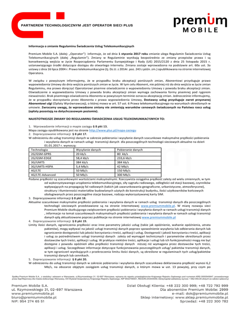 InformacjaozmianieRegulaminuŚwiadczeniaUsługTelekomunikacyjnych PremiumMobileS.A.(dalej:„Operator”)informuje,żeoddnia1stycznia2017rokuzmianieulegaRegulaminŚwiadczeniaUsług Telekomunikacyjnych (dalej „Regulamin”). Zmiany w Regulaminie wynikają bezpośrednio ze zmiany przepisów prawa i są konsekwencją wejścia w życie Rozporządzenia Parlamentu Europejskiego i Rady (UE) 2015/2120 z dnia 25 listopada 2015 r. ustanawiającego środki dotyczące dostępu do otwartego internetu. Zmiana zostaje wprowadzona na podstawie art. 60a ust. 3a ustawyzdnia16lipca2004r.Prawotelekomunikacyjne(tj.Dz.U.z2014r.poz.243zpóźn.zm.)opublikowananastronieinternetowej Operatora. W związku z powyższym informujemy, że w przypadku braku akceptacji poniższych zmian, Abonentowi przysługuje prawo wypowiedzeniaUmowydodniawejściaponiższychzmianwżycie.WtymceluAbonent,niepóźniejniżdodniawejściawżyciezmian Regulaminu,maprawodoręczyćOperatorowipisemneoświadczenieowypowiedzeniuUmowyzpowodubrakuakceptacjizmian. Oświadczenie o wypowiedzeniu Umowy z powodu braku akceptacji zmian wymaga zachowania formy pisemnej pod rygorem nieważności.BrakpisemnegooświadczeniaAbonentawpowyższymterminieoznaczaakceptacjęzmian.Jednocześnieinformujemy, że w przypadku skorzystania przez Abonenta z prawa wypowiedzenia Umowy, Dostawcy usług przysługuje zwrot przyznanej Abonentowiulgi(OpłatyWyrównawczej),októrejmowawart.57ust.6Prawatelekomunikacyjnegonawarunkachokreślonychw umowie.Zwracamyuwagę,żewprowadzonezmianyniezmieniająwarunkówcenowychświadczonychnaPaństwarzeczusług (opłatypozostająnadotychczasowympoziomie). NAJISTOTNIEJSZEZMIANYDOREGULAMINUŚWIADCZENIAUSŁUGTELEKOMUNIKACYJNYCHTO: 1. Wprowadzenieinformacjiomapiezasięgu§8pkt13. Mapazasięguopublikowanajestnastroniehttp://www.plus.pl/mapa-zasiegu 2. Doprecyzowanieinformacji§8pkt17. Wodniesieniudousługtransmisjidanychwzakresiepobieraniaiwysyłaniedanychszacunkowemaksymalneprędkościpobierania iwysyłaniadanychwramachusługitransmisjidanychdlaposzczególnychtechnologiisieciowychaktualnenadzień 01.01.2017r.wynoszą: Technologia Wysyłaniedanych Pobieraniedanych 2G/GSM-GPRS 20kb/s 80kb/s 2G/GSM-EDGE 58,4kb/s 233,6kb/s 3G/UMTS 384kb/s 384kb/s 3G/UMTS-HSPA 5,4Mb/s 42Mb/s 4G/LTE 50Mb/s 150Mb/s 4G/LTE-Advanced 50Mb/s 300Mb/s Podaneprędkościsąszacunkowymiwartościamimaksymalnymi.Rzeczywistaosiągalnaprędkośćzależyodwieluzmiennych,wtym odwykorzystywanegourządzeniatelekomunikacyjnego,siłysygnałuradiowego,odległościodstacjibazowej,czynników wpływającychnapropagacjęfalradiowych(takichjakuwarunkowaniageograficzne,urbanistyczne,atmosferyczne), strukturyitłumiennościmateriałówbudowlanychużytychdokonstrukcjibudynku,ilościużytkownikówkońcowych obsługiwanychprzezposzczególnestacjebazowe,rodzajuwykorzystywanejkartySIM. 3. Doprecyzowanieinformacji§8pkt18. Aktualneszacunkowemaksymalneprędkościpobieraniaiwysyłaniadanychwramachusługtransmisjidanychdlaposzczególnych technologii sieciowych przedstawione są na stronie internetowej www.premiummobile.pl. W miarę rozwoju sieci PremiumMobileskutkującegozwiększeniemprędkościpobieraniaiwysyłaniadanychwramachusługitransmisjidanych ,informacjenatematszacunkowychmaksymalnychprędkościpobieraniaiwysyłaniadanychwramachusługitransmisji danychędąaktualizowanepoprzezpublikacjenastronieinternetowejwww.premiummobile.pl 4. Doprecyzowanieinformacji§8pkt19. Limity ilości danych, ograniczenia prędkości oraz inne parametry jakości usług (takie jak opóźnienie, wahanie opóźnienia, utrata pakietów),mogąwpływaćnajakośćusługitransmisjidanychpoprzezspowolnieniewysyłanialubodbieraniadanychlub ograniczeniedostępnościlubjakościkorzystaniaztreści,aplikacjiiusług.Dostępnośćijakośćkorzystaniaztreści,aplikacji iusługzapośrednictwemusługitransmisjidanychzależyodwymagańtechnicznychiparametrówokreślonychprzez dostawcówtychtreści,aplikacjiiusług.Wpraktyceniektóretreści,aplikacjeiusługilubichfunkcjonalnościmogąniebyć dostępne z powodu opóźnień albo prędkości transmisji danych niższej niż wymagana przez dostawców tych treści, aplikacjiiusług.Szczegółoweinformacjedotyczącefunkcjonowaniaposzczególnychusług/pakietówtransmisjidanych, wtymograniczeńwynikającychzprzekroczenialimituilościdanych,sąokreślonewregulaminachtychusług/pakietów transmisjidanychlubcennikach. 5. Doprecyzowanieinformacji§8pkt20. Wodniesieniudousługtransmisjidanychwzakresiepobieraniaiwysyłaniadanychszacunkowadeklarowanaprędkośćwynosi6,2 Mb/s, na obszarze objętym zasięgiem usług transmisji danych, o którym mowa w ust. 13 powyżej, przy czym po wykorzystaniupakietutransmisjidanychdostępnegowramachUmowyprędkośćpobieraniaiwysyłaniadanychzostanie zredukowanado32kb/s. 6. Doprecyzowanieinformacji§9pkt5. Szczegółowe zasady korzystania z usług transmisji danych mogą być określone w Regulaminie Usługi, Cenniku lub Regulaminie Promocji.PremiumMobilejestuprawniony,wodniesieniudousługtransmisjidanych:blokować,spowalniać,zmieniać, ograniczać, pogarszać jakość, faworyzować określone treści, aplikacje lub usługi, lub szczególne ich kategorie, a także ingerowaćwniewprzypadkachgdy: a) jestkonieczne/dopuszczalneprzezkrajowealbounijneprawo(przepisprawa,orzeczeniesądu,decyzja administracyjna),któremożewskazywaćcoikiedymożnablokować; b) jestkonieczneabyutrzymaćintegralnośćibezpieczeństwosieci,usługświadczonychzapośrednictwemsiecioraz urządzeńkońcowychAbonentów; c) jestkonieczneabyzapobiecgrożącymprzeciążeniomSieciorazzłagodzićskutkiwyjątkowegolubtymczasowego przeciążeniaSieci,oilerównoważnerodzajetransmisjidanychsątraktowanerówno. 7. Dodanieinformacji§9pkt7. ŚrodkizarządzaniaruchemwSiecisąprzejrzyste,niedyskryminacyjneiproporcjonalneorazopierająsięnaobiektywnychróżnicach wwymogachdotyczącychtechnicznejjakościUsługwzakresieokreślonychkategoriiruchu.Usunięciez§9pkt7zapisu „Procedury,októrychmowawniniejszymustępienie