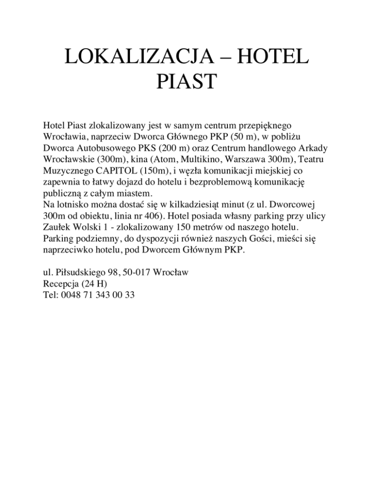 LOKALIZACJA – HOTEL PIAST Hotel Piast zlokalizowany jest w samym centrum przepięknego Wrocławia, naprzeciw Dworca Głównego PKP (50 m), w pobliżu Dworca Autobusowego PKS (200 m) oraz Centrum handlowego Arkady Wrocławskie (300m), kina (Atom, Multikino, Warszawa 300m), Teatru Muzycznego CAPITOL (150m), i węzła komunikacji miejskiej co zapewnia to łatwy dojazd do hotelu i bezproblemową komunikację publiczną z całym miastem. Na lotnisko można dostać się w kilkadziesiąt minut (z ul. Dworcowej 300m od obiektu, linia nr 406). Hotel posiada własny parking przy ulicy Zaułek Wolski 1 - zlokalizowany 150 metrów od naszego hotelu. Parking podziemny, do dyspozycji również naszych Gości, mieści się naprzeciwko hotelu, pod Dworcem Głównym PKP. ul. Piłsudskiego 98, 50-017 Wrocław Recepcja (24 H) Tel: 0048 71 343 00 33