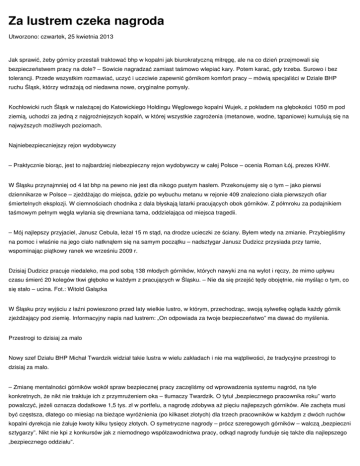 Za lustrem czeka nagroda Utworzono: czwartek, 25 kwietnia 2013 Jak sprawić, żeby górnicy przestali traktować bhp w kopalni jak biurokratyczną mitręgę, ale na co dzień przejmowali się bezpieczeństwem pracy na dole? – Sowicie nagradzać zamiast taśmowo wlepiać kary. Potem karać, gdy trzeba. Surowo i bez tolerancji. Przede wszystkim rozmawiać, uczyć i uczciwie zapewnić górnikom komfort pracy – mówią specjaliści w Dziale BHP ruchu Śląsk, którzy wdrażają od niedawna nowe, oryginalne pomysły. Kochłowicki ruch Śląsk w należącej do Katowickiego Holdingu Węglowego kopalni Wujek, z pokładem na głębokości 1050 m pod ziemią, uchodzi za jedną z najgroźniejszych kopalń, w której wszystkie zagrożenia (metanowe, wodne, tąpaniowe) kumulują się na najwyższych możliwych poziomach. Najniebezpieczniejszy rejon wydobywczy – Praktycznie biorąc, jest to najbardziej niebezpieczny rejon wydobywczy w całej Polsce – ocenia Roman Łój, prezes KHW. W Śląsku przynajmniej od 4 lat bhp na pewno nie jest dla nikogo pustym hasłem. Przekonujemy się o tym – jako pierwsi dziennikarze w Polsce – zjeżdżając do miejsca, gdzie po wybuchu metanu w rejonie 409 znaleziono ciała pierwszych ofiar śmiertelnych eksplozji. W ciemnościach chodnika z dala błyskają latarki pracujących obok górników. Z półmroku za podajnikiem taśmowym pełnym węgla wyłania się drewniana tama, oddzielająca od miejsca tragedii. – Mój najlepszy przyjaciel, Janusz Cebula, leżał 15 m stąd, na drodze ucieczki ze ściany. Byłem wtedy na zmianie. Przybiegliśmy na pomoc i właśnie na jego ciało natknąłem się na samym początku – nadsztygar Janusz Dudzicz przysiada przy tamie, wspominając piątkowy ranek we wrześniu 2009 r. Dzisiaj Dudzicz pracuje niedaleko, ma pod sobą 138 młodych górników, których nawyki zna na wylot i ręczy, że mimo upływu czasu śmierć 20 kolegów tkwi głęboko w każdym z pracujących w Śląsku. – Nie da się przejść tędy obojętnie, nie myśląc o tym, co się stało – ucina. Fot.: Witold Gałązka W Śląsku przy wyjściu z łaźni powieszono przed laty wielkie lustro, w którym, przechodząc, swoją sylwetkę ogląda każdy górnik zjeżdżający pod ziemię. Informacyjny napis nad lustrem: „On odpowiada za twoje bezpieczeństwo” ma dawać do myślenia. Przestrogi to dzisiaj za mało Nowy szef Działu BHP Michał Twardzik widział takie lustra w wielu zakładach i nie ma wątpliwości, że tradycyjne przestrogi to dzisiaj za mało. – Zmianę mentalności górników wokół spraw bezpiecznej pracy zaczęliśmy od wprowadzenia systemu nagród, na tyle konkretnych, że nikt nie traktuje ich z przymrużeniem oka – tłumaczy Twardzik. O tytuł „bezpiecznego pracownika roku” warto powalczyć, jeżeli oznacza dodatkowe 1,5 tys. zł w portfelu, a nagrodę zdobywa aż pięciu najlepszych górników. Ale zachęta musi być częstsza, dlatego co miesiąc na bieżące wyróżnienia (po kilkaset złotych) dla trzech pracowników w każdym z dwóch ruchów kopalni dyrekcja nie żałuje kwoty kilku tysięcy złotych. O symetryczne nagrody – prócz szeregowych górników – walczą „bezpieczni sztygarzy”. Nikt nie kpi z konkursów jak z niemodnego współzawodnictwa pracy, odkąd nagrody funduje się także dla najlepszego „bezpiecznego oddziału”. Cenne minuty dla bezpieczeństwa – Jeden pilnuje drugiego – potwierdzają górnicy na dole. Zdziwili się, bo białe kaski ni stąd ni zowąd zaczęły wyrastać przy nich jak spod ziemi, urządzając niecodzienne pogwarki. – Sztygar podchodzi i pyta, czy wiem, gdzie jest bezpiecznik. „Wiesz? To pokaż!” – opisują górnicy. W ramach akcji „Minuty dla bezpieczeństwa” nadzór ma obowiązek nie tylko przepytywać podwładnych, ale wsłuchiwać się w ich uwagi. Rozmowy nie mogą być fikcją, co miesiąc sztygarzy składają z nich obowiązkowe raporty. Ważne drobiazgi – Górnik zgłasza np., że telefon umieszczono za blisko wentylatora, który zagłusza komunikację, choć przepisy są zachowane. Niby drobiazg, a nie wpadlibyśmy na to – opisuje Michał Twardzik. W Dziale BHP spostrzegli, że pracownicy zbyt łatwo kwitują podpisami sterty instrukcji i dokumentów, z którymi muszą zapoznać się przed dopuszczeniem do pracy w szczególnych miejscach, np. w przodkach lub na odstawie urobku. – Dlatego teraz zbieramy pracowników w sali i urządzamy multimedialne pokazy. Filmy działają na wyobraźnię, jeszcze przed zjazdem ludzie mogą poczuć, co ich czeka na nowym stanowisku – mówi Dariusz Wydra, zastępca kierownika Działu BHP. Nowinek bhp w Śląsku (np. dodatkowego automatycznego monitoringu metanowego czy defibrylatorów, które mogą uratować życie, gdy górnik zasłabnie pod ziemią) nie wymuszają przepisy ani nawet myśl o zwiększeniu wydajności. Jak przekonuje Tadeusz Skotnicki, główny inżynier ds. inwestycji kopalni, najważniejsza jest zasada, że bezpieczeństwo wzrasta z polepszaniem się komfortu pracy. A kto ma o tym wiedzieć lepiej niż człowiek, któremu załoga powierzyła funkcję wiceprezesa KHW do spraw pracowniczych. Chwalona grupowa klimatyzacja Do jesieni zeszłego roku w Śląsku na głębokości 1050 m panowały upały powyżej 28 st. C. Kosztem 30 mln zł zbudowano we wrześniu system grupowej klimatyzacji. Temperatura spadła i chociaż górnicy pracują teraz półtorej godziny dłużej, nie mogą nachwalić się tej zmiany. – To jest jak niebo i ziemia! Dawniej było tak ciepło, że człowiekowi ciurkiem pot lecioł, a nie szło się seblyc, coby nie złamać przepisów. Niy szło wydychać. Teraz się robi elegancko, że człowiek ani nie liczy godzin – potwierdza Bartosz Poremba, 29-letni ślusarz, który w Śląsku pracuje od 5 lat. Jak wszyscy koledzy, wraca myślami do dnia katastrofy. – No, czuje się niepokój, ale co zrobić? Trzeba robotę wykonać solidnie, nikt się nie może wyłamać.