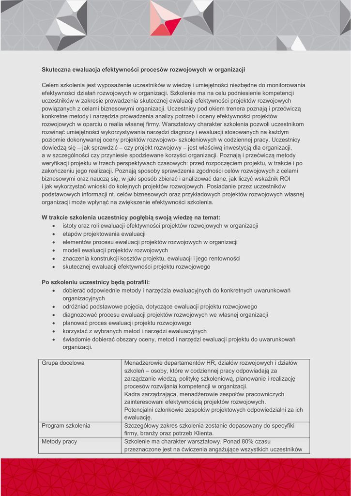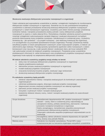 Skuteczna ewaluacja efektywności procesów rozwojowych w organizacji Celem szkolenia jest wyposażenie uczestników w wiedzę i umiejętności niezbędne do monitorowania efektywności działań rozwojowych w organizacji. Szkolenie ma na celu podniesienie kompetencji uczestników w zakresie prowadzenia skutecznej ewaluacji efektywności projektów rozwojowych powiązanych z celami biznesowymi organizacji. Uczestnicy pod okiem trenera poznają i przećwiczą konkretne metody i narzędzia prowadzenia analizy potrzeb i oceny efektywności projektów rozwojowych w oparciu o realia własnej firmy. Warsztatowy charakter szkolenia pozwoli uczestnikom rozwinąć umiejętności wykorzystywania narzędzi diagnozy i ewaluacji stosowanych na każdym poziomie dokonywanej oceny projektów rozwojowo- szkoleniowych w codziennej pracy. Uczestnicy dowiedzą się – jak sprawdzić – czy projekt rozwojowy – jest właściwą inwestycją dla organizacji, a w szczególności czy przyniesie spodziewane korzyści organizacji. Poznają i przećwiczą metody weryfikacji projektu w trzech perspektywach czasowych: przed rozpoczęciem projektu, w trakcie i po zakończeniu jego realizacji. Poznają sposoby sprawdzenia zgodności celów rozwojowych z celami biznesowymi oraz nauczą się, w jaki sposób zbierać i analizować dane, jak liczyć wskaźnik ROI i jak wykorzystać wnioski do kolejnych projektów rozwojowych. Posiadanie przez uczestników podstawowych informacji nt. celów biznesowych oraz przykładowych projektów rozwojowych własnej organizacji może wpłynąć na zwiększenie efektywności szkolenia. W trakcie szkolenia uczestnicy pogłębią swoją wiedzę na temat: istoty oraz roli ewaluacji efektywności projektów rozwojowych w organizacji etapów projektowania ewaluacji elementów procesu ewaluacji projektów rozwojowych w organizacji modeli ewaluacji projektów rozwojowych znaczenia konstrukcji kosztów projektu, ewaluacji i jego rentowności skutecznej ewaluacji efektywności projektu rozwojowego Po szkoleniu uczestnicy będą potrafili: dobierać odpowiednie metody i narzędzia ewaluacyjnych do konkretnych uwarunkowań organizacyjnych odróżniać podstawowe pojęcia, dotyczące ewaluacji projektu rozwojowego diagnozować procesu ewaluacji projektów rozwojowych we własnej organizacji planować proces ewaluacji projektu rozwojowego korzystać z wybranych metod i narzędzi ewaluacyjnych świadomie dobierać obszary oceny, metod i narzędzi ewaluacji projektu do uwarunkowań organizacji. Grupa docelowa Program szkolenia Metody pracy Menadżerowie departamentów HR, działów rozwojowych i działów szkoleń – osoby, które w codziennej pracy odpowiadają za zarządzanie wiedzą, politykę szkoleniową, planowanie i realizację procesów rozwijania kompetencji w organizacji. Kadra zarządzająca, menadżerowie zespołów pracowniczych zainteresowani efektywnością projektów rozwojowych. Potencjalni członkowie zespołów projektowych odpowiedzialni za ich ewaluację. Szczegółowy zakres szkolenia zostanie dopasowany do specyfiki firmy, branży oraz potrzeb Klienta. Szkolenie ma charakter warsztatowy. Ponad 80% czasu przeznaczone jest na ćwiczenia angażujące wszystkich uczestników Charakter szkolenia Czas trwania Materiały szkoleniowe Miejsce realizacji szkolenia Raport poszkoleniowy Wsparcie szkoleniowe w celu wypracowania i przećwiczenia konkretnych umiejętności. W trakcie szkolenia odwołujemy się do zasad efektywnego uczenia się dorosłych. Wykorzystane zostaną następujące techniki: burza mózgów, ćwiczenia indywidualne i grupowe, testy, gry symulacyjne, analizy casestudy, psychodrama. Otwarte lub wewnętrzne realizowane w grupie od 4-16 osób lub według indywidualnych ustaleń. Od 2 do 6 dni. Każdy z modułów szkoleniowych trwa 45 minut. Szkolenie odbywa się w godzinach 9-17 lub w uzgodnionych indywidualnie z Klientem. Materiały szkoleniowe są uzupełnieniem do materiału omawianego w trakcie szkolenia. Uczestnicy otrzymują je w formie drukowanej. W siedzibie Klienta lub w miejscu przez niego wskazanym. Po realizacji szkolenia przygotowywany jest raport zawierający podsumowanie szkolenia, najważniejsze wnioski, rekomendacje dotyczące działań na przyszłość. W ciągi jednego miesiąca po szkoleniu służymy wsparciem. Zapraszamy do kontaktu, zadawania pytania odnośnie zagadnień realizowanych na szkoleniu. Wyślij zapytanie, a przedstawimy Ci szkolenie dostosowane do specyfiki i potrzeb Twojej firmy! Zapraszamy do kontaktu, tel. 22/ 839 55 99 wew. 225 MCS sp. z o.o. sp. k., ul. Czerska 14, 00-732 Warszawa [email protected], www.mcs.edu.pl