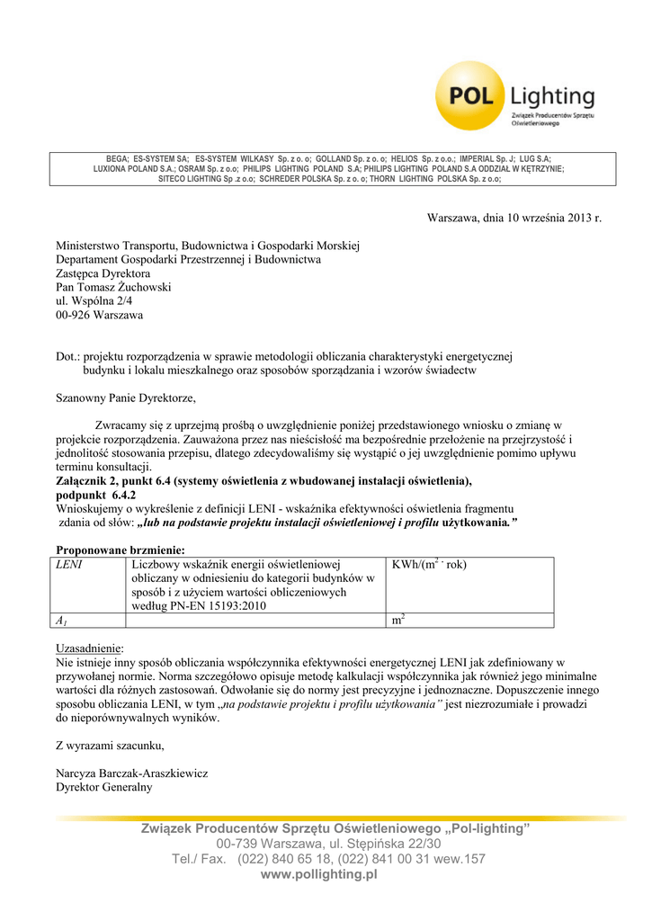 BEGA; ES-SYSTEM SA; ES-SYSTEM WILKASY Sp. z o. o; GOLLAND Sp. z o. o; HELIOS Sp. z o.o.; IMPERIAL Sp. J; LUG S.A; LUXIONA POLAND S.A.; OSRAM Sp. z o.o; PHILIPS LIGHTING POLAND S.A; PHILIPS LIGHTING POLAND S.A ODDZIAŁ W KĘTRZYNIE; SITECO LIGHTING Sp .z o.o; SCHREDER POLSKA Sp. z o. o; THORN LIGHTING POLSKA Sp. z o.o; Warszawa, dnia 10 września 2013 r. Ministerstwo Transportu, Budownictwa i Gospodarki Morskiej Departament Gospodarki Przestrzennej i Budownictwa Zastępca Dyrektora Pan Tomasz Żuchowski ul. Wspólna 2/4 00-926 Warszawa Dot.: projektu rozporządzenia w sprawie metodologii obliczania charakterystyki energetycznej budynku i lokalu mieszkalnego oraz sposobów sporządzania i wzorów świadectw Szanowny Panie Dyrektorze, Zwracamy się z uprzejmą prośbą o uwzględnienie poniżej przedstawionego wniosku o zmianę w projekcie rozporządzenia. Zauważona przez nas nieścisłość ma bezpośrednie przełożenie na przejrzystość i jednolitość stosowania przepisu, dlatego zdecydowaliśmy się wystąpić o jej uwzględnienie pomimo upływu terminu konsultacji. Załącznik 2, punkt 6.4 (systemy oświetlenia z wbudowanej instalacji oświetlenia), podpunkt 6.4.2 Wnioskujemy o wykreślenie z definicji LENI - wskaźnika efektywności oświetlenia fragmentu zdania od słów: „lub na podstawie projektu instalacji oświetleniowej i profilu użytkowania.” Proponowane brzmienie: LENI Liczbowy wskaźnik energii oświetleniowej obliczany w odniesieniu do kategorii budynków w sposób i z użyciem wartości obliczeniowych według PN-EN 15193:2010 A1 KWh/(m2 . rok) m2 Uzasadnienie: Nie istnieje inny sposób obliczania współczynnika efektywności energetycznej LENI jak zdefiniowany w przywołanej normie. Norma szczegółowo opisuje metodę kalkulacji współczynnika jak również jego minimalne wartości dla różnych zastosowań. Odwołanie się do normy jest precyzyjne i jednoznaczne. Dopuszczenie innego sposobu obliczania LENI, w tym „na podstawie projektu i profilu użytkowania” jest niezrozumiałe i prowadzi do nieporównywalnych wyników. Z wyrazami szacunku, Narcyza Barczak-Araszkiewicz Dyrektor Generalny Związek Producentów Sprzętu Oświetleniowego „Pol-lighting” 00-739 Warszawa, ul. Stępińska 22/30 Tel./ Fax. (022) 840 65 18, (022) 841 00 31 wew.157 www.pollighting.pl