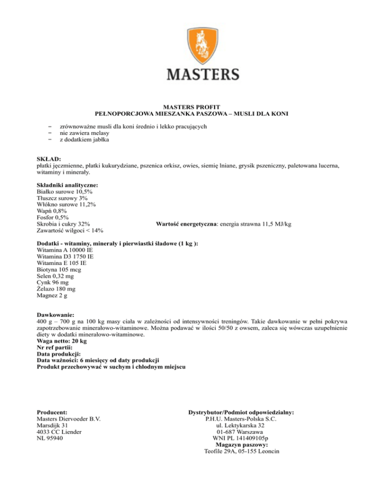 MASTERS PROFIT PEŁNOPORCJOWA MIESZANKA PASZOWA – MUSLI DLA KONI − − − zrównoważne musli dla koni średnio i lekko pracujących nie zawiera melasy z dodatkiem jabłka SKŁAD: płatki jęczmienne, płatki kukurydziane, pszenica orkisz, owies, siemię lniane, grysik pszeniczny, paletowana lucerna, witaminy i minerały. Składniki analityczne: Białko surowe 10,5% Tłuszcz surowy 3% Włókno surowe 11,2% Wapń 0,8% Fosfor 0,5% Skrobia i cukry 32% Zawartość wilgoci < 14% Wartość energetyczna: energia strawna 11,5 MJ/kg Dodatki - witaminy, minerały i pierwiastki śladowe (1 kg ): Witamina A 10000 IE Witamina D3 1750 IE Witamina E 105 IE Biotyna 105 mcg Selen 0,32 mg Cynk 96 mg Żelazo 180 mg Magnez 2 g Dawkowanie: 400 g – 700 g na 100 kg masy ciała w zależności od intensywności treningów. Takie dawkowanie w pełni pokrywa zapotrzebowanie minerałowo-witaminowe. Można podawać w ilości 50/50 z owsem, zaleca się wówczas uzupełnienie diety w dodatki minerałowo-witaminowe. Waga netto: 20 kg Nr ref partii: Data produkcji: Data ważności: 6 miesięcy od daty produkcji Produkt przechowywać w suchym i chłodnym miejscu Producent: Masters Diervoeder B.V. Marsdijk 31 4033 CC Liender NL 95940 Dystrybutor/Podmiot odpowiedzialny: P.H.U. Masters-Polska S.C. ul. Lektykarska 32 01-687 Warszawa WNI PL 141409105p Magazyn paszowy: Teofile 29A, 05-155 Leoncin