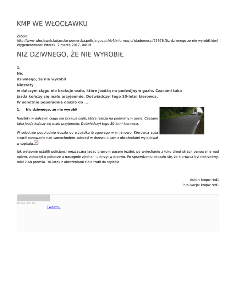 KMP WE WŁOCŁAWKU Źródło: http://www.wloclawek.kujawsko-pomorska.policja.gov.pl/kb4/informacje/wiadomosci/25976,Niz-dziwnego-ze-nie-wyrobil.html Wygenerowano: Wtorek, 7 marca 2017, 04:19 NIZ DZIWNEGO, ŻE NIE WYROBIŁ 1. Nic dziwnego, że nie wyrobił Niestety w dalszym ciągu nie brakuje osób, które jeżdżą na podwójnym gazie. Czasami taka jazda kończy się mało przyjemnie. Doświadczył tego 30-letni kierowca. W sobotnie popołudnie doszło do ... 1. Nic dziwnego, że nie wyrobił Niestety w dalszym ciągu nie brakuje osób, które jeżdżą na podwójnym gazie. Czasami taka jazda kończy się mało przyjemnie. Doświadczył tego 30-letni kierowca. W sobotnie popołudnie doszło do wypadku drogowego w m.Janowo. Kierowca auta stracił panowanie nad samochodem, uderzył w drzewo a sam z obrażeniami wylądował w szpitalu. Jak wstępnie ustalili policjanci mężczyzna jadąc prawym pasem jezdni, po wyjechaniu z łuku drogi stracił panowanie nad oplem, zahaczył o pobocze a następnie zjechał i uderzył w drzewo. Po sprawdzeniu okazało się, że kierowca był nietrzeźwy, miał 2,68 promila. 30-latek z obrażeniami ciała trafił do szpitala. Autor: kmpw.red1 Publikacja: kmpw.red1 Ocena: 0/5 (0) Tweetnij