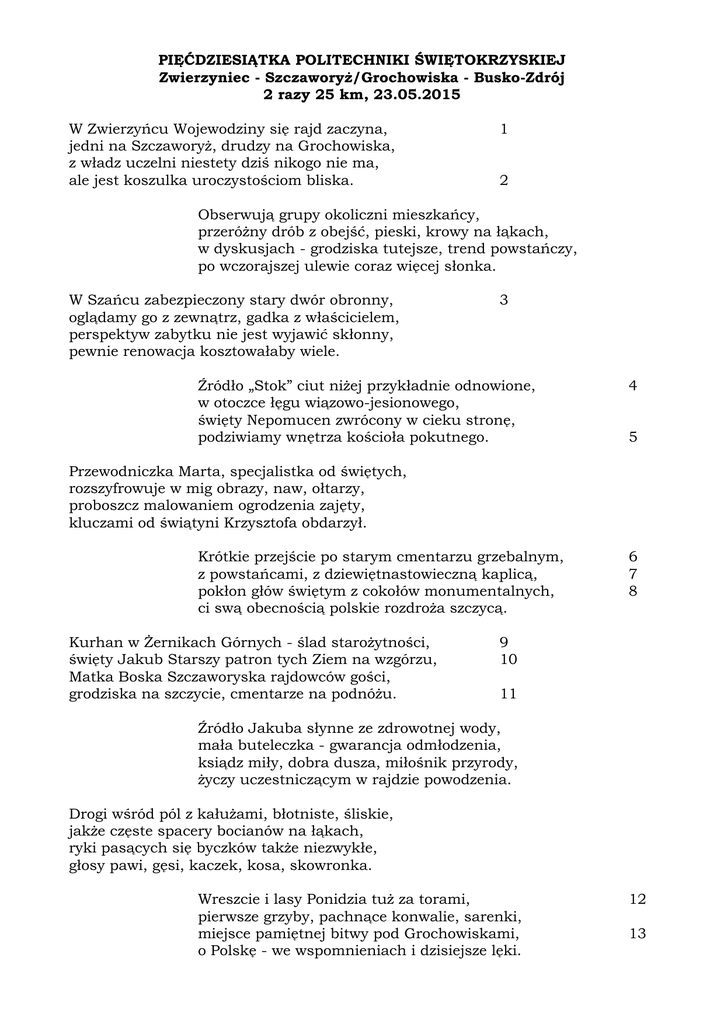 PIĘĆDZIESIĄTKA POLITECHNIKI ŚWIĘTOKRZYSKIEJ Zwierzyniec - Szczaworyż/Grochowiska - Busko-Zdrój 2 razy 25 km, 23.05.2015 W Zwierzyńcu Wojewodziny się rajd zaczyna, jedni na Szczaworyż, drudzy na Grochowiska, z władz uczelni niestety dziś nikogo nie ma, ale jest koszulka uroczystościom bliska. 1 2 Obserwują grupy okoliczni mieszkańcy, przeróżny drób z obejść, pieski, krowy na łąkach, w dyskusjach - grodziska tutejsze, trend powstańczy, po wczorajszej ulewie coraz więcej słonka. W Szańcu zabezpieczony stary dwór obronny, oglądamy go z zewnątrz, gadka z właścicielem, perspektyw zabytku nie jest wyjawić skłonny, pewnie renowacja kosztowałaby wiele. 3 Źródło „Stok” ciut niżej przykładnie odnowione, w otoczce łęgu wiązowo-jesionowego, święty Nepomucen zwrócony w cieku stronę, podziwiamy wnętrza kościoła pokutnego. 4 5 Przewodniczka Marta, specjalistka od świętych, rozszyfrowuje w mig obrazy, naw, ołtarzy, proboszcz malowaniem ogrodzenia zajęty, kluczami od świątyni Krzysztofa obdarzył. Krótkie przejście po starym cmentarzu grzebalnym, z powstańcami, z dziewiętnastowieczną kaplicą, pokłon głów świętym z cokołów monumentalnych, ci swą obecnością polskie rozdroża szczycą. Kurhan w Żernikach Górnych - ślad starożytności, święty Jakub Starszy patron tych Ziem na wzgórzu, Matka Boska Szczaworyska rajdowców gości, grodziska na szczycie, cmentarze na podnóżu. 6 7 8 9 10 11 Źródło Jakuba słynne ze zdrowotnej wody, mała buteleczka - gwarancja odmłodzenia, ksiądz miły, dobra dusza, miłośnik przyrody, życzy uczestniczącym w rajdzie powodzenia. Drogi wśród pól z kałużami, błotniste, śliskie, jakże częste spacery bocianów na łąkach, ryki pasących się byczków także niezwykłe, głosy pawi, gęsi, kaczek, kosa, skowronka. Wreszcie i lasy Ponidzia tuż za torami, pierwsze grzyby, pachnące konwalie, sarenki, miejsce pamiętnej bitwy pod Grochowiskami, o Polskę - we wspomnieniach i dzisiejsze lęki. 12 13 W ariańskich Pęczelicach ślad zboru-spichlerza, obok Ostra Góra, szczyt Garbu Wójczańskiego, grupa na Busko-Zdrój wśród treli ptasich zmierza, mały rezerwat typu słonoroślowego. 14 15 16 Ujęcia wody pitnej, nowoczesny kościół, wśród sadów eleganckie wille, pałacyki, jesteś w przeuroczym kurorcie polskim gościu, zdrów się stajesz od miejsca tego poetyki. Dróg rowerowych dużo po miasta obrzeżach, pamiątkowe zdjęcie obok „Sosny Wełeckiej”, ta sosna niezwykłość Kielecczyzny poszerza, choć kradzież spod niej piachu działanie zdradzieckie. 18 Maki Siesławickie kłaniają się rajdowcom, w karę boską (Karabosy) nie za bardzo ci młodsi wierzą stację końcową kolei trawsko zarosło, wkrótce park buskiego uzdrowiska za miedzą. Cichy Park Zdrojowy, Sanatorium „Marconi”, kawy w kubku do picia na wynos nie dają, wiata przed świętą Anną od deszczu nas chroni, Belona, Byczą Górę - nasi podziwiają. 19 20 21 22 23 W aurze parkowej nastrojowa muzyka, od „Marconiego”, grajków, restauracyjek, przy deptaku Dersław, Leszek Biały nas wita, w tym kurorcie z dala od problemów się żyje. Przy świętym Leonardzie grób twórcy kurortu, kościół farny z odnowionym murem jak nowy, budynek klasztorny przykładem dyskomfortu, czas na zabawę w Zwierzyńcu, Krzysiek gotowy ! 17 24 25 26 27 Ognisko furczy, kiełbaska, chlebek się praży, Piotrek uruchamia nastrojową muzykę, o kolejnej „Pięćdziesiątce” cicho się marzy, tańce, śpiewy, wspomnienia - doznania obfite. Renacie już uszedł stres, Krzyśkowi ból nogi, dyskoteka w obiekcie Nadleśnictwa żywa, „Setka” dziś dokumentowana - w pół drogi, AKTK, Politechnika, Goście - WIWAT !!! 28 Kielce, 25. maja 2015 r. Stanisław Janusz Komorowski „Roch”. Przewodnik Świętokrzyski PTTK PRZYPISY 1. Zwierzyniec k. Buska, rodzinny dom p. Bożentyny Pałki- Koruba, Wojewodziny. 2. Koszulka okolicznościowa Złazu (czerwona), z napisami żółtymi upamiętniającymi 50-lecie Politechniki Świętokrzyskiej (1965-2015), wydana uczestnikom rajdu. 3. Zabezpieczony stary dwór obronny z kamienia szanieckiego, z lat 1580/1609, fundacji Padniewskich, po 1815 r. opustoszony, teraz w rękach prywatnych, nazwany „Murowaniec”. 4. Atrakcja Szańca, ciekawa architektura czynnego od wieków źródełka (mury, alejki, drzewa, roślinność, tablica edukacyjna, Towarzystwo Miłośników Szańca, 2014). 5. Kościół p.w. Wniebowzięcia NMP z 1499, ufundował Krzesław z Kurozwęk, w ołtarzu bocznym obraz św. Stanisława Franciszka Smuglewicza, zegar słoneczny z XVI, napisy pamiątkowe i epitafijne. 6/7.Kaplica cmentarna z prochami właścicieli Szańca z roku 1876. Na cmentarzu prochy powstańców styczniowych z 1863. 8. Pomniki przydrożne w Szańcu z końca XIX w., na cokołach podobizny św. Nepomucena, św. Floriana, św. Judy Tadeusza. 9. Mogiła-kurhan sprzed 3,5 tys. lat, z epoki brązu, ślady kultury trzcinieckiej, ceramika sznurowa w Żernikach Górnych. 10. Kościół p.w. św. Jakuba Starszego w Szczaworyżu z 1630 r., w ołtarzu głównym MB Szczaworyska z XVI w. z zasuwą z wizerunkiem św. Jakuba Starszego. 11. Wczesnośredniowieczne grodzisko w kształcie trapezu do czasu włączenia Małopolski do Polski Piastowskiej. 12. Linia kolejowa Kielce - Busko-Zdrój powstała w 1954 r., w 2004 r. wstrzymano przewozy pasażerskie z uwagi na małe jej obciążenie. Były plany przedłużenia jej do Żabna, nic z nich nie wyszło. Nadal funkcjonuje dla przewozów towarowych. 13. Jedna z najkrwawszych bitew Powstania Styczniowego, 18.03.1863, Marian Langiewicz wsparty żuawami śmierci Francoisa de Rochebrune przeciw Czengeremu, dowódcy wojsk rosyjskich. Na miejscu pamiętny krzyż i kamień ufundowany przez PTTK. 14. Resztki zboru Stanisława Gnoińskiego w Pęczelicach z 1579 r., zamienionego później na spichlerz. Źródło u podnóża figury św. Floriana, początek strumienia Strugi. 15. S