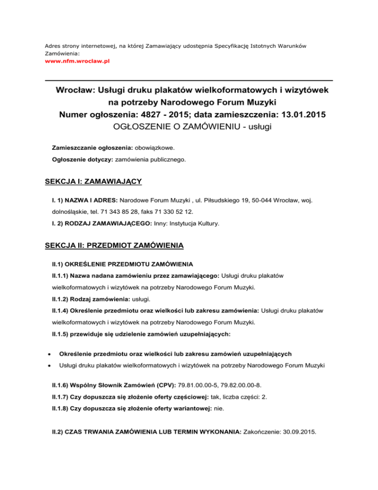 Adres strony internetowej, na której Zamawiający udostępnia Specyfikację Istotnych Warunków Zamówienia: www.nfm.wroclaw.pl Wrocław: Usługi druku plakatów wielkoformatowych i wizytówek na potrzeby Narodowego Forum Muzyki Numer ogłoszenia: 4827 - 2015; data zamieszczenia: 13.01.2015 OGŁOSZENIE O ZAMÓWIENIU - usługi Zamieszczanie ogłoszenia: obowiązkowe. Ogłoszenie dotyczy: zamówienia publicznego. SEKCJA I: ZAMAWIAJĄCY I. 1) NAZWA I ADRES: Narodowe Forum Muzyki , ul. Piłsudskiego 19, 50-044 Wrocław, woj. dolnośląskie, tel. 71 343 85 28, faks 71 330 52 12. I. 2) RODZAJ ZAMAWIAJĄCEGO: Inny: Instytucja Kultury. SEKCJA II: PRZEDMIOT ZAMÓWIENIA II.1) OKREŚLENIE PRZEDMIOTU ZAMÓWIENIA II.1.1) Nazwa nadana zamówieniu przez zamawiającego: Usługi druku plakatów wielkoformatowych i wizytówek na potrzeby Narodowego Forum Muzyki. II.1.2) Rodzaj zamówienia: usługi. II.1.4) Określenie przedmiotu oraz wielkości lub zakresu zamówienia: Usługi druku plakatów wielkoformatowych i wizytówek na potrzeby Narodowego Forum Muzyki. II.1.5) przewiduje się udzielenie zamówień uzupełniających: Określenie przedmiotu oraz wielkości lub zakresu zamówień uzupełniających Usługi druku plakatów wielkoformatowych i wizytówek na potrzeby Narodowego Forum Muzyki II.1.6) Wspólny Słownik Zamówień (CPV): 79.81.00.00-5, 79.82.00.00-8. II.1.7) Czy dopuszcza się złożenie oferty częściowej: tak, liczba części: 2. II.1.8) Czy dopuszcza się złożenie oferty wariantowej: nie. II.2) CZAS TRWANIA ZAMÓWIENIA LUB TERMIN WYKONANIA: Zakończenie: 30.09.2015. SEKCJA III: INFORMACJE O CHARAKTERZE PRAWNYM, EKONOMICZNYM, FINANSOWYM I TECHNICZNYM III.2) ZALICZKI III.3) WARUNKI UDZIAŁU W POSTĘPOWANIU ORAZ OPIS SPOSOBU DOKONYWANIA OCENY SPEŁNIANIA TYCH WARUNKÓW III. 3.1) Uprawnienia do wykonywania określonej działalności lub czynności, jeżeli przepisy prawa nakładają obowiązek ich posiadania Opis sposobu dokonywania oceny spełniania tego warunku o Zamawiający nie stawia szczególnych wymagań w zakresie spełniania tego warunku. Wykonawca spełni ten warunek poprzez złożenie oświadczenia o spełnianiu warunków udziału w postępowaniu zgodnie z przepisem art. 22 ust. 1 ustawy Pzp. III.3.2) Wiedza i doświadczenie Opis sposobu dokonywania oceny spełniania tego warunku o dla zadania nr 1: Wykonawca winien w ciągu ostatnich trzech lat, a jeżeli okres prowadzenia działalności jest krótszy - w tym okresie, wykonać lub wykonywać z należytą starannością, co najmniej 3 usługi zróżnicowanego druku i produkcji wizytówek odpowiadających swoim rodzajem usłudze stanowiącej przedmiot niniejszego zamówienia. Przez usługę zróżnicowanego druku i produkcji wizytówek odpowiadającą swoim rodzajem usłudze stanowiącej przedmiot niniejszego zamówienia należy rozumieć usługę spełniającą łącznie następujące warunki: druk cyfrowy oraz sitodruk na papierach ozdobnych, wraz z lakierowaniem o wartości nie mniejszej niż 300 zł brutto każda usługa dla zadania nr 2: Wykonawca winien w ciągu ostatnich trzech lat, a jeżeli okres prowadzenia działalności jest krótszy - w tym okresie, wykonać lub wykonywać z należytą starannością, co najmniej 3 usługi druku solwentowego odpowiadających swoim rodzajem usłudze stanowiącej przedmiot niniejszego zamówienia. Przez usługę druku solwentowego odpowiadającą swoim rodzajem usłudze stanowiącej przedmiot niniejszego zamówienia należy rozumieć usługę spełniającą łącznie następujące warunki: druk solwentowy plakatów wielkoformatowych do ekspozycji zewnętrznej o wartości nie mniejszej niż 500 zł brutto każda usługa. Na potwierdzenie spełnienia powyższego warunku należy złożyć wykaz usług zgodnie ze wzorem określonym w treści załącznika nr 6 do SIWZ (odpowiednio dla każdego zadania oddzielnie). Do wykazu wykonanych lub wykonywanych usług należy dołączyć dokumenty potwierdzające że usługi zostały wykonane lub są wykonywane należycie, tzn. poświadczenia, które powinny być wydane nie wcześniej niż na 3 miesiące przed upływem terminu składania ofert lub oświadczenia wykonawcy - jeżeli z uzasadnionych przyczyn o obiektywnym charakterze wykonawca nie jest w stanie uzyskać poświadczenia. III.3.3) Potencjał techniczny Opis sposobu dokonywania oceny spełniania tego warunku o Zamawiający nie stawia szczególnych wymagań w zakresie spełniania tego warunku. Wykonawca spełni ten warunek poprzez złożenie oświadczenia o spełnianiu warunków udziału w postępowaniu zgodnie z przepisem art. 22 ust. 1 ustawy Pzp. III.3.4) Osoby zdolne do wykonania zamówienia Opis sposobu dokonywania oceny spełniania tego warunku o Zamawiający nie stawia szczególnych wymagań w zakresie spełniania tego warunku. Wykonawca spełni ten warunek poprzez złożenie oświadczenia o spełnianiu warunków udziału w postępowaniu zgodnie z przepisem art. 22 ust. 1 ustawy Pzp. III.3.5) Sytuacja ekonomiczna i finansowa Opis sposobu dokonywania oceny spełniania tego warunku o Zamawiający nie stawia szczególnych wymagań w zakresie spełniania tego warunku. Wykonawca spełni ten warunek poprzez złożenie oświadczenia o spełnianiu warunków udziału w postępowaniu zgodnie z przepisem art. 22 ust. 1 ustawy Pzp. III.4) INFORMACJA O OŚWIADCZENIACH LUB DOKUMENTACH, JAKIE MAJĄ DOSTARCZYĆ WYKONAWCY W CELU POTWIERDZENIA SPEŁNIANIA WARUNKÓW UDZIAŁU W POSTĘPOWANIU ORAZ NIEPODLEGANIA WYKLUCZENIU NA PODSTAWIE ART. 24 UST. 1 USTAWY III.4.1) W zakresie wykazania spełniania przez wykonawcę warunków, o których mowa w art. 22 ust. 1 ustawy, oprócz oświadczenia o spełnianiu warunków udziału w postępowaniu należy przedłożyć: wykaz wykonanych, a w przypadku świadczeń okresowych lub ciągłych również wykonywanych, głównych dostaw lub usług, w okresie ostatnich trzech lat przed upływem terminu składania ofert albo wniosków o dopuszczenie do udziału w postępowani