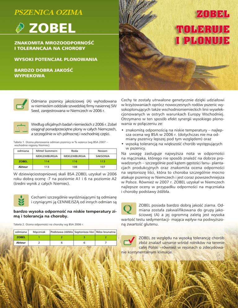 PSZENICA OZIMA ZOBEL ZNAKOMITA MROZOODPORNOŚĆ I TOLERANCAJA NA CHOROBY WYSOKI POTENCJAŁ PLONOWANIA BARDZO DOBRA JAKOŚĆ WYPIEKOWA Odmiana pszenicy jakościowej (A) wyhodowana w niemieckim oddziale szwedzkiej firmy nasiennej SW Seed, zarejestrowana w Niemczech w 2006 r. Według oficjalnych badań niemieckich z 2006 r. Zobel osiągnął ponadprzeciętne plony w całych Niemczech, a szczególnie w ich północnej i wschodniej części. Tabela 1. Ocena plonowania odmian pszenicy w % wzorca (wg BSA 2007 – wschodnie regiony Niemiec). odmiana Mittel Sommern Roda Nossen MEKLEMBURGIA MEKLEMBURGIA SAKSONIA ZOBEL 114 116 113 Akteur 113 108 107 W dziewięciostopniowej skali BSA ZOBEL uzyskał w 2006 roku dobrą ocenę -7 na poziomie A1 i 6 na poziomie A2 (średni wynik z całych Niemiec). Cechami szczególnie wyróżniającymi tą odmianę i czyniącymi ją CENNIEJSZĄ od innych odmian są bardzo wysoka odporność na niskie temperatury zimą i tolerancja na choroby. Tabela 2. Ocena odporności na choroby wg BSA 2006 r. odmiana Mączniak ZOBEL 1 2 3 2 Akteur 2 6 6 7 Cechy te zostały utrwalone genetycznie dzięki udziałowi w krzyżowaniach oprócz nowoczesnych rodów pszenic wysokoplonujących także wschodnioniemieckich linii wyselekcjonowanych w ostrych warunkach Europy Wschodniej. Otrzymano w ten sposób efekt synergii wysokiego plonowania w połączeniu ze: • znakomitą odpornością na niskie temperatury – najlepsza ocena wg BSA w 2006 r. (dotychczas nie ma odmiany pszenicy lepszej pod tym względem) oraz • wysoką tolerancją na większość chorób występujących w pszenicy. Na uwagę zasługuje najwyższa nota w odporności na mączniaka, którego nie sposób znaleźć na dobrze prowadzonych – szczególnie pod kątem gęstości łanu- plantacjach produkcyjnych oraz znakomita ocena odporności na septoriozę liści, która to choroba szczególnie mocno atakuje pszenicę w Niemczech i jest coraz powszechniejsza w Polsce. Również w 2007 r. ZOBEL uzyskał w Niemczech najlepsze oceny w przypadku odporności na mączniaka i choroby podstawy źdźbła. ZOBEL posiada bardzo dobrą jakość ziarna. Odmiana została zakwalifikowana do grupy jakościowej (A) a jej ogromną zaletą jest wysoka wartość testu sedymentacji- mająca wpływ na podwyższoną zwartość glutenu. Podstawa źdźbła Septorioza liści Rdza brunatna ZOBEL ze względu na wysoką tolerancję chorób zbóż znalazł uznanie wśród rolników na terenie całej Polski –również w rejonach o zdecydowanie kontynentalnym klimacie.