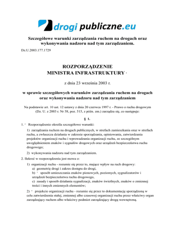 Szczegółowe warunki zarządzania ruchem na drogach oraz wykonywania nadzoru nad tym zarządzaniem. Dz.U.2003.177.1729 ROZPORZĄDZENIE MINISTRA INFRASTRUKTURY 1 z dnia 23 września 2003 r. w sprawie szczegółowych warunków zarządzania ruchem na drogach oraz wykonywania nadzoru nad tym zarządzaniem Na podstawie art. 10 ust. 12 ustawy z dnia 20 czerwca 1997 r. - Prawo o ruchu drogowym (Dz. U. z 2003 r. Nr 58, poz. 515, z późn. zm.) zarządza się, co następuje: § 1. 1. 2 Rozporządzenie określa szczegółowe warunki: 1) zarządzania ruchem na drogach publicznych, w strefach zamieszkania oraz w strefach ruchu, a zwłaszcza działania w zakresie sporządzania, opiniowania, zatwierdzania projektów organizacji ruchu i wprowadzania organizacji ruchu, ze szczególnym uwzględnieniem znaków i sygnałów drogowych oraz urządzeń bezpieczeństwa ruchu drogowego; 2) wykonywania nadzoru nad tym zarządzaniem. 2. Ilekroć w rozporządzeniu jest mowa o: 1) organizacji ruchu - rozumie się przez to, mające wpływ na ruch drogowy: a) geometrię drogi i zakres dostępu do drogi, b) 3 sposób umieszczania znaków pionowych, poziomych, sygnalizatorów i urządzeń bezpieczeństwa ruchu drogowego, c) zasady i sposób działania sygnalizacji, znaków świetlnych, znaków o zmiennej treści i innych zmiennych elementów; 2) 4 projekcie organizacji ruchu - rozumie się przez to dokumentację sporządzoną w celu zatwierdzenia stałej, zmiennej albo czasowej organizacji ruchu przez właściwy organ zarządzający ruchem albo właściwy podmiot zarządzający drogą wewnętrzną. § 2. 1. Działania w zakresie zarządzania ruchem realizowane są przez: 1) podejmowanie czynności organizacyjno-technicznych, w szczególności: a) sporządzanie projektów organizacji ruchu, b) przedstawianie projektów organizacji ruchu do zatwierdzenia, c) rozpatrywanie projektów organizacji ruchu, d) zatwierdzanie organizacji ruchu, e) przekazywanie zatwierdzonej organizacji ruchu do realizacji, f) nadzór nad zgodnością istniejącej organizacji ruchu z zatwierdzoną organizacją ruchu, g) nadzór i analizę istniejącej organizacji ruchu w zakresie bezpieczeństwa ruchu i jego efektywności, h) nadzór nad zarządzaniem ruchem; 2) obsługę systemów sterowania ruchem, sterowanie ruchem za pomocą znaków świetlnych, znaków o zmiennej treści i innych zmiennych elementów; 3) wprowadzanie tymczasowych zakazów lub ograniczeń w ruchu w przypadku zdarzeń, w wyniku których może nastąpić zagrożenie bezpieczeństwa ruchu drogowego. 1a. 5 Projekt stałej albo zmiennej organizacji ruchu sporządza się przed wszczęciem postępowania w sprawie wydania decyzji o zezwoleniu na realizację inwestycji drogowej, decyzji o pozwoleniu na budowę albo przed zgłoszeniem wykonywania robót budowlanych. 2. 6 Działania, o których mowa w ust. 1, realizują, odpowiednio do kompetencji, organ zarządzający ruchem, podmiot zarządzający drogą wewnętrzną, zarząd drogi, organ sprawujący nadzór nad zarządzaniem ruchem, Policja, Żandarmeria Wojskowa lub wojskowe organy porządkowe. 3. Działania, o których mowa w ust. 1 pkt 1 lit. a i b, mogą być realizowane przez jednostki inne niż wymienione w ust. 2. § 3. 1. Organ zarządzający ruchem w szczególności: 1) rozpatruje projekty organizacji ruchu oraz wnioski dotyczące zmian organizacji ruchu; 2) opracowuje lub zleca do opracowania projekty organizacji ruchu uwzględniające wnioski wynikające z przeprowadzonych analiz organizacji i bezpieczeństwa ruchu; 3) 7 zatwierdza organizacje ruchu na podstawie złożonych projektów organizacji ruchu; 4) przekazuje zatwierdzone organizacje ruchu do realizacji; 5) przechowuje projekty organizacji ruchu i prowadzi ich ewidencję; 6) opiniuje geometrię drogi w projektach budowlanych; 7) 8 prowadzi kontrolę prawidłowości zastosowania i funkcjonowania znaków drogowych, urządzeń sygnalizacji świetlnej i urządzeń bezpieczeństwa ruchu drogowego oraz ich zgodności z zatwierdzoną organizacją ruchu; 8) 9 współpracuje w zakresie organizacji ruchu i jego bezpieczeństwa z innymi organami zarządzającymi ruchem, podmiotami zarządzającymi drogami wewnętrznymi, zarządami dróg i zarządcami infrastruktury kolejowej, Policją oraz innymi jednostkami. 1a. 10 Podmiot zarządzający drogą wewnętrzną: 1) rozpatruje projekty organizacji ruchu oraz wnioski dotyczące zmian organizacji ruchu; 2) opracowuje lub zleca do opracowania projekty organizacji ruchu uwzględniające wnioski wynikające z przeprowadzonych analiz organizacji i bezpieczeństwa ruchu; 3) zatwierdza organizacje ruchu na podstawie złożonych projektów organizacji ruchu; 4) przekazuje zatwierdzone organizacje ruchu do realizacji; 5) przechowuje projekty organizacji ruchu; 6) prowadzi kontrolę prawidłowości zastosowania i funkcjonowania znaków drogowych, urządzeń sygnalizacji świetlnej i urządzeń bezpieczeństwa ruchu drogowego oraz ich zgodności z zatwierdzoną organizacją ruchu; 7) współpracuje w zakresie organizacji ruchu i jego bezpieczeństwa z innymi podmiotami zarządzającymi drogą wewnętrzną, organami zarządzającymi ruchem, zarządami dróg i zarządcami infrastruktury kolejowej, Policją oraz innymi jednostkami. 2. Organ sprawujący nadzór nad zarządzaniem ruchem: 1) dokonuje oceny organizacji ruchu w zakresie: a) zgodności z obowiązującymi przepisami, b) bezpieczeństwa ruchu drogowego; 2) rozstrzyga w sprawach spornych dotyczących istniejącej lub projektowanej organizacji ruchu, biorąc pod uwagę interes ogólnospołeczny oraz konieczność zapewnienia ruchu tranzytowego. 3. 11 W przypadku drogi wewnętrznej objętej strefą zamieszkania albo strefą ruchu organ sprawujący nadzór nad zarządzaniem ruchem podejmuje, na podstawie wniosku zainteresowanego podmiotu złożonego do tego organu, działania w zakresie określonym w ust. 2 pkt 1. § 4. 1. 12 Podstawą do wprowadzenia organizacji ruchu na nowo wybudowane
