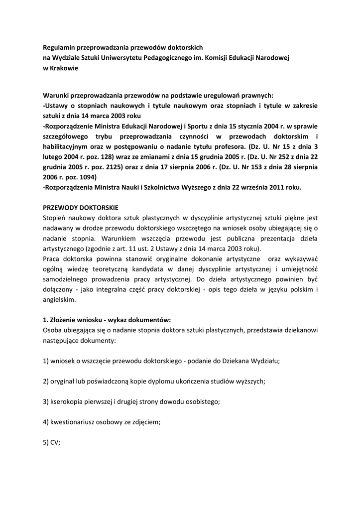 Regulamin przeprowadzania przewodów doktorskich na Wydziale Sztuki Uniwersytetu Pedagogicznego im. Komisji Edukacji Narodowej w Krakowie Warunki przeprowadzania przewodów na podstawie uregulowań prawnych: -Ustawy o stopniach naukowych i tytule naukowym oraz stopniach i tytule w zakresie sztuki z dnia 14 marca 2003 roku -Rozporządzenie Ministra Edukacji Narodowej i Sportu z dnia 15 stycznia 2004 r. w sprawie szczegółowego trybu przeprowadzania czynności w przewodach doktorskim i habilitacyjnym oraz w postępowaniu o nadanie tytułu profesora. (Dz. U. Nr 15 z dnia 3 lutego 2004 r. poz. 128) wraz ze zmianami z dnia 15 grudnia 2005 r. (Dz. U. Nr 252 z dnia 22 grudnia 2005 r. poz. 2125) oraz z dnia 17 sierpnia 2006 r. (Dz. U. Nr 153 z dnia 28 sierpnia 2006 r. poz. 1094) -Rozporządzenia Ministra Nauki i Szkolnictwa Wyższego z dnia 22 września 2011 roku. PRZEWODY DOKTORSKIE Stopień naukowy doktora sztuk plastycznych w dyscyplinie artystycznej sztuki piękne jest nadawany w drodze przewodu doktorskiego wszczętego na wniosek osoby ubiegającej się o nadanie stopnia. Warunkiem wszczęcia przewodu jest publiczna prezentacja dzieła artystycznego (zgodnie z art. 11 ust. 2 Ustawy z dnia 14 marca 2003 roku). Praca doktorska powinna stanowić oryginalne dokonanie artystyczne oraz wykazywać ogólną wiedzę teoretyczną kandydata w danej dyscyplinie artystycznej i umiejętność samodzielnego prowadzenia pracy artystycznej. Do dzieła artystycznego powinien być dołączony - jako integralna część pracy doktorskiej - opis tego dzieła w języku polskim i angielskim. 1. Złożenie wniosku - wykaz dokumentów: Osoba ubiegająca się o nadanie stopnia doktora sztuki plastycznych, przedstawia dziekanowi następujące dokumenty: 1) wniosek o wszczęcie przewodu doktorskiego - podanie do Dziekana Wydziału; 2) oryginał lub poświadczoną kopie dyplomu ukończenia studiów wyższych; 3) kserokopia pierwszej i drugiej strony dowodu osobistego; 4) kwestionariusz osobowy ze zdjęciem; 5) CV; 6) proponowany tytuł i koncepcję rozprawy doktorskiej, propozycję osoby promotora, dyscypliny dodatkowej oraz języka nowożytnego; 7) życiorys artystyczny oraz dokumentację zawierającą wykaz dokonań twórczych, prac zawodowych, dorobku artystycznego wraz z odpowiednim zapisem dzieł artystycznych i dokumentacją ich publicznej prezentacji (w formie portfolio oraz w formie cyfrowej) oraz informację o działalności popularyzującej sztukę; 8) informację o przebiegu przewodu doktorskiego, jeżeli kandydat ubiegał się uprzednio o nadanie stopnia doktora w tej samej dyscyplinie; 9) dla kandydatów spoza Wydziału Sztuki UP - pismo o zapewnieniu pokrycia kosztów związanych z przewodem doktorskim. Kandydat może wraz z wnioskiem o wszczęcie przewodu doktorskiego przedstawić: 1) certyfikat potwierdzający znajomość nowożytnego języka obcego; 2) ewentualnie wykaz nadanych medali i odznaczeń wraz z datami nadania, wykaz posiadanych nagród i wyróżnień za działalność artystyczną. Tryb przeprowadzania przewodu doktorskiego - zarys postępowania Wniosek o wszczęcie przewodu doktorskiego musi być wstępnie zaopiniowany przez Radę Katedry reprezentującą dyscyplinę artystyczną, w której ma być realizowany przewód. W posiedzeniu Rady Katedry powinien uczestniczyć kandydat. Przewód doktorski przeprowadza i stopień doktora nadaje Rada Wydziału Sztuki. Czynności przewodu doktorskiego kończą się uchwałami Rady Wydziału w przedmiocie: - wszczęcia przewodu doktorskiego - powołania promotora; - powołania recenzentów; - przyjęcia rozprawy doktorskiej i dopuszczenia jej do publicznej obrony; - przyjęcia publicznej obrony rozprawy doktorskiej; - nadania stopnia doktora. I posiedzenie Rady Wydziału Rozpatrzenie wniosku o wszczęcie przewodu doktorskiego Wniosek o wszczęcie postępowania doktorskiego jest rozpatrywany na posiedzeniu Rady Wydziału, nie później niż dwa miesiące od jego złożenia. Następuje odczytanie wniosku kandydata oraz jego życiorysu artystycznego, zapoznanie z tematem i koncepcją pracy doktorskiej oraz osoby proponowanej na promotora. Dyskusja z udziałem kandydata. Rada Wydziału Sztuki podejmuje (w głosowaniu tajnym) uchwały o: - wszczęciu przewodu doktorskiego; - zatwierdzeniu tematu i koncepcji rozprawy doktorskiej (głosowanie jawne); - wyznaczeniu promotora; - powołaniu recenzentów. Powołanie recenzentów Rada Wydziału Sztuki na wniosek Dziekana powołuje (w oddzielnych głosowaniach tajnych) co najmniej dwóch recenzentów przedłożonej rozprawy doktorskiej. Recenzentem może być osoba posiadająca tytuł naukowy profesora lub stopień naukowy doktora habilitowanego. Recenzentem w przewodzie doktorskim nie może być osoba, w stosunku do której zachodzą uzasadnione wątpliwości co do jej bezstronności. Rada Wydziału powołuje 2 recenzentów spośród osób zatrudnionych w szkole wyższej lub jednostce organizacyjnej innej niż ta, w której pracownikiem jest osoba ubiegająca się o nadanie stopnia doktora i niebędących członkami rady jednostki organizacyjnej przeprowadzającej przewód. Rada Wydziału Sztuki może również podjąć uchwałę o odrzuceniu wniosku. Wówczas przewodniczący Rady Wydziału zawiadamia pisemnie kandydata o decyzji i jej przyczynach. Poszczególne czynności przewodu doktorskiego kończą się uchwałami Rady Wydziału, przy czym są podejmowane w głosowaniu tajnym i zapadają bezwzględną większością głosów przy obecności przynajmniej 50% ogólnej liczby osób uprawnionych do głosowania. Do głosowania są uprawnieni członkowie Rady Wydziału posiadający tytuł naukowy profesora lub stopień naukowy doktora habilitowanego posiadający prawo głosu, opiekun naukowy kandydata, a w dalszych czynnościach również recenzenci. Powołanie komisji egzaminacyjnej i egzaminy doktorskie Rada Wydziału powołuje (w głosowaniu tajnym) komisję egzaminacyjną do przeprowadzenia egzaminów z dyscyp
