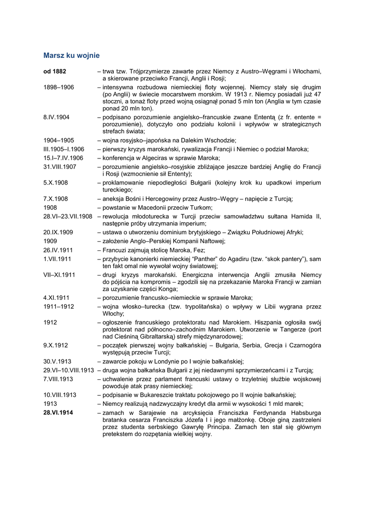 Marsz ku wojnie – trwa tzw. Trójprzymierze zawarte przez Niemcy z Austro–Węgrami i Włochami, a skierowane przeciwko Francji, Anglii i Rosji; 1898–1906 – intensywna rozbudowa niemieckiej floty wojennej. Niemcy stały się drugim (po Anglii) w świecie mocarstwem morskim. W 1913 r. Niemcy posiadali już 47 stoczni, a tonaż floty przed wojną osiągnął ponad 5 mln ton (Anglia w tym czasie ponad 20 mln ton). 8.IV.1904 – podpisano porozumienie angielsko–francuskie zwane Ententą (z fr. entente = porozumienie), dotyczyło ono podziału kolonii i wpływów w strategicznych strefach świata; 1904–1905 – wojna rosyjsko–japońska na Dalekim Wschodzie; III.1905–I.1906 – pierwszy kryzys marokański, rywalizacja Francji i Niemiec o podział Maroka; 15.I–7.IV.1906 – konferencja w Algeciras w sprawie Maroka; 31.VIII.1907 – porozumienie angielsko–rosyjskie zbliżające jeszcze bardziej Anglię do Francji i Rosji (wzmocnienie sił Ententy); 5.X.1908 – proklamowanie niepodległości Bułgarii (kolejny krok ku upadkowi imperium tureckiego; 7.X.1908 – aneksja Bośni i Hercegowiny przez Austro–Węgry – napięcie z Turcją; 1908 – powstanie w Macedonii przeciw Turkom; 28.VI–23.VII.1908 – rewolucja młodoturecka w Turcji przeciw samowładztwu sułtana Hamida II, następnie próby utrzymania imperium; 20.IX.1909 – ustawa o utworzeniu dominium brytyjskiego – Związku Południowej Afryki; 1909 – założenie Anglo–Perskiej Kompanii Naftowej; 26.IV.1911 – Francuzi zajmują stolicę Maroka, Fez; 1.VII.1911 – przybycie kanonierki niemieckiej “Panther” do Agadiru (tzw. “skok pantery”), sam ten fakt omal nie wywołał wojny światowej; VII–XI.1911 – drugi kryzys marokański. Energiczna interwencja Anglii zmusiła Niemcy do pójścia na kompromis – zgodzili się na przekazanie Maroka Francji w zamian za uzyskanie części Konga; 4.XI.1911 – porozumienie francusko–niemieckie w sprawie Maroka; 1911–1912 – wojna włosko–turecka (tzw. trypolitańska) o wpływy w Libii wygrana przez Włochy; 1912 – ogłoszenie francuskiego protektoratu nad Marokiem. Hiszpania ogłosiła swój protektorat nad północno–zachodnim Marokiem. Utworzenie w Tangerze (port nad Cieśniną Gibraltarską) strefy międzynarodowej; 9.X.1912 – początek pierwszej wojny bałkańskiej – Bułgaria, Serbia, Grecja i Czarnogóra występują przeciw Turcji; 30.V.1913 – zawarcie pokoju w Londynie po I wojnie bałkańskiej; 29.VI–10.VIII.1913 – druga wojna bałkańska Bułgarii z jej niedawnymi sprzymierzeńcami i z Turcją; 7.VIII.1913 – uchwalenie przez parlament francuski ustawy o trzyletniej służbie wojskowej powoduje atak prasy niemieckiej; 10.VIII.1913 – podpisanie w Bukareszcie traktatu pokojowego po II wojnie bałkańskiej; 1913 – Niemcy realizują nadzwyczajny kredyt dla armii w wysokości 1 mld marek; 28.VI.1914 – zamach w Sarajewie na arcyksięcia Franciszka Ferdynanda Habsburga bratanka cesarza Franciszka Józefa I i jego małżonkę. Oboje giną zastrzeleni przez studenta serbskiego Gawryłę Principa. Zamach ten stał się głównym pretekstem do rozpętania wielkiej wojny. od 1882