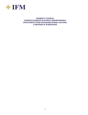 PROJEKTY UCHWAŁ NADZWYCZAJNEGO WALNEGO ZGROMADZENIA INVESTMENT FUND MANAGERS SPÓŁKA AKCYJNA Z SIEDZIBĄ W WARSZAWIE 1 UCHWAŁA NR 1 Nadzwyczajnego Walnego Zgromadzenia Akcjonariuszy Investment Fund Managers S.A. z siedzibą w Warszawie, Al. Ujazdowskie 41 z dnia 05 stycznia 2017 roku w sprawie: wyboru Przewodniczącego Walnego Zgromadzenia Stosownie do art. 409 § 1 Kodeksu spó łek handlowych oraz § 28 ust. 1 Statutu Spó łki uchwala się co następuje: §1 Na Przewodniczącego Nadzwyczajnego Walnego Zgromadzenia wybiera się Pana/Panią §2 Uchwała wchodzi w ż ycie z chwilą jej podjęcia. UCHWAŁA NR 2 Nadzwyczajnego Walnego Zgromadzenia Akcjonariuszy Investment Fund Managers S.A. z siedzibą w Warszawie, Al. Ujazdowskie 41 z dnia 05 stycznia 2017 roku w sprawie: przyjęcia porządku obrad Nadzwyczajnego Walnego Zgromadzenia Nadzwyczajne Walne Zgromadzenie uchwala co następuje: §1 Przyjmuje się następujący porządek obrad, ustalony i ogłoszony przez Zarząd Spó łki w ogłoszeniu o zwołaniu Nadzwyczajnego Walnego Zgromadzenia, zamieszczonym na stronie internetowej Spó łki w dniu oraz opublikowany raportem bież ącym nr w dniu _______________ 2016 roku. 1. Otwarcie obrad Zgromadzenia. 2. Wybór Przewodniczącego Zgromadzenia. 3. Stwierdzenie prawidłowości zwołania podejmowania uchwał. 4. Przyjęcie porządku obrad Zgromadzenia. 2 Zgromadzenia i jego zdolności do 5. Podjęcie uchwały w sprawie powołania Pana Janusza Wyląg na członka Rady Nadzorczej IFM S.A. 6. Podjęcie uchwały w sprawie powołania Pana Jacka Mitrockiego (Mitrocki) na członka Rady Nadzorczej IFM S.A. 7. Podjęcie uchwały w przedmiocie zmiany statutu Spółki poprzez zmianę firmy Spółki z Investment Fund Managers Spółka Akcyjna na IFM Global Funds Spółka Akcyjna (zmiana Artykułu 1 statutu Spółki) i upoważnienia Rady Nadzorczej Spółki do ustalenia tekstu jednolitego statutu. 8. Zamknięcie obrad. §2 Uchwała wchodzi w życie z chwilą jej podjęcia. UCHWAŁA NR 3 Nadzwyczajnego Walnego Zgromadzenia Akcjonariuszy Investment Fund Managers S.A. z siedzibą w Warszawie, Al. Ujazdowskie 41 z dnia 05 stycznia 2017 roku w sprawie: powołania Pana Janusza Wyląg, PESEL 81020816419 na członka Rady Nadzorczej Działając na podstawie art. 385 § 1 Kodeksu spółek handlowych oraz Artykułu 16 ust. 1 i ust. 2 Statutu Spółki, wobec złożonej przez Pana Łukasza Krause dnia 08 grudnia 2016 r. rezygnacji oraz złożonej przez Pana Jacka Jawień dnia 08 grudnia 2016 r. rezygnacji, uchwala się, co następuje: §1 Nadzwyczajne Walne Zgromadzenie powołuje Pana Janusza Wyląg, PESEL 81020816419, na członka Rady Nadzorczej Investment Fund Managers S.A. §2 Uchwała wchodzi w życie z chwilą jej podjęcia. 3 UCHWAŁA NR 4 Nadzwyczajnego Walnego Zgromadzenia Akcjonariuszy Investment Fund Managers S.A. z siedzibą w Warszawie, Al. Ujazdowskie 41 z dnia 05 stycznia 2017 roku w sprawie: powołania Pana Jacka Mitrockiego (Mitrocki), PESEL 49070303215 na członka Rady Nadzorczej Działając na podstawie art. 385 § 1 Kodeksu spółek handlowych oraz Artykułu 16 ust. 1 i ust. 2 Statutu Spółki, wobec złożonej przez Pana Łukasza Krause dnia 08 grudnia 2016 r. rezygnacji oraz złożonej przez Pana Jacka Jawień dnia 08 grudnia 2016 r. rezygnacji, uchwala się, co następuje: §1 Nadzwyczajne Walne Zgromadzenie powołuje Pana Jacka Mitrockiego, PESEL 49070303215, na członka Rady Nadzorczej Investment Fund Managers S.A. §2 Uchwała wchodzi w życie z chwilą jej podjęcia. 4 UCHWAŁA NR 5 Nadzwyczajnego Walnego Zgromadzenia Akcjonariuszy Investment Fund Managers S.A. z siedzibą w Warszawie, Al. Ujazdowskie 41 z dnia 05 stycznia 2017 roku w sprawie: zmiany statutu Spółki poprzez zmianę firmy Spółki Działając na podstawie art. 430 § 1 i 5 Kodeksu spółek handlowych oraz na podstawie Artykułu 26 ust. 2 lit. a. statutu Spółki, uchwala się, co następuje: §1 Nadzwyczajne Walne Zgromadzenie postanawia zmienić statut Spółki w ten sposób, że Artykuł 1 statutu Spółki otrzymuje nowe następujące brzmienie: „Artykuł 1 1. Spółka będzie działać pod firmą: IFM Global Funds Spółka Akcyjna. 2. Spółka może używać w obrocie skrótu firmy: IFM Global Funds S.A. §2 Wobec powyż szych zmian, Nadzwyczajne Walne Zgromadzenie, na podstawie art. 430 par. 5 Kodeksu Spó łek Handlowych, upoważ nia Radę Nadzorczą do ustalenia tekstu jednolitego Statutu Spó łki. §3 Uchwała wchodzi w ż ycie w zakresie § 1 z dniem rejestracji, zaś w zakresie § 2 z chwilą podjęcia. 5
