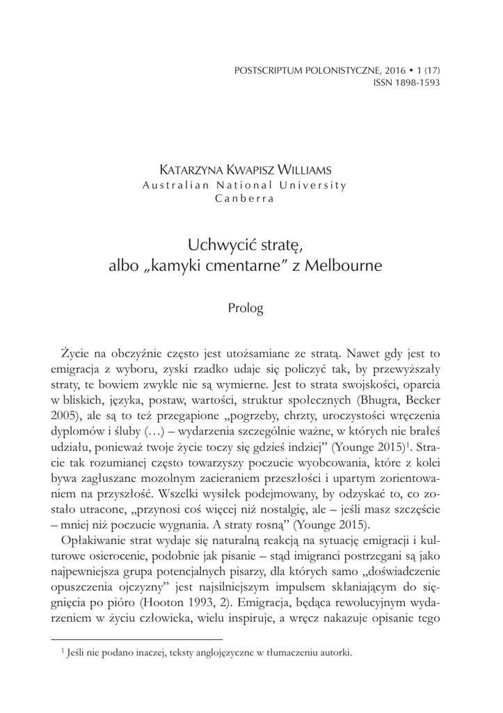 POSTSCRIPTUM POLONISTYCZNE, 2016 • 1 (17) ISSN 1898-1593 KATARZYNA KWAPISZ WILLIAMS Australian National University Canberra Uchwyci strat!, albo „kamyki cmentarne” z Melbourne Prolog ycie na obczy!nie cz"sto jest uto#samiane ze strat$. Nawet gdy jest to emigracja z wyboru, zyski rzadko udaje si" policzy% tak, by przewy#sza&y straty, te bowiem zwykle nie s$ wymierne. Jest to strata swojsko'ci, oparcia w bliskich, j"zyka, postaw, warto'ci, struktur spo&ecznych (Bhugra, Becker 2005), ale s$ to te# przegapione „pogrzeby, chrzty, uroczysto'ci wr"czenia dyplomów i 'luby (…) – wydarzenia szczególnie wa#ne, w których nie bra&e' udzia&u, poniewa# twoje #ycie toczy si" gdzie' indziej” (Younge 2015)1. Stracie tak rozumianej cz"sto towarzyszy poczucie wyobcowania, które z kolei bywa zag&uszane mozolnym zacieraniem przesz&o'ci i upartym zorientowaniem na przysz&o'%. Wszelki wysi&ek podejmowany, by odzyska% to, co zosta&o utracone, „przynosi co' wi"cej ni# nostalgi", ale – je'li masz szcz"'cie – mniej ni# poczucie wygnania. A straty rosn$” (Younge 2015). Op&akiwanie strat wydaje si" naturaln$ reakcj$ na sytuacj" emigracji i kulturowe osierocenie, podobnie jak pisanie – st$d imigranci postrzegani s$ jako najpewniejsza grupa potencjalnych pisarzy, dla których samo „do'wiadczenie opuszczenia ojczyzny” jest najsilniejszym impulsem sk&aniaj$cym do si"gni"cia po pióro (Hooton 1993, 2). Emigracja, b"d$ca rewolucyjnym wydarzeniem w #yciu cz&owieka, wielu inspiruje, a wr"cz nakazuje opisanie tego 1 Je'li nie podano inaczej, teksty angloj"zyczne w t&umaczeniu autorki. 82 POSTSCRIPTUM POLONISTYCZNE, 2016 • 1 (17) specyficznego do'wiadczenia (Hooton 1993, 2), jak sugeruje bowiem Hanna Gosk, pisanie, czyli snucie narracji migracyjnej, mo#e pomóc dokona% „»przek&adu« adaptacyjnego tego, co obce, na to, co oswojone” (Gosk 2012, 7). Wed&ug Ma&gorzaty Zduniak-Wiktorowicz opowie'ci migracyjne s$ praktykami w&a'ciwymi „dla sytuacji opresji, a zatem gorszo'ci, inno'ci, s&abo'ci” (Zduniak-Wiktorowicz 2012, 230). To w&a'nie strata i brak wydaj$ si" okre'la% pisarstwo emigracyjne w Australii, cz"sto postrzegane jednowymiarowo jako rozpami"tywanie straty – ludzi, domu i rzeczy pozostawionych „w tyle” (Gunew 1994; Ommundsen 2004). Chocia# polityka wielokulturowo'ci lat siedemdziesi$tych zach"ci&a do tworzenia oraz publikowania w j"zykach innych ni# angielski, po pocz$tkowym zainteresowaniu autorami – emigrantami, a wr"cz przekonaniu, #e ich twórczo'% jest „po#$dana i modna” (Hatzimanolis 1996), pojawi&o si" zw$tpienie w'ród krytyków, recenzentów oraz wydawców. Zainteresowanie etniczno'ci$ zacz"&o by% postrzegane jako manifestacja politycznej poprawno'ci (Louwerse 2007), a literatury mniejszo'ciowe, etniczne zosta&y zepchni"te na do'% szeroki margines prac niezas&uguj$cych na uwag". Dlatego teksty te cz"sto charakteryzuje pewnego rodzaju „bezpa(sko'%” oraz rozproszenie; niemal#e same w sobie uosabiaj$ strat" i najcz"'ciej same przepadaj$. Wraz z nimi znika pami"% o autorach, chocia#, jak przewrotnie pisali John Berger oraz Jean Mohr, emigranci nie umieraj$, s$ „nie'miertelni, poniewa# nieprzerwanie wymienni” (Berger, Mohr 2010). Niewielu jest takich, którzy swoj$ w&asn$ prac" i twórczo'% skupiaj$ ca&kowicie na odzyskiwaniu takiej w&a'nie pami"ci, na próbie pochwycenia straty i jej analizie. Jedn$ z takich osób jest Bogumi&a ongo&&owicz, Mi&ka, s&upszczanka, która od 1991 roku mieszka i tworzy w Australii. Ratuje teksty od zniszczenia, ich autorów od zapomnienia, bierze w obron" zdyskredytowane poj"cie straty jako tematu twórczo'ci, usprawiedliwia jej rozpami"tywanie na obczy!nie i op&akuje t" najbole'niejsz$ – strat" #ycia. Jej zainteresowania koncentruj$ si" wokó& losów Polaków w Australii po II wojnie 'wiatowej. Wie o nich wszystko, ale szuka dalej. Odszukuje 'lady ich #ycia i pracy, opisuje ich losy, redaguje ich nieznane i ma&o znane teksty, upomina si" o ich pami"%, przywraca ich przesz&o'%, gwarantuje im przysz&o'%. Jest otwarta i energiczna, hojna i opieku(cza, ale potrafi te# by% w'cibska i zawzi"ta, wr"cz natr"tna. Jak t&umaczy, musi taka by%. Czasem si" #ali, cz"sto g&o'no si" 'mieje. Lubi pisa%, dba o s&owa, ma przecie# bardzo wa#n$ misj" do spe&nienia. Taka jest, trzeba podkre'li%, jako cz&owiek i jednocze'nie autor biografii, prac redakcyjnych i kilku tomików poezji. I cho% nie wida% tego w samych KATARZYNA KWAPISZ WILLIAMS: Uchwyci strat!, albo „kamyki cmentarne” z Melbourne 83 wierszach, jej postawa jest istotna, bo wyp&ywa z kategorii centralnej w kontek'cie przywo&ywanych tu tekstów, których bezwzgl"dn$ autonomi" odrzucam. Chodzi o do'wiadczenie, które, jak pisze Nycz, „dochodzi do g&osu (…) w literaturze, a nast"pnie aktywizuje si" w lekturze”, poniewa# ani autor, ani odbiorca nie pozostaj$ zdystansowanymi obserwatorami (2007, 41). I cho% Nycz, podobnie jak inni badacze traktuj$cy kategori" do'wiadczenia jako istotn$, nie odwo&uje si" do #adnej konkretnej sytuacji, mówi$c raczej o empirii w ogóle, mo#na na potrzeby niniejszych rozwa#a( za&o#y%, #e do'wiadczenie emigracji i refleksja nad nim stanowi do'% specyficzny przyk&ad „dookolnej zewn"trzno'ci” (Nycz 2007, 41) przenikaj$cej #ycie i twórczo'% omawianej tu autorki oraz pisarzy-emigrantów, których pami"% ratuje. Jest to równie# kategoria kszta&tuj$ca odbiór tekstów. Nie zabiegam jednak o rekonstrukcj" autorskiego punktu widzenia w celu odczytania znaczenia tekstu, nie jest te# moim celem powrót do pozytywistycznych przekona( literaturoznawczych, wr"cz przeciwnie. W swoim podej'ciu odwo&uj" si" do antropologicznego rozumienia tekstu, dzi"ki któremu „literatura przestaje oznacza% zjawisko poddaj$ce si" interpretacji jedynie w kategoriach literaturoznawczych” (Zambrzycka 2011), i które umo#liwia otwarcie na „co' wi"cej w literaturze ni# sama literatura” (Czaplik-Lity(ska 2007, 27). Podobnie jako odbiorca nie czytam tekstów autorki z pozycji
