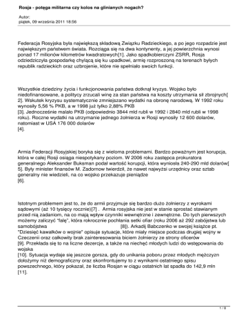 Rosja - potęga militarna czy kolos na glinianych nogach? Autor: piątek, 09 września 2011 18:56 Federacja Rosyjska była największą składową Związku Radzieckiego, a po jego rozpadzie jest największym państwem świata. Rozciąga się na dwa kontynenty, a jej powierzchnia wynosi ponad 17 milionów kilometrów kwadratowych[1]. Jako spadkobierczyni ZSRR, Rosja odziedziczyła gospodarkę chylącą się ku upadkowi, armię rozproszoną na terenach byłych republik radzieckich oraz uzbrojenie, które nie spełniało swoich funkcji. Wszystkie dziedziny życia i funkcjonowania państwa dotknął kryzys. Wojsko było niedofinansowane, a politycy zrzucali winę za stan państwa na koszty utrzymania sił zbrojnych[ 2]. Wskutek kryzysu systematycznie zmniejszano wydatki na obronę narodową. W 1992 roku wynosiły 5,56 % PKB, a w 1998 już tylko 2,88% PKB [3]. Jednocześnie malało PKB (odpowiednio 3844 mld rubli w 1992 i 2840 mld rubli w 1998 roku). Roczne wydatki na utrzymanie jednego żołnierza w Rosji wynosiły 12 600 dolarów, natomiast w USA 176 000 dolarów [4]. Armia Federacji Rosyjskiej boryka się z wieloma problemami. Bardzo poważnym jest korupcja, która w całej Rosji osiąga niespotykany poziom. W 2006 roku zastępca prokuratora generalnego Aleksander Buksman podał wartość korupcji, która wyniosła 240-290 mld dolarów[ 5]. Były minister finansów M. Zadornow twierdził, że nawet najwyżsi urzędnicy oraz sztab generalny nie wiedzieli, na co wojsko przekazuje pieniądze [6]. Istotnym problemem jest to, że do armii przyjmuje się bardzo dużo żołnierzy z wyrokami sądowymi (aż 10 tysięcy rocznie)[7] . Armia rosyjska nie jest w stanie sprostać stawianym przed nią zadaniom, na co mają wpływ czynniki wewnętrzne i zewnętrzne. Do tych pierwszych możemy zaliczyć “falę”, która rokrocznie pochłania setki ofiar (roku 2006 aż 292 zabójstwa lub samobójstwa [8]). Arkadij Babczenko w swojej książce pt. "Dziesięć kawałków o wojnie" opisuje sytuacje, które miały miejsce podczas drugiej wojny w Czeczenii oraz całkowity brak zainteresowania biciem żołnierzy ze strony oficerów [9]. Przekłada się to na liczne dezercje, a także na niechęć młodych ludzi do wstępowania do wojska [10]. Sytuacja wydaje się jeszcze gorsza, gdy do unikania poboru przez młodych mężczyzn dołożymy niż demograficzny oraz skonfrontujemy to z wynikami ostatniego spisu powszechnego, który pokazał, że liczba Rosjan w ciągu ostatnich lat spadła do 142,9 mln [11]. 1/8 Rosja - potęga militarna czy kolos na glinianych nogach? Autor: piątek, 09 września 2011 18:56 Sytuacja w armii rosyjskiej przekłada się na jej gotowość bojową i zdolność do wykonywania powierzonych zadań. Konstantin Makijenko i Rusłan Puchow po wojnie w Gruzji doszli do wniosku, że tylko 20% żołnierzy jest zdolnych do wypełniania rozkazów[12]. Atak na Gruzję ukazał także słabość rosyjskiego lotnictwa. Z powodu braku samolotów, które mogłyby bombardować miasta w nocy, nocny atak nie powiódł się, a artyleria gruzińska pozostała nietknięta [13]. Dodatkowo Rosjanie podczas wojny stracili 11 samolotów. Atak ukazał także słabość łączności wojsk i koordynacji wykonywanych działań. Problemem armii są też nowe mundury, na które wydano równowartość 10 mln zł, a które nie sprawdzają się w temperaturze poniżej -25 stopni[14], która jest częsta w Rosji. Niedofinansowane są także badania nad nowymi technologiami, przez co Rosja nie jest w stanie sama produkować najnowocześniejszego uzbrojenia. Z tego powodu sprzęt kupuje od innych państw. W 2009 roku od Izraela zakupiła 12 bezzałogowych samolotów[15], a na początku 2011 roku 2 okręty desantowe “Mistral” od Francji. Umowa z Francją przewiduje współpracę obu krajów przy budowie lotniskowców, dzięki czemu Rosjanie mogą rozwinąć dostępną u nich technologię [16]. O słabości technologicznej rosyjskiego przemysłu świadczy także to, że rosyjska agencja ds. nadzoru transportu zaleciła zawieszenie lotów Tu-154b, ponieważ podejrzewa, że są one zbyt awaryjne, o czym świadczy duża liczba wypadków tych samolotów [17]. Również nowa doktryna wojenna Rosji (z 2010 roku) pośrednio zwraca uwagę na to, że siły konwencjonalne nie byłyby w stanie bronić bezpieczeństwa państwa. W doktrynie zapisano, że "Federacja Rosyjska zastrzega sobie prawo użycia broni jądrowej w odpowiedzi na użycie wobec niej i/lub jej sojuszników broni jądrowej i innych rodzajów broni masowego rażenia, a także w przypadku agresji przeciwko Federacji Rosyjskiej z użyciem broni konwencjonalnej, jeśli zagrożone byłoby samo istnienie państwa"[18]. Za głównego wroga uznano NATO. Rosji nie podobają się także plany budowy tarczy antyrakietowej oraz rozmieszczenia w Polsce rakiet Patriot [19]. Władze Rosji zawsze duże znaczenie przywiązywały do sił strategicznych, a ich rola wzrosła po rozpadzie ZSRR i w dalszym ciągu pełnią dużą rolę w doktrynie wojennej Federacji Rosyjskiej. Do wzrostu znaczenia broni jądrowej przyczynił się kryzys w siłach konwencjonalnych [20]. Głównymi zadaniami sił strategicznych są: ● niedopuszczenie do powstania niekorzystnej dla Rosji sytuacji geopolitycznej 2/8 Rosja - potęga militarna czy kolos na glinianych nogach? Autor: piątek, 09 września 2011 18:56 ● zapobieganie próbom wywierania na Rosję nacisku politycznego ● zapobieganie próbom wykorzystania przeciw Rosji broni jądrowej na poziomie regionalnym i globalnym ● powstrzymanie agresji przeprowadzanej siłami konwencjonalnymi[21]. Na podstawie zadań stawianych przed rosyjskimi siłami strategicznymi, można dojść do wniosku, że są one głównym gwarantem bezpieczeństwa Rosji. Nieudana interwencja w Gruzji pokazała wiele słabości sił zbrojnych Rosji i dopiero to przyczyniło się do wprowadzenia szeregu reform. W październiku 2008 roku na portalu wyborcza.pl ukazał się artyk