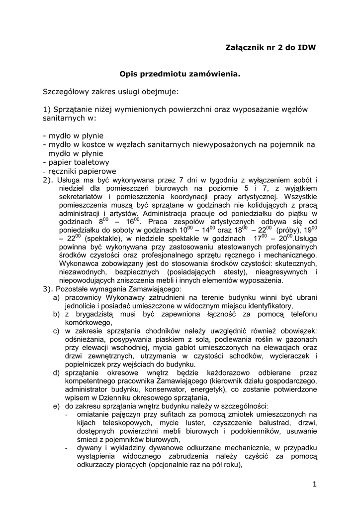 Załącznik nr 2 do IDW Opis przedmiotu zamówienia. Szczegółowy zakres usługi obejmuje: 1) Sprzątanie niŜej wymienionych powierzchni oraz wyposaŜanie węzłów sanitarnych w: - mydło w płynie - mydło w kostce w węzłach sanitarnych niewyposaŜonych na pojemnik na mydło w płynie - papier toaletowy - ręczniki papierowe 2). Usługa ma być wykonywana przez 7 dni w tygodniu z wyłączeniem sobót i niedziel dla pomieszczeń biurowych na poziomie 5 i 7, z wyjątkiem sekretariatów i pomieszczenia koordynacji pracy artystycznej. Wszystkie pomieszczenia muszą być sprzątane w godzinach nie kolidujących z pracą administracji i artystów. Administracja pracuje od poniedziałku do piątku w godzinach 800 – 1600. Praca zespołów artystycznych odbywa się od poniedziałku do soboty w godzinach 1000 – 1400 oraz 1800 – 2200 (próby), 1900 – 2200 (spektakle), w niedziele spektakle w godzinach 1700 – 2000.Usługa powinna być wykonywana przy zastosowaniu atestowanych profesjonalnych środków czystości oraz profesjonalnego sprzętu ręcznego i mechanicznego. Wykonawca zobowiązany jest do stosowania środków czystości: skutecznych, niezawodnych, bezpiecznych (posiadających atesty), nieagresywnych i niepowodujących zniszczenia mebli i innych elementów wyposaŜenia. 3). Pozostałe wymagania Zamawiającego: a) pracownicy Wykonawcy zatrudnieni na terenie budynku winni być ubrani jednolicie i posiadać umieszczone w widocznym miejscu identyfikatory, b) z brygadzistą musi być zapewniona łączność za pomocą telefonu komórkowego, c) w zakresie sprzątania chodników naleŜy uwzględnić równieŜ obowiązek: odśnieŜania, posypywania piaskiem z solą, podlewania roślin w gazonach przy elewacji wschodniej, mycia gablot umieszczonych na elewacjach oraz drzwi zewnętrznych, utrzymania w czystości schodków, wycieraczek i popielniczek przy wejściach do budynku. d) sprzątanie okresowe wnętrz będzie kaŜdorazowo odbierane przez kompetentnego pracownika Zamawiającego (kierownik działu gospodarczego, administrator budynku, konserwator, energetyk), co zostanie potwierdzone wpisem w Dzienniku okresowego sprzątania, e) do zakresu sprzątania wnętrz budynku naleŜy w szczególności: - omiatanie pajęczyn przy sufitach za pomocą zmiotek umieszczonych na kijach teleskopowych, mycie luster, czyszczenie balustrad, drzwi, dostępnych powierzchni mebli biurowych i podokienników, usuwanie śmieci z pojemników biurowych, - dywany i wykładziny dywanowe odkurzane mechanicznie, w przypadku wystąpienia widocznego zabrudzenia naleŜy czyścić za pomocą odkurzaczy piorących (opcjonalnie raz na pół roku), 1 - - - posadzki z glazury, lastriko oraz wykładziny gładkie z tworzyw sztucznych zamiatane oraz myte odpowiednimi środkami chemicznymi za pomocą ręcznych mopów, posadzki z glazury raz w roku oczyszczone mechanicznie, posadzki parkietowe konserwowane za pomocą przeznaczonych do tego środków przy kaŜdym sprzątaniu (zmywaniu wilgotnym mopem), posadzki betonowe w piwnicach czyszczone odkurzaczem przemysłowym, węzły sanitarne w garderobach i ogólnodostępne z korytarzy myte odpowiednimi środkami, pojemniki na nieczystości opróŜniane, zasobniki na papier toaletowy, ręczniki papierowe i mydło uzupełniane, w muszlach toaletowych uzupełniane kostki sanitarne. mycie drzwi przeciwpoŜarowych na poziomie 0 raz w miesiącu omiatanie ścian z osypujących się wewnętrznych tynków renowacyjnych do wys. 1m na poziomie 0 raz w miesiącu I. WYKAZ POMIESZCZEŃ DO SPRZĄTANIAW CZĘŚCI ADMINISTRACYJNEJ POZIOM 1 Lp. Nr pomieszcz. 1 123 1a 124 2 Funkcja Pow. pomieszczenia [ m2] magazyn instrumentów 27,3 Uwagi SPRZĄTANIE 1x/mc 16,8 SPRZĄTANIE 1x/mc 125 mag. instr. perkusyjnych garderoba 15,4 CODZIENNE SPRZĄTANIE 3 126 garderoba 16,2 „ 4 127 korytarz 28,2 „ 5 128 garderoba 15,7 „ 6 129 garderoba 11,5 „ 7 130 garderoba 11,1 „ 8 131 24,1 „ 9 132 klatka schodowa 3L poz. 1 garderoba 28,2 „ 10 133 korytarz 32,3 „ 11 134 przedsionek windy 8,2 „ 12 135 WC 8,5 „ 13 136 garderoba 20,5 „ 14 137 korytarz 17,3 „ 15 138 garderoba 13,4 „ 2 16 139 141 klatka schod. 4 L poz. 1 przedsionek bramy zachodniej str. lewa korytarz 21,2 „ 17 140 4,2 „ 18 22,4 „ 19 142 korytarz 9,5 „ 20 144 garderoba 33,1 „ 21 145 WC – łaźnia 20.0 „ 22 146 WC – łaźnia 20.0 „ 23 147 48,8 „ 24 148 korytarz zapadni towarowej oświetleniowcy 45.3 „ 25 149 26 151 27 „ 152 montaŜyści dekoracji - 45,5 szatnia magazyn dekoracji 124,4 dwa pom. nr 150 + 151 (46,4+77,8=124,2m2) magazyn instrumentów 63,6 28 153 korytarz 27,4 CODZIENNE SPRZĄTANIE 29 154 korytarz 8.5 „ 30 154 a 31 155 maszynownia napędów -sztankietów korytarz 8,9 SPRZĄTAJĄ PRACOWNICY OPERY CODZIENNE SPRZĄTANIE 32 155 a 33 156 maszynownia napędów -sztankietów ruchoma fosa orkiestry 109,0 SPRZĄTAJĄ PRACOWNICY OPERY CODZIENNE SPRZĄTANIE 34 156 a rampa fosy orkiestry 38,6 „ 35 157 magazyn bufetu -- SPRZĄTA NAJEMCA BUFETU 36 158 garderoba orkiestry 16,1 CODZIENNE SPRZĄTANIE 37 159 kuchnia bufetu -- SPRZĄTA NAJEMCA BUFETU 38 160 korytarz 24,0 CODZIENNE SPRZĄTANIE 39 161 pomieszczenie bufetu -- SPRZĄTA NAJEMCA BUFETU 40 161 a WC 8,4 CODZIENNE SPRZĄTANIE 41 162 wydawnictwa 5,8 „ SPRZĄTANIE 1x/mc SPRZĄTANIE 1x/mc 3 42 163 23,3 „ 164 klatka schod. 3P poz.1 korytarz 43 12,1 „ 44 165 korytarz 11,4 „ 45 166 8,9 SPRZĄTANIE 1x/mc 46 167 28,2 „ 47 168 26,0 „ 48 169 centrala telefoniczna i serwerownia biuro kontaktów z zagranicą portiernia – centrala SAP i BMS zaplecze portierni 9,7 „ 49 170 hol portierni 20,3 „ 50 171 maszynownia windy „Pilawa” -- SPRZĄTAJĄ PRACOWNICY OPERY 51 172 10,7 52 173 CODZIENNE SPRZĄTANIE „ 53 174 54 175 55 176 przedsionek wejścia dla pracowników klatka schod. 4P poz. 1 pomieszczenie techniczne akustyków pomieszczenie techniczne akustyków korytarz RAZEM POZIOM 1 : 26,5 --31,6 1.208,1 SPRZĄTAJĄ PRACOWNICY OPERY „ CODZIENNE SPRZĄ