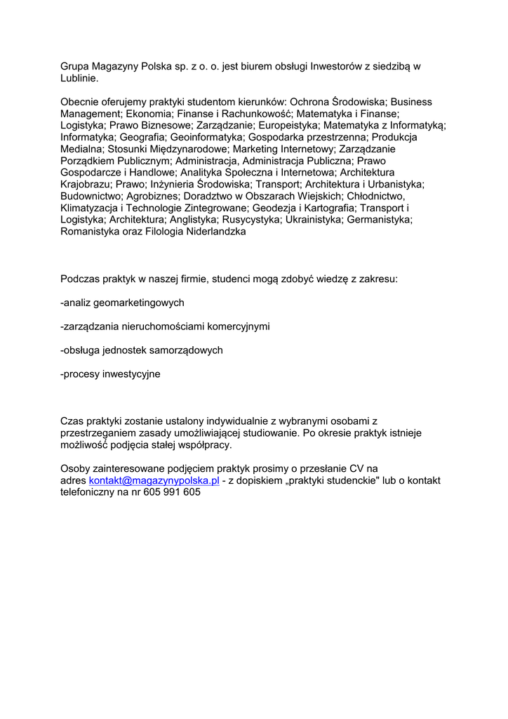 Grupa Magazyny Polska sp. z o. o. jest biurem obsługi Inwestorów z siedzibą w Lublinie. Obecnie oferujemy praktyki studentom kierunków: Ochrona Środowiska; Business Management; Ekonomia; Finanse i Rachunkowość; Matematyka i Finanse; Logistyka; Prawo Biznesowe; Zarządzanie; Europeistyka; Matematyka z Informatyką; Informatyka; Geografia; Geoinformatyka; Gospodarka przestrzenna; Produkcja Medialna; Stosunki Międzynarodowe; Marketing Internetowy; Zarządzanie Porządkiem Publicznym; Administracja, Administracja Publiczna; Prawo Gospodarcze i Handlowe; Analityka Społeczna i Internetowa; Architektura Krajobrazu; Prawo; Inżynieria Środowiska; Transport; Architektura i Urbanistyka; Budownictwo; Agrobiznes; Doradztwo w Obszarach Wiejskich; Chłodnictwo, Klimatyzacja i Technologie Zintegrowane; Geodezja i Kartografia; Transport i Logistyka; Architektura; Anglistyka; Rusycystyka; Ukrainistyka; Germanistyka; Romanistyka oraz Filologia Niderlandzka Podczas praktyk w naszej firmie, studenci mogą zdobyć wiedzę z zakresu: -analiz geomarketingowych -zarządzania nieruchomościami komercyjnymi -obsługa jednostek samorządowych -procesy inwestycyjne Czas praktyki zostanie ustalony indywidualnie z wybranymi osobami z przestrzeganiem zasady umożliwiającej studiowanie. Po okresie praktyk istnieje możliwość́ podjęcia stałej współpracy. Osoby zainteresowane podjęciem praktyk prosimy o przesłanie CV na adres [email protected] - z dopiskiem „praktyki studenckie" lub o kontakt telefoniczny na nr 605 991 605