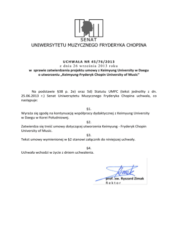 SE NA T UNIWERSYTETU MUZYCZNEGO FRYDERYKA CHOPINA UCHWAŁA NR 45/76/2013 z dnia 26 września 2013 roku w sprawie zatwierdzenia projektu umowy z Keimyung University w Daegu o utworzeniu „Keimyung-Fryderyk Chopin University of Music” Na podstawie §38 p. 2e) oraz 5d) Statutu UMFC (tekst jednolity z dn. 25.06.2013 r.) Senat Uniwersytetu Muzycznego Fryderyka Chopina uchwala, co następuje: §1. Wyraża się zgodę na kontynuację współpracy dydaktycznej z Keimyung University w Daegu w Korei Południowej. §2. Zatwierdza się treść umowy dotyczącej utworzenia Keimyung - Fryderyk Chopin University of Music. §3. Tekst umowy wymienionej w §2 stanowi załącznik do niniejszej uchwały. §4. Uchwała wchodzi w życie z dniem uchwalenia. prof. zw. Ryszard Zimak Rektor Załącznik do uchwały Senatu nr 45/76/2013 UMOWA DOT. UTWORZENIA UNIWERSYTETU MUZYCZNEGO KEIMYUNG-FRYDERYK CHOPIN: KEIMYUNG-FRYDERYK CHOPIN UNIVERSITY OF MUSIC Uniwersytet Keimyung (KMU) w Korei oraz Uniwersytet Muzyczny Fryderyka Chopina (UMFC) w Polsce zawierają porozumienie w sprawie utworzenia Keimyung-Fryderyk Chopin University of Music (KFCUM) na terenie KMU, w ramach kontynuacji poprzednich umów oraz na podstawie przyjacielskich stosunków pomiędzy obiema instytucjami. KFCUM ma na celu zapewnienie wspólnego programu edukacyjnego (zwanego dalej Programem), w ramach którego kształceni są wybitni studenci koreańscy z KMU. Dalszym celem programu jest pogłębienie wzajemnego zrozumienia kultur oraz promocja przyjaźni pomiędzy Koreą a Polską. Aby osiągnąć powyższe założenia KMU i UMFC będą ściśle współpracować i czynić wszelkie wysiłki dzieląc się swymi zasobami, celem rozwoju i polepszenia specjalnie stworzonego systemu edukacyjnego, a następnie programów nauczania. I. Nazwa Instytucja utworzona w celu prowadzenia wspólnego programu KMU i UMFC będzie nosić nazwę Keimyung-Fryderyk Chopin University of Music. II. Autonomia KFCUM KFCUM, mimo że będący częścią KMU (zwanym dalej Collegem), działa autonomicznie pod wspólnym nadzorem KMU i UMFC. III. Administratorzy KFCUM Jeden dyrektor mianowany przez KMU Dwaj zastępcy dyrektora mianowani przez UMFC Jeden koordynator mianowany przez KMU IV. Porządek otwarcia KFCUM zostanie uruchomiony na nowych zasadach z dniem 1 marca 2014 r. V. Miejsce KFCUM będzie umiejscowiony na specjalnie przygotowanym terenie KMU. 1 Załącznik do uchwały Senatu nr 45/76/2013 VI. Organizacja i administracja 6.1 Schemat Dyrektor(1) Z-ca dyrektora (2) 6.2 Opis osobisty i opis stanowisk 6.2.1 Dyrektor Dyrektor jest odpowiedzialny za administrowanie KFCUM, łącznie z rozwojem programu edukacyjnego oraz rekrutowaniem profesorów wizytujących w porozumieniu z zastępcami dyrektora oraz Collegem. 6.2.2 Zastępca dyrektora Dwaj zastępcy dyrektora są mianowani przez UMFC. Każdy z nich przebywa odpowiednio w KMU i w UMFC. W porozumieniu z dyrektorem zastępcy dyrektora rekrutują grupę profesorów wizytujących, zajmują się rozwojem programów edukacyjnych oraz występują w roli łączników pomiędzy obiema instytucjami. Zastępca dyrektora w UMFC odpowiada za administrowanie Programu w UMFC, a także sprawy studenckie studentów KFCUM. 6.2.3 Komitet Wykonawczy Komitet wykonawczy składa się z dyrektora, zastępcy dyrektora w KMU, Dziekana d/s studenckich (KMU), oraz Dziekana Biura Zagranicznego (KMU). Komitet ma za zadanie prowadzić Program i podejmować decyzje dot. odpowiednich spraw uczelnianych i studenckich w KFCUM, nie szczędząc starań w ramach wzajemnej współpracy pomiędzy obiema instytucjami. 6.2.4 Profesor wizytujący Profesorzy wizytujący, rekrutowani przez UMFC, mają za zadanie nauczać przedmiotów kierunkowych i prowadzić wykłady w każdym semestrze, a także, w razie konieczności, dwutygodniowy kurs zimowy organizowany nie wcześniej niż 10 lutego. 2 Załącznik do uchwały Senatu nr 45/76/2013 6.2.5 Artysta-stypendysta Koreańscy artyści-stypendyści są wykładowcami na część etatu, rekrutowanymi przez KMU. Do ich obowiązków należy prowadzenie zajęć przedmiotu głównego i/lub wykładów. 6.2.6 Koordynator UMFC Koordynator może być mianowany przez KMU. Zapewnia on pomoc i wsparcie studentom KFCUM dot. spraw ogólnouczelnianych w UMFC. VII. Przyjęcie i transfer Studenci KFCUM są wybierani spośród studentów już zakwalifikowanych i przyjętych do College’u. Przy przyjęciu College promuje KFCUM celem zachęcenia studentów do uczestnictwa w Programie. 7.1 Po pomyślnym ukończeniu 7. semestru w KMU i spełnieniu wymagań dot. przyjęcia na UMFC, studenci są przenoszeni (przyjęci bez egzaminów wstępnych) na 3. Rok studiów licencjackich w UMFC. Studenci KFCUM są studentami KMU i może być od nich wymagane uczęszczanie na dwumiesięczny intensywny kurs języka polskiego, studenci muszą także dostać się na 8. semestr w KMU przed rozpoczęciem studiów licencjackich w Polsce. 7.2 Podczas 3. roku studiów licencjackich w UMFC studenci powinni uczestniczyć w zajęciach wg planu UMFC oraz kontynuować naukę języka polskiego. 7.3 Studenci zaakceptowani i przyjęci na 3. rok studiów licencjackich w UMFC muszą wykonać 20-minutową prezentację utworu w zapisie nutowym w grudniu przed komisją składającą się z wykładowców polskich i koreańskich, która będzie nagrana. Nagranie przesłane zostanie do KMU i może ono zastąpić egzamin licencjacki w College’u . 7.4 Podczas studiów w KMU, studenci KFCUM przygotowują pracę w języku koreańskim lub angielskim. Wspomniana praca ma być przetłumaczona na język polski w konsultacji z polskim promotorem celem sprostania standardom UMFC. 7.5 Studenci KFCUM w UMFC mają podchodzić do egzaminu licencjackiego w czerwcu, tj. w końcu roku akademickiego. 7.6 : Po zaliczeniu egzaminu licencjackiego studenci przyjmowani są na studia magisterskie bez dodatkowych egzaminów wstępnych na podstawie postanowienia Senatu UMFC. VIII. Edukacja wt KMU 8.1 Prze