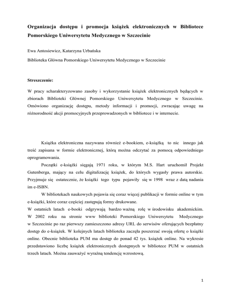 Organizacja dostępu i promocja książek elektronicznych w Bibliotece Pomorskiego Uniwersytetu Medycznego w Szczecinie Ewa Antosiewicz, Katarzyna Urbańska Biblioteka Główna Pomorskiego Uniwersytetu Medycznego w Szczecinie Streszczenie: W pracy scharakteryzowano zasoby i wykorzystanie książek elektronicznych będących w zbiorach Biblioteki Głównej Pomorskiego Uniwersytetu Medycznego w Szczecinie. Omówiono organizację dostępu, metody informacji i promocji, zwracając uwagę na różnorodność akcji promocyjnych przeprowadzonych w bibliotece i w internecie. Książka elektroniczna nazywana również e-bookiem, e-książką to nic innego jak treść zapisana w formie elektronicznej, którą można odczytać za pomocą odpowiedniego oprogramowania. Początki e-książki sięgają 1971 roku, w którym M.S. Hart uruchomił Projekt Gutenberga, mający na celu digitalizację książek, do których wygasły prawa autorskie. Przyjmuje się ostatecznie, że książki tego typu pojawiły się w 1998 wraz z datą nadania im e-ISBN. W bibliotekach naukowych pojawia się coraz więcej publikacji w formie online w tym e-książki, które coraz częściej zastępują formy drukowane. W ostatnich latach e-booki odgrywają bardzo ważną rolę w środowisku akademickim. W 2002 roku na stronie www biblioteki Pomorskiego Uniwersytetu Medycznego w Szczecinie po raz pierwszy zamieszczono adresy URL do serwisów oferujących bezpłatny dostęp do e-książek. W kolejnych latach biblioteka zaczęła poszerzać swoją ofertę o książki online. Obecnie biblioteka PUM ma dostęp do ponad 42 tys. książek online. Na wykresie przedstawiono liczbę książek elektronicznych dostępnych w bibliotece PUM w ostatnich trzech latach. Można zauważyć wyraźną tendencję wzrostową. 1 Wykres 1. Liczba książek w wersji elektronicznej (niezinwentaryzowane) Książki elektroniczne są coraz bardziej popularne i cenione wśród czytelników ze względu na łatwość i szybkość dostępu. Można z nich korzystać z dowolnego komputera w sieci uczelnianej lub z domu w dowolnym momencie. W zależności od serwisu i polityki wydawcy, dostęp jest możliwy dla jednego, dwóch, trzech i pięciu lub nieograniczonej liczby jednoczesnych użytkowników. Mają one rozbudowane opcje wyszukiwania, np. wyszukiwanie proste, zaawansowane, według słów kluczowych. Serwisy oferujące publikacje online w celu podniesienia atrakcyjności książek elektronicznych wprowadzają dodatkowe opcje, ułatwiające korzystanie z nich. W książkach online można tworzyć zakładki, dodawać własne notatki, robić podkreślenia, zaznaczać i tagować fragmenty książek, kopiować lub wklejać tekst, otwierać strony o wskazanym numerze, odkładać książkę na wirtualną półkę. Zdarza się, że e-książki zawierają e-dodatki niepublikowane w wersji drukowanej. Książki online będące w ofercie biblioteki dostępne są ze wszystkich komputerów podłączonych do sieci uczelni PUM. Pracownicy, doktoranci i studenci PUM mogą z nich korzystać również z komputerów domowych poprzez usługę VPN, roaming lub na hasło. Serwisem oferującym najwięcej podręczników online w języku polskim jest IBUK libra. Biblioteka PUM prenumeruje ponad 150 e-książek z zakresu biomedycyny. Na platformie można się zarejestrować i stworzyć własną półkę z książkami. Pracownicy, doktoranci i studenci PUM dzięki pinowi otrzymanemu w bibliotece mogą z nich korzystać poza siecią uczelnianą np. z domu. W serwisie dostępna jest również funkcja „zaproponuj zakup” umożliwiająca złożenie propozycji zakupu książki nie będącej w ofercie biblioteki. 2 Na platformie Elibrary znajdują się książki wydawnictwa Edra Urban and Partner wcześniej Elsevier Urban and Partner, które można czytać online będąc w sieci internetowej lub poprzez usługę VPN oraz offline pobierając pełny tekst książki na własny komputer lub urządzenie mobilne, na okres roku akademickiego. Interaktywna platforma edukacyjno-dydaktyczna AccessPediatrics i AccessMedicine udostępnia ponad 120 pełnotekstowych podręczników i atlasów wydawnictwa McGraw-Hill, z których można korzystać z komputerów domowych po utworzeniu indywidualnego konta lub poprzez usługę VPN. Po utworzeniu indywidualnego konta uzyskuje się możliwość korzystania z całej platformy poza siecią uczelnianą na okres trzech miesięcy. Dokumenty można zapisywać na swoim koncie i korzystać z testów sprawdzających wiedzę. W celu przedłużenia możliwości korzystania z e-książek z komputerów domowych należy 3 przynajmniej raz na kwartał zalogować się korzystając z komputera podłączonego do sieci internetowej PUM. Platforma Ebrary umożliwia dostęp do ponad 11 tys. e-książek różnych wydawców, obejmujących kolekcję książek z zakresu medycyny i pielęgniarstwa. Pracownicy, doktoranci i studenci mogą z nich korzystać poza siecią poprzez usługę VPN dodatkowo można skopiować fragmenty książek w postaci plików PDF, zapisać na własnym komputerze i korzystać z nich offline. Poprzez Wirtualną Bibliotekę Nauki, Biblioteka Pomorskiego Uniwersytetu Medycznego umożliwia bezpłatny dostęp do zasobów autoryzowanych w ramach licencji 4 krajowych, takich jak: Elsevier, Wiley, Nature, Web of Science, Springer, EBSCO, Science, SCOPUS. Duża różnorodność form dostępu e-książek wymaga dobrej organizacji i promocji. W chwili pojawienia się książek elektronicznych w naszej bibliotece na stronie internetowej została utworzona zakładka „E-książki”, w której umieszczono szczegółowe informacje o zasobach i zasadach dostępu. Dodatkowo wszystkie książki online będące w ofercie biblioteki PUM zamieszczono na liście Publishing Finder, dostępnej na stronie internetowej w zakładce „wyszukaj e-publikacje”. Dzięki niej dużo łatwiej można dotrzeć do szukanej książki bez konieczności pamiętania wydawcy lub serwisu, na kt