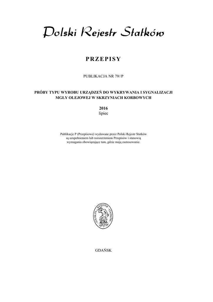 PRZEPISY PUBLIKACJA NR 79//P PRÓBY TYPU WYROBU URZĄDZEŃ DO WYKRYWANIA I SYGNALIZACJI MGŁY OLEJOWEJ W SKRZYNIACH KORBOWYCH 2016 lipiec Publikacje P (Przepisowe) wydawane przez Polski Rejestr Statków są uzupełnieniem lub rozszerzeniem Przepisów i stanowią wymagania obowiązujące tam, gdzie mają zastosowanie. GDAŃSK Publikacja Nr 79/P – Próby typu wyrobu urządzeń do wykrywania i sygnalizacji mgły olejowej w skrzyniach korbowych – lipiec 2016 została zatwierdzona przez Zarząd PRS S.A. w dniu 03 czerwca 2016 r. i wchodzi w życie z dniem 1 lipca 2016 r. © Copyright by Polski Rejestr Statków S.A., 2016 PRS/OP, 06/2016 SPIS TREŚCI str. 1 Zastosowanie ................................................................................................................................................... 5 2 Próby środowiskowe ....................................................................................................................................... 5 3 Cel..................................................................................................................................................................... 5 4 Stanowiska prób.............................................................................................................................................. 5 5 Próby urządzeń ............................................................................................................................................... 5 6 Próby funkcjonalne......................................................................................................................................... 6 7 Detektory i sygnalizatory podlegające próbom ............................................................................................ 7 8 Metoda ............................................................................................................................................................. 7 9 Ocena................................................................................................................................................................ 8 10 Uznanie serii konstrukcyjnej....................................................................................................................... 8 11 Sprawozdanie................................................................................................................................................ 8 12 Dopuszczenie................................................................................................................................................. 8 1 ZASTOSOWANIE 1.1 Niniejsza Publikacja określa próby wymagane do wykazania, że urządzenia do wykrywania i sygnalizacji mgły olejowej zainstalowane w silnikach wysokoprężnych spełniają wymagania PRS. Uwaga: Niniejsza metoda badań ma także zastosowanie do urządzeń wykrywania i sygnalizacji mgły olejowej instalowanych w przekładniach zębatych. 2 PRÓBY ŚRODOWISKOWE 2.1 Próby środowiskowe powinny być przeprowadzone zgodnie z Publikacją Nr 11/P – Próby środowiskowe wyposażenia statków. 3 CEL 3.1 Próby typu urządzeń do wykrywania i sygnalizacji mgły olejowej w skrzyni korbowej mają na celu: .1 sprawdzenie funkcjonalności systemu; .2 sprawdzenie skuteczności detektorów mgły olejowej; .3 sprawdzenie dokładności detektorów mgły olejowej; .4 sprawdzenie nastaw sygnalizatorów; .5 sprawdzenie opóźnienia między wystąpieniem mgły olejowej a uruchomieniem alarmu; .6 sprawdzenie wykrywania awarii działania; .7 określenie wpływu zaciemnienia na skuteczność wykrywania. 4 STANOWISKA PRÓB 4.1 Zakłady przeprowadzające próby typu wyrobu urządzeń do wykrywania i sygnalizacji mgły olejowej w skrzyniach korbowych powinny spełniać następujące wymagania: .1 wszystkie stanowiska do przeprowadzania prób środowiskowych i prób funkcjonalnych wymagane zgodnie z niniejszą procedurą powinny być dostępne i zatwierdzone przez PRS; .2 zakład przeprowadzający próby funkcjonalne powinien posiadać takie urządzenia, aby można było zgodnie z niniejszą metodą kontrolować, mierzyć i rejestrować poziomy stężenia mgły olejowej wyrażonej w mg/l z dokładnością ± 10%. .3 podczas badań stanowiska prób powinny brać pod uwagę możliwość wystąpienia zagrożeń związanych z wytworzeniem wymaganej mgły olejowej i zastosować wszelkie środki ostrożności. IACS zaakceptuje zastosowanie olejów o niskiej toksyczności, o niskim stopniu zagrożenia stosowanych w innych badaniach, pod warunkiem wykazania ich właściwości analogicznych do właściwości olejów mineralnych typu SAE 40. 5 PRÓBY URZĄDZEŃ 5.1 .1 Zakres prób powinien obejmować: w przypadku urządzenia alarmowo-kontrolnego: – próby funkcjonalne określone w rozdziale 6; – próbę zaniku zasilania; – próbę wahania napięcia zasilania; – próbę „suche gorąco”; – próbę „wilgotne gorąco”; – próbę odporności na wibracje; – próbę kompatybilności elektromagnetycznej; – próbę rezystancji izolacji; – próbę wytrzymałości elektrycznej izolacji; – próbę przechyłów statycznych i dynamicznych, jeśli w urządzeniu występują części ruchome; 5 .2 6 w przypadku wykrywaczy: – próby funkcjonalne określone w rozdziale 6; – próbę zaniku zasilania; – próbę wahania napięcia zasilania; – próbę „suche gorąco”; – próbę „wilgotne gorąco”; – próbę odporności na wibracje; – próbę kompatybilności elektromagnetycznej, jeśli jest to uzasadnione; – próbę oporności izolacji; – próbę wytrzymałości elektrycznej izolacji; – próbę przechyłów statycznych i dynamicznych. PRÓBY FUNKCJONALNE 6.1 Próby funkcjonalne urządzeń do wykrywania i sygnalizacji mgły olejowej w skrzyni korbowej należy przeprowadzać zgodnie z wymaganiami określonymi w punktach od 6.2 do 6.6 przy znanym stężeniu mgły olejowej wyrażonym w mg/l i określonej z dokła