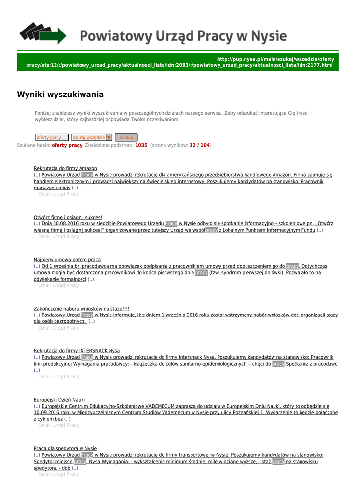 http://pup.nysa.pl/main/szukaj/wszedzie/oferty pracy/sts:12/:/powiatowy_urzad_pracy/aktualnosci_lista/idn:2083/:/powiatowy_urzad_pracy/aktualnosci_lista/idn:2177.html Wyniki wyszukiwania Poniżej znajdziesz wyniki wyszukiwania w poszczególnych działach naszego serwisu. Żeby odszukać interesujące Cię treści wybierz dział, który najbardziej odpowiada Twoim oczekiwaniom. oferty pracy szukaj wszędzie ▼ Szukaj Szukane hasło: oferty pracy. Znaleziono podstron: 1035 (strona wyników: 12 / 104) 111 Rekrutacja do firmy Amazon (..) Powiatowy Urząd Pracy w Nysie prowadzi rekrutację dla amerykańskiego przedsiębiorstwa handlowego Amazon. Firma zajmuje się handlem elektronicznym i prowadzi największy na świecie sklep internetowy. Poszukujemy kandydatów na stanowisko: Pracownik magazynu miejs (..) Dział: Urząd Pracy 112 Otwórz firmę i osiągnij sukces! (..) Dnia 30.08.2016 roku w siedzibie Powiatowego Urzędu Pracy w Nysie odbyło się spotkanie informacyjno – szkoleniowe pn. „Otwórz własną firmę i osiągnij sukces!” organizowane przez tutejszy Urząd we współpracy z Lokalnym Punktem Informacyjnym Fundu (..) Dział: Urząd Pracy 113 Najpierw umowa potem praca (..) Od 1 września br. pracodawca ma obowiązek podpisania z pracownikiem umowy przed dopuszczeniem go do pracy. Dotychczas umowa mogła być dostarczona pracownikowi do końca pierwszego dnia pracy (tzw. syndrom pierwszej dniówki). Pozwalało to na odwlekanie formalności (..) Dział: Urząd Pracy 114 Zakończenie naboru wniosków na staże!!!! (..) Powiatowy Urząd Pracy w Nysie informuje, iż z dniem 1 września 2016 roku został wstrzymany nabór wniosków dot. organizacji staży dla osób bezrobotnych. (..) Dział: Urząd Pracy 115 Rekrutacja do firmy INTERSNACK Nysa (..) Powiatowy Urząd Pracy w Nysie prowadzi rekrutację do firmy Intersnack Nysa. Poszukujemy kandydatów na stanowisko: Pracownik linii produkcyjnej Wymagania pracodawcy: - książeczka do celów sanitarno-epidemiologicznych, - chęci do pracy Spotkanie z pracodawc (..) Dział: Urząd Pracy 116 Europejski Dzień Nauki (..) Europejskie Centrum Edukacyjno-Szkoleniowe VADEMECUM zaprasza do udziału w Europejskim Dniu Nauki, który to odbędzie się 10.09.2016 roku w Międzyuczelnianym Centrum Studiów Vademecum w Nysie przy ulicy Poznańskiej 1. Wydarzenie to będzie połączone z cyklem bez (..) Dział: Urząd Pracy 117 Praca dla spedytora w Nysie (..) Powiatowy Urząd Pracy w Nysie prowadzi rekrutację do firmy transportowej w Nysie. Poszukujemy kandydatów na stanowisko: Spedytor miejsce pracy: Nysa Wymagania: - wykształcenie minimum średnie, mile widziane wyższe, - staż pracy na stanowisku spedytora, - dob (..) Dział: Urząd Pracy 118 Praca dla spawaczy i lakierników (..) Agencja Pracy Tymczasowej Global Operative poszukuje pracowników do zatrudnienia na stanowiskach: (..) Dział: Urząd Pracy 119 400 tys. zł na rozwój przedsiębiorczości (..) Nowe środki finansowe na rozwój przedsiębiorczości w powiecie nyskim. W ostatnim tygodniu Starosta Nyski pozyskał 400 tys. zł. z rezerwy Ministra Rodziny Pracy i Polityki Społecznej na realizację programu regionalnego. Program regionalny realizowany będzi (..) Dział: Urząd Pracy 120 Praca dla magazynierów w Nysie (..) Powiatowy Urząd Pracy w Nysie prowadzi rekrutację do firmy Otmuchów Logistyka sp. z o.o. Poszukujemy kandydatów na stanowisko: Magazynier miejsce pracy: Nysa Wymagania: - uprawnienia na wózek widłowy z wymianą butli gazowych, - książeczka do celów sanitar (..) Dział: Urząd Pracy ● ● ● ● ● ● ● ● ● ● ● ● ● ● ● « Pierwsza < Poprzednia 7 8 9 10 11 12 13 14 15 16 17 Następna > Ostatnia »