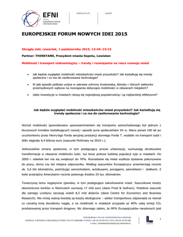EUROPEJSKIE FORUM NOWYCH IDEI 2015 Okrągły stół, czwartek, 1 października 2015, 13:45–15:15 Partner: THINKTANK, Prezydent miasta Sopotu, Lewiatan Mobilność i transport niskoemisyjny – trendy i rozwiązania na rzecz rozwoju miast Jak będzie wyglądać mobilność mieszkańców miast przyszłości? Jak kształtują się trendy społeczne i co ma do zaoferowania technologia? W jaki sposób polityka unijna w zakresie ochrony środowiska, klimatu i różnych sektorów przemysłowych wpływa na rozwiązania dotyczące mobilności w obszarach miejskich? Jakie inwestycje w miastach cieszą się największą popularnością i są najbardziej efektywne? Jak będzie wyglądać mobilność mieszkańców miast przyszłości? Jak kształtują się trendy społeczne i co ma do zaoferowania technologia? Wzrost mobilności spowodowany upowszechnieniem się transportu samochodowego był jednym z kluczowych trendów kształtujących rozwój i sposób życia społeczeństw XX w. Nieco ponad 100 lat po uruchomieniu przez Henry’ego Forda seryjnej produkcji słynnego Forda T. wydatki na transport ludzi i dóbr sięgnęły 6,4 biliona euro (szacunki McKinsey na 2010 r.). Jednocześnie zmiany społeczne, w tym postępujący proces urbanizacji, wymuszają strukturalne transformacje w obszarze mobilności ludzi. Już teraz połowa ludzkiej populacji żyje w miastach. Do 2050 r. odsetek ten ma się zwiększyć do 70%. Rozrastanie się miast wydłuża dystanse pokonywane do pracy, domu czy też miejsca odpoczynku. Według szacunków Europejczycy przemierzają rocznie ok. 5,6 bln kilometrów, podróżując samochodami, autobusami, pociągami, samolotami i statkami. Z kolei przeciętny Amerykanin rocznie pokonuje średnio 25 tys. kilometrów. Towarzyszą temu negatywne zjawiska, w tym postępujące zakorkowanie miast. Szacunkowe koszty ekonomiczne korków w Niemczech wynoszą 17 mld euro (dane Frost & Sullivan). Podobne szacunki dla samego Londynu oscylują wokół 8,5 mld dolarów (dane Centre for Economics and Business Research). Nie mniej ważną kwestią są koszty ekologiczne – sektor transportowy odpowiada za niemal co czwartą tonę dwutlenku węgla, a na mobilność w miastach przypada aż 40% całej emisji CO2 produkowanej przez transport drogowy. Nic dziwnego zatem, że 90% Europejczyków narażonych jest 1 na szkodliwe działanie zanieczyszczonego powietrza, z czego co trzeci – cząstek stałych (PM), które są najbardziej niebezpieczne dla zdrowia. Jak kształtują się trendy społeczne i co ma do zaoferowania technologia? Wspomniane uwarunkowania w połączeniu z rozwojem technologii komunikacyjnych przyniosły wiele nowych trendów w mobilności miejskiej. Obejmują one m.in. zmianę zachowań konsumenckich, w tym wzrost popularności wynajmowania oraz dzielenia pojazdów z innymi, jak również łączenia różnych rodzajów transportu – co stało się dużo łatwiejsze dzięki rozwojowi aplikacji mobilnych. Jednym z ważniejszych i bardziej obiecujących trendów jest również rozwój elektromobilności – mającej kluczowe znaczenie w dążeniach do zapewnienia zrównoważonego transportu prywatnego, ale też publicznego. Choć udział samochodów elektrycznych (EV) w całości rynku jest wciąż niewielki (poniżej 1% rejestrowanych pojazdów), to dynamika wzrostu jest obiecująca (w 2014 r. europejski rynek zwiększył się o 37%). Zaznaczyć należy przy tym, że sytuacja różni się znacznie w poszczególnych krajach. Europejskim liderem pod względem udziału EV w rynku jest Norwegia (ok. 15% w 2014 r.), zaś najwyższą dynamikę sprzedaży w 2014 r. uzyskała Wielka Brytania (300%), Niemcy (70%) i Francja (30%). W ostatnim roku sprzedaż samochodów napędzanych elektrycznie (w tym hybrydowych) zwiększyła się też w Stanach Zjednoczonych – o 23% (119 tys. sprzedanych egzemplarzy) oraz Chinach – o 325% (prawie 75 tys. sprzedanych egzemplarzy). Wśród źródeł trendu wzrostowego wymienić należy wsparcie rządowe, udoskonalaną ofertę EV, ale też zmiany w podejściu konsumentów, w tym oswajanie się z elektromobilnością, oraz rosnącą świadomość ekologiczną. Zachęty ze strony państwa stanowią niezbędny element upowszechniania nowych trendów w mobilności miejskiej. Jak w takim razie powinna kształtować się polityka rządowa, by osiągnąć balans między kosztami dla budżetu a efektami na rynku? Wachlarz stosowanych na świecie zachęt jest niezwykle szeroki i obejmuje: ulgi podatkowe przy zakupie (Norwegia), dopłaty (USA), zwolnienia z pierwszej opłaty rejestracyjnej (Szanghaj), darmowe korzystanie z płatnych dróg (Norwegia) czy też budowę miejskiej infrastruktury do ładowania (Berlin). Zachęty dla rozwoju elektromobilności ze strony instytucji państwowych są jednym z elementów równania. Kolejnym są działania ze strony producentów Jakie trendy zaobserwować można na tym polu? Bez wątpienia kluczowy jest rozwój technologiczny, w tym udoskonalanie baterii, zmniejszanie wagi pojazdów czy też zawansowane systemy wspomagania kierowcy. Zmniejszaniu poszczególnych 2 barier dla rozwoju elektromobilności służyć mają również nowe modele biznesowe, w tym oferowanie usługi mobilności (co obniża cenę pojazdu oraz eliminuje problem żywotności baterii), partnerstwo publiczno-prywatne w rozwoju infrastruktury czy też współpraca koncernów samochodowych z dostawcami energii elektrycznej. W jaki sposób polityka unijna w zakresie ochrony środowiska, klimatu i różnych sektorów przemysłowych wpływa na rozwiązania dotyczące mobilności w obszarach miejskich? Kolejnym kluczowym czynnikiem kształtującym sytuację sektora motoryzacyjnego (nie tylko EV) są polityki UE. Dotychczasowe rozwiązania prawne, wpisujące się w politykę klimatyczną Unii, zmierzają do stopniowego zastępowania pojazdów o napędzie konwencjonalnym – elektrycznymi. Biała księga dotycząca europejskiej polityki transportowej kreśli wizj