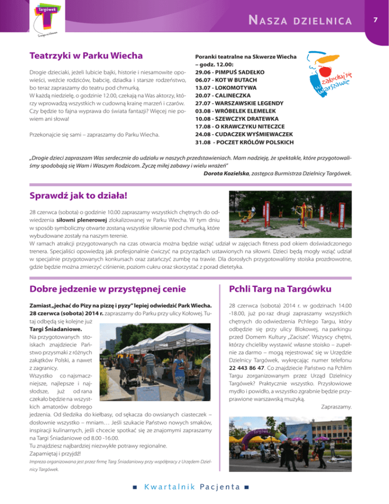 Nasza Teatrzyki w Parku Wiecha Drogie dzieciaki, jeżeli lubicie bajki, historie i niesamowite opowieści, weźcie rodziców, babcię, dziadka i starsze rodzeństwo, bo teraz zapraszamy do teatru pod chmurką. W każdą niedzielę, o godzinie 12.00, czekają na Was aktorzy, którzy wprowadzą wszystkich w cudowną krainę marzeń i czarów. Czy będzie to fajna wyprawa do świata fantazji? Więcej nie powiem ani słowa! Przekonajcie się sami – zapraszamy do Parku Wiecha. dzielnica Poranki teatralne na Skwerze Wiecha – godz. 12.00: 29.06 - PIMPUŚ SADEŁKO 06.07 - KOT W BUTACH 13.07 - LOKOMOTYWA 20.07 - CALINECZKA 27.07 - WARSZAWSKIE LEGENDY 03.08 - WRÓBELEK ELEMELEK 10.08 - SZEWCZYK DRATEWKA 17.08 - O KRAWCZYKU NITECZCE 24.08 - CUDACZEK WYŚMIEWACZEK 31.08 - POCZET KRÓLÓW POLSKICH „Drogie dzieci zapraszam Was serdecznie do udziału w naszych przedstawieniach. Mam nadzieję, że spektakle, które przygotowaliśmy spodobają się Wam i Waszym Rodzicom. Życzę miłej zabawy i wielu wrażeń” Dorota Kozielska, zastępca Burmistrza Dzielnicy Targówek. Sprawdź jak to działa! 28 czerwca (sobota) o godzinie 10.00 zapraszamy wszystkich chętnych do odwiedzenia siłowni plenerowej zlokalizowanej w Parku Wiecha. W tym dniu w sposób symboliczny otwarte zostaną wszystkie siłownie pod chmurką, które wybudowane zostały na naszym terenie. W ramach atrakcji przygotowanych na czas otwarcia można będzie wziąć udział w zajęciach fitness pod okiem doświadczonego trenera. Specjaliści opowiedzą jak profesjonalnie ćwiczyć na przyrządach ustawionych na siłowni. Dzieci będą mogły wziąć udział w specjalnie przygotowanych konkursach oraz zatańczyć zumbę na trawie. Dla dorosłych przygotowaliśmy stoiska prozdrowotne, gdzie będzie można zmierzyć ciśnienie, poziom cukru oraz skorzystać z porad dietetyka. Dobre jedzenie w przystępnej cenie Pchli Targ na Targówku Zamiast „jechać do Pizy na pizzę i pyzy” lepiej odwiedzić Park Wiecha. 28 czerwca (sobota) 2014 r. zapraszamy do Parku przy ulicy Kołowej. Tutaj odbędą się kolejne już Targi Śniadaniowe. Na przygotowanych stoiskach znajdziecie Państwo przysmaki z różnych zakątków Polski, a nawet z zagranicy. Wszystko co najsmaczniejsze, najlepsze i najsłodsze, już od rana czekało będzie na wszystkich amatorów dobrego jedzenia. Od śledzika do kiełbasy, od sękacza do owsianych ciasteczek – dosłownie wszystko – mniam… Jeśli szukacie Państwo nowych smaków, inspiracji kulinarnych, jeśli chcecie spotkać się ze znajomymi zapraszamy na Targi śniadaniowe od 8.00 -16.00. Tu znajdziesz najbardziej niezwykłe potrawy regionalne. Zapamiętaj i przyjdź! 28 czerwca (sobota) 2014 r. w godzinach 14.00 -18.00, już po raz drugi zapraszamy wszystkich chętnych do odwiedzenia Pchlego Targu, który odbędzie się przy ulicy Blokowej, na parkingu przed Domem Kultury „Zacisze”. Wszyscy chętni, którzy chcieliby wystawić własne stoisko – zupełnie za darmo – mogą rejestrować się w Urzędzie Dzielnicy Targówek, wykręcając numer telefonu 22 443 86 47. Co znajdziecie Państwo na Pchlim Targu zorganizowanym przez Urząd Dzielnicy Targówek? Praktycznie wszystko. Przysłowiowe mydło i powidło, a wszystko zgrabnie będzie przyprawione warszawską muzyką. Zapraszamy. Impreza organizowana jest przez firmę Targ Śniadaniowy przy współpracy z Urzędem Dzielnicy Targówek. K w a r t a l n i k Pa c j e n t a 7