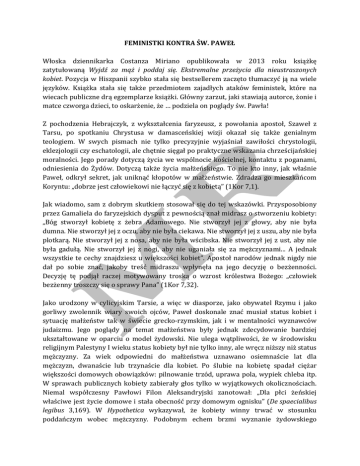 FEMINISTKI KONTRA ŚW. PAWEŁ Włoska dziennikarka Costanza Miriano opublikowała w 2013 roku książkę zatytułowaną Wyjdź za mąż i poddaj się. Ekstremalne przeżycia dla nieustraszonych kobiet. Pozycja w Hiszpanii szybko stała się bestsellerem zaczęto tłumaczyć ją na wiele języków. Książka stała się także przedmiotem zajadłych ataków feministek, które na wiecach publiczne drą egzemplarze książki. Główny zarzut, jaki stawiają autorce, żonie i matce czworga dzieci, to oskarżenie, że … podziela on poglądy św. Pawła! Z pochodzenia Hebrajczyk, z wykształcenia faryzeusz, z powołania apostoł, Szaweł z Tarsu, po spotkaniu Chrystusa w damasceńskiej wizji okazał się także genialnym teologiem. W swych pismach nie tylko precyzyjnie wyjaśniał zawiłości chrystologii, eklezjologii czy eschatologii, ale chętnie sięgał po praktyczne wskazania chrześcijańskiej moralności. Jego porady dotyczą życia we wspólnocie kościelnej, kontaktu z poganami, odniesienia do Żydów. Dotyczą także życia małżeńskiego. To nie kto inny, jak właśnie Paweł, odkrył sekret, jak uniknąć kłopotów w małżeństwie. Zdradza go mieszkańcom Koryntu: „dobrze jest człowiekowi nie łączyć się z kobietą” (1Kor 7,1). Jak wiadomo, sam z dobrym skutkiem stosował się do tej wskazówki. Przysposobiony przez Gamaliela do faryzejskich dysput z pewnością znał midrasz o stworzeniu kobiety: „Bóg stworzył kobietę z żebra Adamowego. Nie stworzył jej z głowy, aby nie była dumna. Nie stworzył jej z oczu, aby nie była ciekawa. Nie stworzył jej z uszu, aby nie była plotkarą. Nie stworzył jej z nosa, aby nie była wścibska. Nie stworzył jej z ust, aby nie była gadułą. Nie stworzył jej z nogi, aby nie uganiała się za mężczyznami... A jednak wszystkie te cechy znajdziesz u większości kobiet”. Apostoł narodów jednak nigdy nie dał po sobie znać, jakoby treść midraszu wpłynęła na jego decyzję o bezżenności. Decyzję tę podjął raczej motywowany troską o wzrost królestwa Bożego: „człowiek bezżenny troszczy się o sprawy Pana” (1Kor 7,32). Jako urodzony w cylicyjskim Tarsie, a więc w diasporze, jako obywatel Rzymu i jako gorliwy zwolennik wiary swoich ojców, Paweł doskonale znać musiał status kobiet i sytuację małżeństw tak w świecie grecko-‐rzymskim, jak i w mentalności wyznawców judaizmu. Jego poglądy na temat małżeństwa były jednak zdecydowanie bardziej ukształtowane w oparciu o model żydowski. Nie ulega wątpliwości, że w środowisku religijnym Palestyny I wieku status kobiety był nie tylko inny, ale wręcz niższy niż status mężczyzny. Za wiek odpowiedni do małżeństwa uznawano osiemnaście lat dla mężczyzn, dwanaście lub trzynaście dla kobiet. Po ślubie na kobietę spadał ciężar większości domowych obowiązków: pilnowanie trzód, uprawa pola, wypiek chleba itp. W sprawach publicznych kobiety zabierały głos tylko w wyjątkowych okolicznościach. Niemal współczesny Pawłowi Filon Aleksandryjski zanotował: „Dla płci żeńskiej właściwe jest życie domowe i stała obecność przy domowym ognisku” (De spaecialibus legibus 3,169). W Hypothetica wykazywał, że kobiety winny trwać w stosunku poddańczym wobec mężczyzny. Podobnym echem brzmi wyznanie żydowskiego historyka Józefa Flawiusza, który stwierdza wprost, iż kobieta jest „gorsza” od mężczyzny (Contra Apionem 2,24). Wszystkie te stwierdzenia umieścić należy na linii nakreślonej wcześniej przez Syracha: „Małe jest wszelkie zło wobec przewrotności kobiety” (Syr 25, 19). Na szczęście Paweł, który stykał się nie tylko z judaizmem palestyńskim, ale także z mentalnością grecko-‐rzymską, nie przejął wprost wszystkich wzorców życia małżeńskiego z religii swych przodków. Jego przekonania w tym względzie są w pewnym sensie wypadkową religijnych wymagań judaizmu i obserwacji sytuacji małżeństw w społeczeństwie greckim. Największy jednak wpływ na obraz małżeństwa i rodziny w listach Pawłowych miało nauczanie Jezusa. Zasadnicza różnica dotycząca małżeństwa, jaka wyłania się w zestawieniu przekonań Jezusa, a w konsekwencji i Pawła z poglądami wyznawców judaizmu jest taka, że nazaretański Nauczyciel uważa związek małżeński za nierozerwalny. Wyjątkiem jest tzw. przywilej Pawłowy, a więc sytuacja, gdy jedno z małżonków przyjmuje chrześcijaństwo, inne pozostaje przy wierzeniach pogańskich. W swych pouczeniach Paweł twierdzi, że mężowie powinni miłować swoje żony na wzór, w jaki Chrystus miłuje Kościół (Ef 5,25), a w małżeństwie winno panować wzajemne poddanie się sobie (Ef 5,21). Stwierdzenie, że mąż jest głową żony, nie oznacza absolutnej dominacji mężczyzny. Świadczy o tym już choćby fakt, że Paweł – w przeciwieństwie do antycznych kodeksów domowych, które skierowane są jedynie do patres familias – daje wskazania także kobietom. Apostoł odrzucał poglądy radykalnych ascetów, zachęcających do powstrzymania się od współżycia nawet w małżeństwie. Oprócz przestróg, napomnień i zachęt Paweł potrafił dostrzec piękno sakramentu sankcjonującego więź miłości między kobietą i mężczyzną. Wydaje się, że gdy dziś sięgamy po jego pisma, w których dotyka problematyki małżeńskiej i rodzinnej, warto niczym perełki wydobywać z nich myśli oscylujące wokół piękna ludzkiej miłości. Tak właśnie postąpił autor innego niż przytoczony na początku naszych refleksji midraszu. Midraszu, którego św. Paweł przypuszczalnie nie znał: „Bóg stworzył kobietę z boku mężczyzny. Nie stworzył jej z nogi, aby nie była deptana. Nie stworzył jej z głowy, aby się nie wynosiła. Stworzył ją z boku, by była równa mężczyźnie. Z miejsca nieco pod ramieniem, by była chroniona. Ze strony serca – by była kochana”. Ksiądz Marek Dziewiecki, profesor psychologii w Seminarium Duc