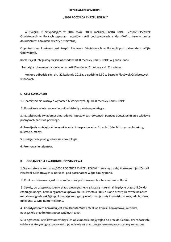 REGULAMIN KONKURSU „1050 ROCZNICA CHRZTU POLSKI” W związku z przypadającą w 2016 roku 1050 rocznicą Chrztu Polski Zespół Placówek Oświatowych w Borkach zaprasza uczniów szkół podstawowych z klas IV-VI z terenu gminy do udziału w konkursie wiedzy historycznej. Organizatorem konkursu jest Zespół Placówek Oświatowych w Borkach pod patronatem Wójta Gminy Borki. Konkurs jest integralną częścią obchodów 1050 rocznicy Chrztu Polski w gminie Borki Tematyka obejmuje panowanie dynastii Piastów od 2.połowy X do XIV wieku. Konkurs odbędzie się dn. 22 kwietnia 2016 r. o godzinie 9.30 w Zespole Placówek Oświatowych w Borkach. I. CELE KONKURSU: 1. Upamiętnienie ważnych wydarzeń historycznych, tj. 1050 rocznicy Chrztu Polski. 2. Rozwijanie zainteresowań uczniów historią państwa polskiego. 3. Kształtowanie świadomości narodowej i postaw patriotycznych poprzez upowszechnienie wiedzy o początkach państwa polskiego. 4. Rozwijanie umiejętności wyszukiwania i interpretowania różnych źródeł historycznych (teksty, ilustracje, mapy). 5. Umiejętność posługiwania się chronologią. 6. Promowanie talentów. II. ORGANIZACJA I WARUNKI UCZESTNICTWA: 1.Organizatorem konkursu„1050 ROCZNICA CHRZTU POLSKI ‘’ zwanego dalej Konkursem jest Zespół Placówek Oświatowych w Borkach pod patronatem Wójta Gminy Borki. 2. Konkurs skierowany jest do uczniów szkół podstawowych z terenu Gminy Borki. 3. Szkoły, po przeprowadzeniu etapu wewnętrznego zgłaszają maksymalnie pięciu uczestników do etapu gminnego. Termin zgłoszenia upływa dn. 14 kwietnia 2016 r. Dane proszę kierować na adres e-mailowy: [email protected] podając następujące informacje: imię i nazwisko ucznia, szkoła, dane opiekuna, w tym numer telefonu. 4 Koordynatorem konkursu jest Pani Danuta Witek. W skład komisji konkursowej wchodzą nauczyciele przedmiotu z poszczególnych szkół. 5.Po ogłoszeniu wyników uczestnicy i ich opiekunowie mają wgląd do prac do siedmiu dni roboczych, od dnia w którym ogłoszono wyniki, po upływie wyznaczonego terminu prace zostaną zniszczone. 6.Członków komisji obowiązuje tajemnica. 7.Treść testów zostanie ujawniona w chwili rozpoczęcia konkursu. 8. W sprawach nieuregulowanych niniejszym Regulaminem decyduje Organizator Konkursu. 9.Z przebiegu konkursu sporządzany jest protokół./Załącznik nr 1. 10. Udział w Konkursie jest równoznaczny z akceptacją Regulaminu oraz wyrażeniem zgody na przetwarzanie danych osobowych uczestnika przez Organizatora dla celów organizacyjnych Konkursu./Załącznik nr 2. III. PRZEBIEG KONKURSU: 1. Konkurs odbędzie się dn. 22 kwietnia 2016 r. o godz. 9.30 w Zespole Placówek Oświatowych w Borkach przy ul. II Armii Wojska Polskiego 25. 2. Test będzie składał się z 30 zagadnień zamkniętych, jednokrotnego wyboru. Na rozwiązanie uczestnik będzie miał 45 minut. 3. W wyniku konkursu wyłania się trzech zwycięzców dla których przewidziane są nagrody. 4. W przypadku równorzędnej liczby punktów, w celu wyłonienia zwycięzców, zostanie przeprowadzony test uzupełniający, składający się z 5 zadań zamkniętych, jednokrotnego wyboru. Na rozwiązanie uczestnik będzie miał 10 minut. Test uzupełniający odbędzie się dn. 22 kwietnia 2016r. niezwłocznie po sprawdzeniu i ogłoszeniu wyników pierwszego testu. 5. Ogłoszenie wyników Konkursu oraz uroczyste wręczenie nagród odbędzie się dn. 15 maja 2016 r. podczas gminnych obchodów 1050 rocznicy chrztu Polski. IV. ZAKRES TEMATYCZNY KONKURSU: 1. Legendarne początki państwa polskiego. 2. Plemiona polskie i ich siedziby. 3. Polska za panowania Mieszka I, Bolesława I Chrobrego, Bolesława Krzywoustego , Władysława Łokietka, Kazimierza Wielkiego. 4. Polityka wewnętrzna i zagraniczna Piastów (wg.pkt.3). 5. Kształtowanie się granic państwa polskiego .(wg.pkt.3). 6. Męczeństwo św. Wojciecha i św. Stanisława. 7. Chrzest Polski i jego znaczenie dla przyszłości państwa. 8.Państwo i społeczeństwo w czasach wczesnopiastowskich. V. LITERATURA: a)Podstawowa: 1. Atlas historyczny dla szkoły podstawowej i gimnazjum 2.Historia Polski dla Piotrka, Stanisław Marciniak 3.Poczet królów i książąt polskich Jana Matejki 4.Podręczniki do historii dla szkoły podstawowej i gimnazjum b)Uzupełniająca: 1. J. Wyrozumski, Dzieje Polski Piastowskiej (VII w.- 1370), t. 2, Kraków 1999 2. S. Szczur, Historia Polski. Średniowiecze, Kraków 2002 3. U źródeł Polski, Warszawa – Wrocław 2002 4. Monarchia Piastów, Warszawa – Wrocław 2003 Załącznik nr 1 Protokół z przebiegu gminnego konkursu historycznego dla uczniów szkół podstawowych nt.: ,,1050 ROCZNICA CHRZTU POLSKI’’. Konkurs rozpoczął się o godz. ………………… dnia ……………….............. w ZPO w Borkach. Zakończył się o godz. ……………………… Do konkursu przystąpiło ……………………. uczniów z terenu gminy. Konkurs ukończyło ………………………. uczniów. Uczniowie uzyskali następującą liczbę punktów (maksymalnie można było uzyskać 30 pkt.): Lp Imię i nazwisko Laureatami konkursu zostali: 1. Liczba pkt. Szkoła Opiekun 2. 3. Skład komisji konkursowej: Załącznik nr 1a Protokół z przebiegu gminnego uzupełniającego konkursu historycznego dla uczniów szkół podstawowych nt.: ,,1050 ROCZNICA CHRZTU POLSKI’’. Konkurs rozpoczął się o godz………………… dnia………………..............w ZPO w Borkach. Zakończył się o godz……………………… Do konkursu uzupełniającego przystąpiło…………………….uczniów z terenu gminy. Konkurs ukończyło……………………….uczniów. Uczniowie którzy uzyskali największą liczbę punktów(maksymalnie można było uzyskać 5 pkt.): Imię i nazwisko Liczba pkt. Skład komisji konkursowej: Członkowie komisji: 1……………………………………………. 2……………………………………………. 3………………