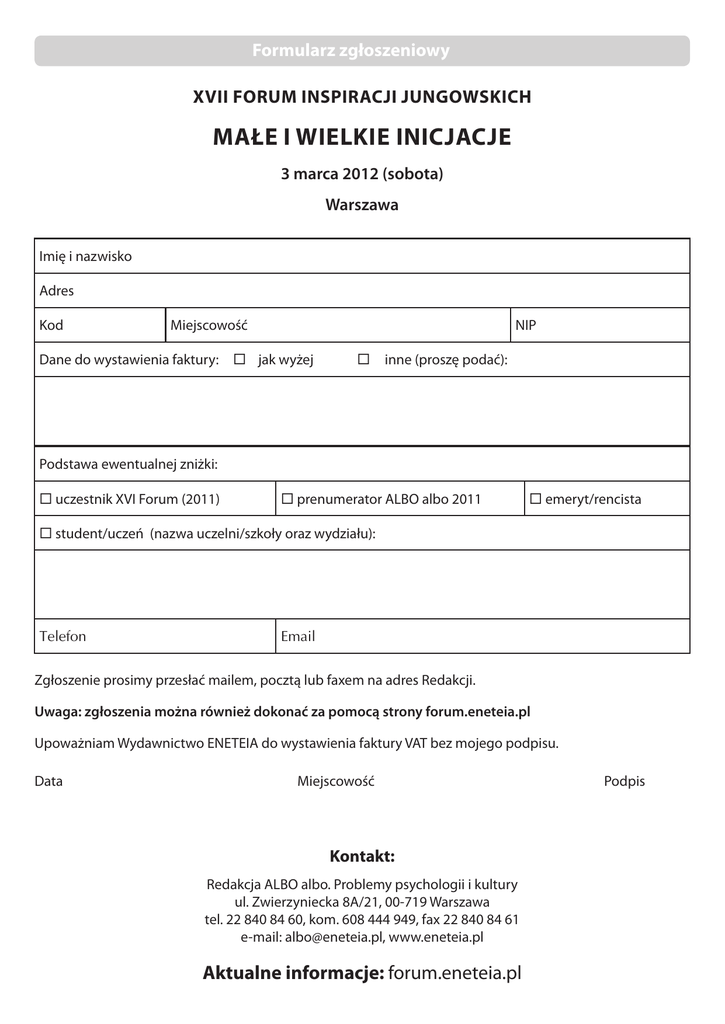 Formularz zgłoszeniowy Xvii Forum Inspiracji Jungowskich Małe i wielkie inicjacje 3 marca 2012 (sobota) Warszawa Imię i nazwisko Adres Kod Miejscowość NIP Dane do wystawienia faktury: ¨ jak wyżej ¨ inne (proszę podać): Podstawa ewentualnej zniżki: ¨ uczestnik XVI Forum (2011) ¨ prenumerator ALBO albo 2011 ¨ emeryt/rencista ¨ student/uczeń (nazwa uczelni/szkoły oraz wydziału): Telefon Email Zgłoszenie prosimy przesłać mailem, pocztą lub faxem na adres Redakcji. Uwaga: zgłoszenia można również dokonać za pomocą strony forum.eneteia.pl Upoważniam Wydawnictwo ENETEIA do wystawienia faktury VAT bez mojego podpisu. Data Miejscowość Kontakt: Redakcja ALBO albo. Problemy psychologii i kultury ul. Zwierzyniecka 8A/21, 00-719 Warszawa tel. 22 840 84 60, kom. 608 444 949, fax 22 840 84 61 e-mail: [email protected], www.eneteia.pl Aktualne informacje: forum.eneteia.pl Podpis