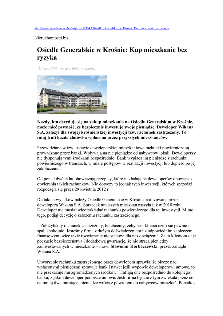 http://www.nieruchomosci.biz/artykuly,55904,1,Osiedle_Generalskie_w_Krosnie_Kup_mieszkanie_bez_ryzyka Nieruchomosci.biz Osiedle Generalskie w Krośnie: Kup mieszkanie bez ryzyka 21 lipca 2014, dostęp w dniu 10.04.2015 Każdy, kto decyduje się na zakup mieszkania na Osiedlu Generalskim w Krośnie, może mieć pewność, że bezpiecznie inwestuje swoje pieniądze. Deweloper Wikana S.A. założył dla swojej krośnieńskiej inwestycji tzw. rachunek zastrzeżony. To tutaj trafi każda złotówka wpłacona przez przyszłych mieszkańców. Przewidziane w tzw. ustawie deweloperskiej mieszkaniowe rachunki powiernicze są prowadzone przez banki. Wpływają na nie pieniądze od nabywców lokali. Deweloperzy nie dysponują tymi środkami bezpośrednio. Bank wypłaca im pieniądze z rachunku powierniczego w transzach, w miarę postępów w realizacji inwestycji lub dopiero po jej zakończeniu. Od ponad dwóch lat obowiązują przepisy, które nakładają na deweloperów obowiązek otwierania takich rachunków. Nie dotyczy to jednak tych inwestycji, których sprzedaż rozpoczęła się przez 29 kwietnia 2012 r. Do takich wyjątków należy Osiedle Generalskie w Krośnie, realizowane przez dewelopera Wikana S.A. Sprzedaż tutejszych mieszkań ruszyła już w 2010 roku. Deweloper nie musiał więc zakładać rachunku powierniczego dla tej inwestycji. Mimo tego, podjął decyzję o założeniu rachunku zastrzeżonego. – Założyliśmy rachunek zastrzeżony, bo chcemy, żeby nasi klienci czuli się pewnie i spali spokojnie. Jesteśmy firmą z dużym doświadczeniem i z odpowiednim zapleczem finansowym, więc takie rozwiązanie nie stanowi dla nas obciążenia. Za to klientom daje poczucie bezpieczeństwa i dodatkową gwarancję, że nie stracą pieniędzy zainwestowanych w mieszkanie – mówi Sławomir Horbaczewski, prezes zarządu Wikana S.A. Utworzenie rachunku zastrzeżonego przez dewelopera sprawia, że pieczę nad wpłaconymi pieniędzmi sprawuje bank i nawet jeśli wypowie deweloperowi umowę, to nie przekazuje mu zgromadzonych środków. Trafiają one bezpośrednio do kolejnego banku, z jakim deweloper podpisze umowę. Jeśli firma będzie z tym zwlekała przez co najmniej dwa miesiące, pieniądze wrócą z powrotem do nabywców mieszkań. Ponadto, rachunek chroni klientów nawet w tak skrajnych przypadkach, jak upadłość dewelopera. Wówczas służy zabezpieczeniu ich roszczeń. – W sytuacji, gdy z mediów napływają co pewien czas kolejne informacje o sytuacji na rynku mieszkaniowym, potrzeby klientów są zrozumiałe. Chcemy, żeby kupując mieszkanie na Osiedlu Generalskim, byli zarówno zadowoleni z tego, że zamieszkają na jednym z najładniejszych osiedli w mieście, jak i ze współpracy z nami, jako z rzetelnym deweloperem – mówi Sławomir Horbaczewski. Osiedle Generalskie w Krośnie powstaje przy ul. Generała Józefa Hallera. Składa się z trzech budynków mieszkalnych i jednego usługowego. W projekcie osiedla przewidziano też ogrodzone boisko sportowe, plac zabaw dla dzieci oraz chodniki i alejki spacerowe. Całe osiedle będzie pełne zieleni i dobrze oświetlone. Obecnie trwa realizacja czwartego etapu tej inwestycji, czyli budowa trzeciego budynku mieszkalnego. Znajdzie się w nim 60 mieszkań o powierzchni od 38 do 68 mkw. oraz podziemny, wielostanowiskowy garaż. Sprzedaż lokali rozpoczęła się pierwszego lipca. Ceny będą się kształtowały na poziomie 3800 zł za mkw.