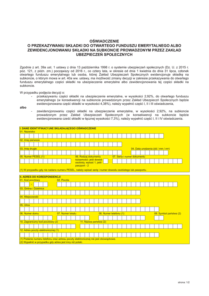 OŚWIADCZENIE O PRZEKAZYWANIU SKŁADKI DO OTWARTEGO FUNDUSZU EMERYTALNEGO ALBO ZEWIDENCJONOWANIU SKŁADKI NA SUBKONCIE PROWADZONYM PRZEZ ZAKŁAD UBEZPIECZEŃ SPOŁECZNYCH Zgodnie z art. 39a ust. 1 ustawy z dnia 13 października 1998 r. o systemie ubezpieczeń społecznych (Dz. U. z 2015 r. poz. 121, z późn. zm.) począwszy od 2016 r., co cztery lata, w okresie od dnia 1 kwietnia do dnia 31 lipca, członek otwartego funduszu emerytalnego lub osoba, której Zakład Ubezpieczeń Społecznych ewidencjonuje składkę na subkoncie, o którym mowa w art. 40a ww. ustawy, ma możliwość zmiany decyzji w zakresie przekazywania do otwartego funduszu emerytalnego części składki na ubezpieczenie emerytalne albo zewidencjonowania tej części składki na subkoncie. W przypadku podjęcia decyzji o: - przekazywaniu części składki na ubezpieczenie emerytalne, w wysokości 2,92%, do otwartego funduszu emerytalnego (w konsekwencji na subkoncie prowadzonym przez Zakład Ubezpieczń Społecznych będzie ewidencjonowana część składki w wysokości 4,38%), należy wypełnić część I, II i III oświadczenia, albo - zewidencjonowaniu części składki na ubezpieczenie emerytalne, w wysokości 2,92%, na subkoncie prowadzonym przez Zakład Ubezpieczeń Społecznych (w konsekwencji na subkoncie będzie ewidencjonowana cześć składki w łącznej wysokości 7,3%), należy wypełnić część I, II i IV oświadczenia. I. DANE IDENTYFIKACYJNE SKŁADAJĄCEGO OŚWIADCZENIE 01. Nazwisko 02. Imię pierwsze 03. Imię drugie 04. Data urodzenia (dd / mm / rrrr) 05. Numer PESEL (1) 06. Rodzaj dokumentu tożsamości: jeśli dowód osobisty, wpisać 1, jeśli paszport - 2 07. Seria i numer dokumentu (1) W przypadku gdy nie nadano numeru PESEL, należy wpisać serię i numer dowodu osobistego lub paszportu. II. ADRES DO KORESPONDENCJI 01. Kod pocztowy 02. Poczta 03. Gmina / Dzielnica 04. Miejscowość 05. Ulica 06. Numer domu 07. Numer lokalu 10. Zagraniczny kod pocztowy (2) 08. Numer telefonu (1) 09. Symbol państwa (2) 11. Nazwa państwa (2) 12. Adres poczty elektronicznej (1) (1) Podanie numeru telefonu oraz adresu poczty elektronicznej nie jest obowiązkowe. (2) Wypełnić w przypadku gdy adres jest inny niż polski. strona: 1/2 III. OŚWIADCZENIE O PRZEKAZYWANIU CZĘŚCI SKŁADKI DO OTWARTEGO FUNDUSZU EMERYTALNEGO Na podstawie art. 39a ust. 1 pkt 1 ustawy z dnia 13 października 1998 r. o systemie ubezpieczeń społecznych oświadczam, że chcę, aby część składki na ubezpieczenie emerytalne, o której mowa w art. 22 ust. 3 pkt 1 lit. a ww. ustawy, począwszy od składki opłaconej za lipiec, była przekazywana do: -otwartego funduszu emerytalnego, którego jestem członkiem albo -otwartego funduszu emerytalnego wskazanego poniżej (należy wypełnić w przypadku zamiaru zawarcia pierwszej umowy z otwartym funduszem emerytalnym albo zamiaru zmiany otwartego funduszu emerytalnego): AEGON OFE Allianz Polska OFE Aviva OFE Aviva BZ WBK AXA OFE Generali OFE MetLife OFE NationaleNederlanden OFE Nordea OFE Pekao OFE PKO BP Bankowy OFE OFE Pocztylion OFE PZU „Złota Jesień” Należy wpisać X w polu z prawej strony ........................................................ podpis składającego oświadczenie W przypadku złożenia oświadczenia o zamiarze zawarcia pierwszej umowy z otwartym funduszem emerytalnym albo zamiarze zmiany otwartego funduszu emerytalnego przepisy rozdziału 7 ustawy z dnia 28 sierpnia 1997 r. o organizacji i funkcjonowaniu funduszy emerytalnych (Dz. U. z 2013 r. poz. 989, z późn. zm.) stosuje się odpowiednio. W przypadku gdy oświadczenie składa ubezpieczony, którego składka była ewidencjonowana na subkoncie i który nie był członkiem otwartego funduszu emerytalnego, stosuje się odpowiednio art. 39 ust. 1 i 1a ustawy z dnia 13 października 1998 r. o systemie ubezpieczeń społecznych, z tym, że termin 4 miesięcy na zawarcie umowy z otwartym funduszem emerytalnym liczy się od dnia złożenia oświadczenia. Jeżeli ubezpieczony w tym terminie nie zawrze umowy z otwartym funduszem emerytalnym składka, o której mowa w art. 22 ust. 3 pkt 2 ustawy z dnia 13 października 1998 r. o systemie ubezpieczeń społecznych, jest ewidencjonowana na subkoncie. W przypadku gdy ubezpieczony wskaże nazwę innego otwartego funduszu emerytalnego, niż ten, którego jest członkiem, i nie zawrze umowy ze wskazanym otwartym funduszem emerytalnym składka, o której mowa w art. 22 ust. 3 pkt 1 lit. a ustawy z dnia 13 października 1998 r. o systemie ubezpieczeń społecznych, jest przekazywana do otwartego funduszu emerytalnego, którego ubezpieczony jest członkiem. IV. OŚWIADCZENIE O ZEWIDENCJONOWANIU CZĘŚCI SKŁADKI NA SUBKONCIE PROWADZONYM PRZEZ ZAKŁAD UBEZPIECZEŃ SPOŁECZNYCH Na podstawie art. 39a ust. 1 pkt 2 ustawy z dnia 13 października 1998 r. o systemie ubezpieczeń społecznych oświadczam, że chcę, aby część składki na ubezpieczenie emerytalne, o której mowa w art. 22 ust. 3 pkt 2 ww. ustawy, była zewidencjonowana na subkoncie, o którym mowa w art. 40a tej ustawy, począwszy od składki opłaconej za miesiąc, w którym składam oświadczenie. ........................................................ podpis składającego oświadczenie strona: 2/2