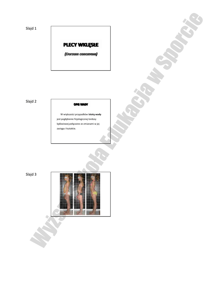 rci e Sp o Slajd 1 PLECY WKLĘSŁE Slajd 2 OPIS WADY W większości przypadków istotą wady jest pogłębienie fizjologicznej lordozy lędźwiowej połączone ze zmianami w jej Wy ższ aS Slajd 3 zko ła Ed zasięgu i kształcie. uk ac ja w (Dorsum concavum) rci e Slajd 4 LORDOZA LĘDŹWIOWA WARUNKI PRAWIDŁOWE: Sp o Odcinek L kręgosłupa ukształtowany jest w postaci wygięcia ku przodowi – lordozy lędźwiowej. Jej wielkość i kształt zależą od: predyspozycji dziedzicznych (budowy kości krzyżowej i miednicy), wieku, somatotypu, kształtu i stopnia ruchomości kifozy piersiowej, ustawienia miednicy, napięcia i długości mm stabilizujących stawy biodrowe. Slajd 5 WARUNKI NIEPRAWIDŁOWE uk ac ja w Lordoza lędźwiowa pełni rolę kompensacyjną w stosunku do kształtu i stopnia ruchomości kifozy piersiowej oraz ustawienia miednicy. Slajd 6 zko ła Ed W warunkach nieprawidłowych, szczególnie patologicznych, lordoza ulega zmianom, które są przyczyną powstawania wad o różnym przebiegu klinicznym, co z kolei wymaga różnego sposobu postępowania terapeutycznego. Zależą one od: • etiologii, • lokalizacji zmian, • różnego stopnia zaawansowania zmian. ETIOLOGIA aS Plecy wklęsłe mogą występować jako wrodzone lub nabyte. • W zespołach gimnastyki korekcyjnej mamy do czynienia z przypadkami pleców wklęsłych pierwotnie dystonicznych (z reguły występują one u dzieci z wiotkim gorsetem mięśniowym, w typach astenicznych). W związku z tym w tej grupie ingerencja okazuje się najbardziej skuteczna. Wy ższ • Plecy wklęsłe pochodzenia patologicznego stanowią przypadki dla rehabilitacji. rci e Slajd 7 LOKALIZACJA ZMIAN Ze względu na zależność od wielkości, kształtu i ruchomości kifozy piersiowej, lordoza lędźwiowa zależy od cech powyższych czynników. STOPIEŃ ZAAWANSOWANIA ZMIAN Slajd 8 uk ac ja w Sp o LOKALIZACJA SZCZYTU LORDOZY: • pogłębienie fizjologicznej lordozy bez zmiany jej lokalizacji (hiperlordoza lędźwiowa), występuje tendencja do kompensacyjnego pogłębienia kifozy piersiowej, • przemieszczenie szczytu lordozy lędźwiowej, często połączone ze zmianami w jej rozległości i w związku z tym wyróżnia się: - lordozę niską, krótką z towarzyszącą jej często kifozą o długim łuku, - lordozę wysoką, długą, obejmującą wygięciem lordotycznym również w odcinku Th kręgosłupa. Towarzyszy jej kifoza krótka, wysoka. Lordoza u dzieci, nawet jeśli jest nieprawidłowa rzadko ulega zesztywnieniu, u dorosłych natomiast zjawisko to występuje znacznie częściej. Jest ono wynikiem głównie przykurczu tylnych więzadeł i mięśni. Dotyczy to zwłaszcza prostownika grzbietu odcinka L kręgosłupa, w mniejszym stopniu sklinowacenia krążków międzykręgowych i trzonów kręgowych. Slajd 9 zko ła Ed Kształt lordozy, jej lokalizacja, stopień i rozległość usztywnienia warunkują w następstwie charakter zmian wtórnych, powodujących często bóle w obrębie tego odcinka (tzw. bóle krzyża - LOW BACK PAIN). Istotną przyczyną tych zmian jest przeciążenie. OMÓWIENIE ZAGADNIEŃ NA aS PRZYKŁADZIE SCHEMATYCZNIE UJĘTEJ Wy ższ PIERWOTNIE DYSTONICZNEJ HIPERLORDOZY LĘDŹWIOWEJ rci e Slajd 10 Sp o • W interesującym nas przypadku przyjmujemy, że krzywizna jest nadmiernie uwypuklona i ma tendencję do kompensacji wstępującej w odcinku Th. Slajd 11 WYGLĄD SYLWETKI WIDZIANEJ Z BOKU zko ła Powodem takiego wyglądu sylwetki jest dystonia mięśniowo – więzadłowa. Ed • powiększone wygięcie lordozy lędźwiowej, • mocno uwypuklone pośladki, • zaakcentowane przodopochylenie miednicy, • wypięty brzuch uk ac ja w • Hiperlordoza nie jest utrwalona, staw biodrowy posiada pełny zakres ruchomości, a prawidłowe ukształtowanie tego odcinka można uzyskać wysiłkowym napięciem mięśni. Slajd 12 UKŁAD MIĘŚNIOWO - WIĘZADŁOWY ROZCIĄGNIĘTE I OSŁABIONE NAPIĘTE I/LUB PRZYKURCZONE MIĘŚNIE m. biodrowo – lędźwiowy, m. prosty uda, prostownik grzbietu odc. L kręgosłupa, m. czworoboczny lędźwi aS m. pośladkowy wielki, Grupa kulszowo - goleniowa: - m. półścięgnisty, - m. półbłoniasty, -głowa długa m. dwugłowego uda. mm brzucha, szczególnie część podpępkowa m. prostego brzucha WIĘZADŁA Wy ższ podłużne przednie podłużne tylne, nadkolcowe, międzykolcowe, żółte rci e Slajd 13 CELE GŁÓWNE ĆWICZEŃ KOREKCYJNYCH • Wyrobienie nawyku prawidłowej postawy, Sp o ze szczególnym uwzględnieniem ukształtowania odcinka L kręgosłupa i ustawienia miednicy. • Uzyskanie zrównoważenia postawy w oparciu o właściwe ogólne zrównoważenie ciała. Slajd 14 uk ac ja w • Umiejętność stosowania tej pozycji we wszystkich czynnościach życia codziennego. CELE SZCZEGÓŁOWE W ZAKRESIE MOTORYCZNOŚCI/ TOR MORFOLOGICZNY • Rozciągnięcie zespołu mięśni nadmiernie napiętych. • Zwiększenie siły i wytrzymałości mm brzucha - szczególnie części podpępkowej. Ed • Utrzymanie prawidłowej ruchomości kręgosłupa. Slajd 15 zko ła • Wzmocnienie siły mm grzbietu odcinka Th kręgosłupa. DOBÓR ĆWICZEŃ I POZYCJI WYJŚCIOWYCH aS • Ze względu na tendencję do przenoszenia ruchu na sąsiednie odcinki kręgosłupa konieczne jest podczas korekcji odcinka L kręgosłupa zapewnienie właściwej stabilizacji miednicy w prawidłowym jej ustawieniu. • Przy korygowaniu ustawienia miednicy należy z kolei zabezpieczyć prawidłowo ukształtowany i ustalony odcinek L kręgosłupa. Wy ższ • Koniecznie trzeba zwrócić uwagę na wzmacnianie mm przy odpowiednich długościach, co wiąże się z doborem pozycji wyjściowych do ćwiczeń. rci e Slajd 16 DOBÓR ĆWICZEŃ I POZYCJI WYJŚCIOWYCH c.d. Sp o Należy pamiętać, że: • Podczas wzmacniania mm brzucha w pozycji zbliżenia przyczepów, m. biodrowo – lędźwiowy także pracuje w pozycji zbliżenia przyczepów! Slajd 17 STABILIZACJA MIEDNICY uk ac ja w • Korygując odcinek L trzeba zapewnić właściwe ust
