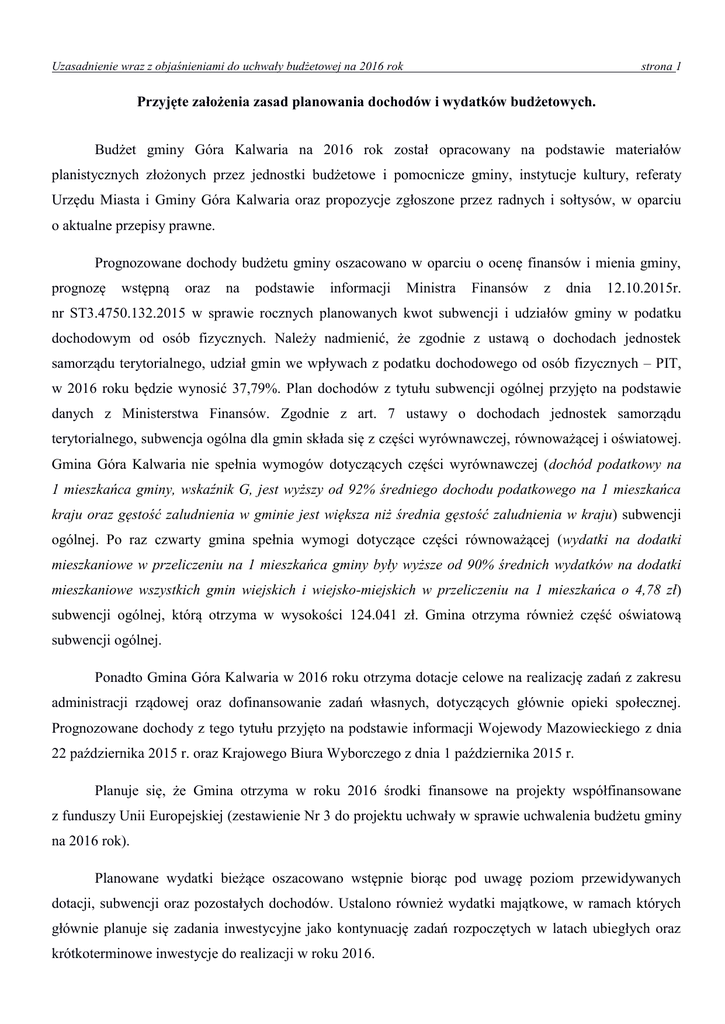 Uzasadnienie wraz z objaśnieniami do uchwały budżetowej na 2016 rok strona 1 Przyjęte założenia zasad planowania dochodów i wydatków budżetowych. Budżet gminy Góra Kalwaria na 2016 rok został opracowany na podstawie materiałów planistycznych złożonych przez jednostki budżetowe i pomocnicze gminy, instytucje kultury, referaty Urzędu Miasta i Gminy Góra Kalwaria oraz propozycje zgłoszone przez radnych i sołtysów, w oparciu o aktualne przepisy prawne. Prognozowane dochody budżetu gminy oszacowano w oparciu o ocenę finansów i mienia gminy, prognozę wstępną oraz na podstawie informacji Ministra Finansów z dnia 12.10.2015r. nr ST3.4750.132.2015 w sprawie rocznych planowanych kwot subwencji i udziałów gminy w podatku dochodowym od osób fizycznych. Należy nadmienić, że zgodnie z ustawą o dochodach jednostek samorządu terytorialnego, udział gmin we wpływach z podatku dochodowego od osób fizycznych – PIT, w 2016 roku będzie wynosić 37,79%. Plan dochodów z tytułu subwencji ogólnej przyjęto na podstawie danych z Ministerstwa Finansów. Zgodnie z art. 7 ustawy o dochodach jednostek samorządu terytorialnego, subwencja ogólna dla gmin składa się z części wyrównawczej, równoważącej i oświatowej. Gmina Góra Kalwaria nie spełnia wymogów dotyczących części wyrównawczej (dochód podatkowy na 1 mieszkańca gminy, wskaźnik G, jest wyższy od 92% średniego dochodu podatkowego na 1 mieszkańca kraju oraz gęstość zaludnienia w gminie jest większa niż średnia gęstość zaludnienia w kraju) subwencji ogólnej. Po raz czwarty gmina spełnia wymogi dotyczące części równoważącej (wydatki na dodatki mieszkaniowe w przeliczeniu na 1 mieszkańca gminy były wyższe od 90% średnich wydatków na dodatki mieszkaniowe wszystkich gmin wiejskich i wiejsko-miejskich w przeliczeniu na 1 mieszkańca o 4,78 zł) subwencji ogólnej, którą otrzyma w wysokości 124.041 zł. Gmina otrzyma również część oświatową subwencji ogólnej. Ponadto Gmina Góra Kalwaria w 2016 roku otrzyma dotacje celowe na realizację zadań z zakresu administracji rządowej oraz dofinansowanie zadań własnych, dotyczących głównie opieki społecznej. Prognozowane dochody z tego tytułu przyjęto na podstawie informacji Wojewody Mazowieckiego z dnia 22 października 2015 r. oraz Krajowego Biura Wyborczego z dnia 1 października 2015 r. Planuje się, że Gmina otrzyma w roku 2016 środki finansowe na projekty współfinansowane z funduszy Unii Europejskiej (zestawienie Nr 3 do projektu uchwały w sprawie uchwalenia budżetu gminy na 2016 rok). Planowane wydatki bieżące oszacowano wstępnie biorąc pod uwagę poziom przewidywanych dotacji, subwencji oraz pozostałych dochodów. Ustalono również wydatki majątkowe, w ramach których głównie planuje się zadania inwestycyjne jako kontynuację zadań rozpoczętych w latach ubiegłych oraz krótkoterminowe inwestycje do realizacji w roku 2016. Uzasadnienie wraz z objaśnieniami do uchwały budżetowej na 2016 rok strona 2 Na realizację gminnego programu Profilaktyki i Rozwiązywania Problemów Alkoholowych oraz Przeciwdziałania Narkomanii w Gminie Góra Kalwaria zabezpieczono środki wskazane w zestawieniu Nr 6 do projektu uchwały w sprawie przyjęcia budżetu gminy na 2016 rok. W założeniach projektu uwzględniono realizację wydatków w ramach Funduszu Sołeckiego – środki będące do dyspozycji jednostek pomocniczych gminy w 2016 roku określone są w zestawieniu Nr 11 do projektu uchwały w sprawie przyjęcia budżetu gminy na 2016 rok. Wniosek sołectwa Mikówiec został odrzucony ze względów merytorycznych. Sołtys nie skorzystał z przysługującego mu, na podstawie art. 5 ust. 6-8 ustawy o funduszu sołeckim, prawa. Wydatki realizowane w ramach ustawy o funduszu sołeckim, wyliczone zgodnie z art. 3 ust. 1 tej ustawy, ukształtowały się na poziomie 628.386 zł. Rada Miejska w dniu 27 czerwca 2014 r. podjęła Uchwałę Nr LVIII/638/2014 w sprawie określenia zasad zwiększania środków funduszu sołeckiego przypadających na poszczególne sołectwa. Po uwzględnieniu zapisów niniejszej Uchwały, środki będące do dyspozycji jednostek pomocniczych Gminy na 2016 rok ukształtowały się ostatecznie na poziomie 667.426 zł. Projekt budżetu na 2016 rok skonstruowano przy założeniu, iż roczny plan finansowy powinien zapewnić nie tylko realizację podstawowych zadań gminy, ale w sposób optymalny zabezpieczyć realizację wszystkich niezbędnych potrzeb mieszkańców (głównie z zakresu oświaty, opieki społecznej, ochrony zdrowia, edukacyjnej opieki wychowawczej, kultury, kultury fizycznej oraz bezpieczeństwa publicznego i ochrony przeciwpożarowej, oraz gospodarki komunalnej i ochrony środowiska). CHARAKTERYSTYKA DOCHODÓW BUDŻETU GMINY NA 2016 ROK Ogółem dochody budżetowe na 2016 rok zaplanowano w kwocie 96.648.162 zł , w tym: a/ bieżące b/majątkowe 91.278.162 zł 5.370.000 zł Na ogólną kwotę dochodów składają się: - dochody własne 66.040.536 zł - subwencja oświatowa i równoważąca 22.524.438 zł - dotacje 8.083.188 zł W poszczególnych dziedzinach życia społeczno-gospodarczego plan dochodów przedstawia się następująco: Uzasadnienie wraz z objaśnieniami do uchwały budżetowej na 2016 rok Dział 010 – Rolnictwo i łowiectwo strona 3 3.000 zł Dochody z tytułu czynszów za obwody łowieckie. Dział 700 - Gospodarka mieszkaniowa 9.441.110 zł Rozdział 70004 – różne jednostki obsługi gospodarki mieszkaniowej /ABK/ 2.251.110 zł Dochody otrzymane z czynszów za lokale mieszkalne, użytkowe, wpływy za wodę, ścieki, gaz i CO oraz dzierżawę terenu pod garaże. Rozdział 70005 -gospodarka gruntami i nieruchomościami 7.190.000 zł Dochody otrzymane z najmu, dzierżawy i sprzedaży składników majątkowych gminy oraz wpływów z opłat za użytkowanie wieczyste nieruchomości i wpłat z tytułu odpłatnego nabycia prawa własności nieruchomości. Doch