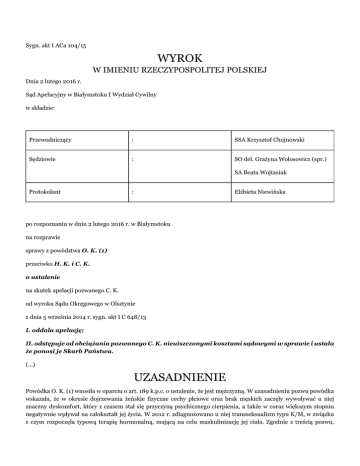 Sygn. akt I ACa 104/15 WYROK W IMIENIU RZECZYPOSPOLITEJ POLSKIEJ Dnia 2 lutego 2016 r. Sąd Apelacyjny w Białymstoku I Wydział Cywilny w składzie: Przewodniczący : SSA Krzysztof Chojnowski Sędziowie : SO del. Grażyna Wołosowicz (spr.) SA Beata Wojtasiak Protokolant : Elżbieta Niewińska po rozpoznaniu w dniu 2 lutego 2016 r. w Białymstoku na rozprawie sprawy z powództwa O. K. (1) przeciwko H. K. i C. K. o ustalenie na skutek apelacji pozwanego C. K. od wyroku Sądu Okręgowego w Olsztynie z dnia 5 września 2014 r. sygn. akt I C 648/13 I. oddala apelację; II. odstępuje od obciążania pozwanego C. K. nieuiszczonymi kosztami sądowymi w sprawie i ustala że ponosi je Skarb Państwa. (...) UZASADNIENIE Powódka O. K. (1) wnosiła w oparciu o art. 189 k.p.c. o ustalenie, że jest mężczyzną. W uzasadnieniu pozwu powódka wskazała, że w okresie dojrzewania żeńskie fizyczne cechy płciowe oraz brak męskich zaczęły wywoływać u niej znaczny dyskomfort, który z czasem stał się przyczyną psychicznego cierpienia, a także w coraz większym stopniu negatywnie wpływał na całokształt jej życia. W 2012 r. zdiagnozowano u niej transseksualizm typu K/M, w związku z czym rozpoczęła typową terapię hormonalną, mającą na celu maskulinizację jej ciała. Zgodnie z treścią pozwu, dotychczasowe zmiany w wyglądzie powódki pozytywnie wpłynęły na jej samopoczucie oraz komfort życia, jednak, aby w pełni akceptowała swoje ciało konieczna jest chirurgiczna korekta płci. Pozwany C. K. wniósł o oddalenie powództwa. Podnosił, że ideę zmiany płci zaszczepił w niej na studiach jej nauczyciel akademicki P. M.. Pozwany wielokrotnie podnosił, że powódka pozostaje pod wpływem lekarzy przekonujących ją o potrzebie zmiany płci, ona zaś potrzebuje psychoterapii zamiast proponowanych jej zabiegów operacyjnych. Zgodnie ze stanowiskiem pozwanego, nie jest prawdą, że powódka od najmłodszych lat czuła się nieswojo w swoim ciele i wolała towarzystwo chłopców. W jego ocenie powódka zawsze była dzieckiem wycofanym i pełnym kompleksów, a jej rzekome zainteresowanie zmianą płci jest jedynie chęcią „ukrycia się” pod nową postacią. Pozwana H. K. po ostatecznym sprecyzowaniu stanowiska w sprawie stwierdziła, że nie wnosi o oddalenie powództwa, albowiem powódka ma prawo decydować o sobie (k. 460 v.). Wyrokiem z 5 września 2014 r. Sąd Okręgowy w Olsztynie: ustalił, że powódka O. K. (1) urodzona (...) w O., jako córka C. i H., dla której sporządzono w Urzędzie Stanu Cywilnego w O. akt urodzenia za numerem (...), jest mężczyzną (punkt I.); nie obciążył pozwanych kosztami sądowymi na rzecz Skarbu Państwa (punkt II.) oraz przyznał biegłemu S. L. wynagrodzenie w kwocie 262,45 złotych za opinię dodatkową i 334,30 złotych tytułem wydatków, które nakazał wypłacić ze środków budżetowych Sądu Okręgowego w Olsztynie (punkt III.). Z ustaleń poczynionych przez Sąd Okręgowy wynikało, że powódka O. K. (1) urodziła się dnia (...) w O.. Jej matką jest pozwana H. K., ojcem natomiast C. K.. Powódka nie ma rodzeństwa (dowód: odpis zupełny aktu urodzenia – k. 8). Rozwój powódki jako dziecka przebiegał prawidłowo, nikt też z jej rodziny nie chorował psychicznie, ani nie nadużywał alkoholu. Powódka poszła do szkoły o czasie, nie powtarzała żadnej klasy i uczyła się bardzo dobrze. Była wychowywana przez matkę i babkę, z ojcem zaś widywała się rzadko, głównie w weekendy. Od kilku ostatnich lat relacje powódki z pozwanym pogorszyły, przede wszystkim z uwagi na to, iż córka nie chce utrzymywać kontaktów z ojcem. Z dalszych ustaleń Sądu i instancji wynikało, że wieku około 5 – 6 lat powódka poczuła pierwsze objawy świadczące o dysharmonii pomiędzy budową ciała a poczuciem płci, natomiast w pełni ujawniły się one w okresie dojrzewania (około 12 – 13 rok życia). W tym też czasie powódka po raz pierwszy zasygnalizowała matce – pozwanej o odczuwanym przez nią braku akceptacji dla własnej płci. W 2006 r. powódka poinformowała pozwaną, że jest osobą transseksualną i rozważa możliwość podjęcia w przyszłości działań zmierzających do zmiany płci. Od tego czasu powódka zaczęła nosić męską odzież, zmieniła chód oraz fryzurę. Mniej więcej rok później powódka oznajmiła pozwanej, że podjęła ostateczną decyzję o zmianie płci na męską. Sąd Okręgowy ustalił ponadto, że po zakończeniu nauki w liceum powódka rozpoczęła studia wyższe na kierunku filozofii na Uniwersytecie (...) w O.. W środowisku akademickim już na forum publicznym powódka coraz częściej funkcjonowała w roli męskiej, co przejawiało się m.in. w tym, iż prosiła o zwracanie się do niej w formie bezosobowej (sama zaś przeforsowała to by mogła podpisywać się na pracach pisemnych zamiast pełnego imienia i nazwiska jako „O. K.”) (dowód: dokumenty związane z okresem dzieciństwa i nauki powódki w postaci rysunków, zapisów, listów, fotografii itp. – k. 76-83, k. 106-132 i k. 248-330; zeznania świadka T. D. – k. 461; zeznania świadka P. M. – k. 461 v.-462 v.; zeznania O. K. (1) w charakterze strony powodowej – k. 464-465 v.; zeznania H. K. w charakterze strony pozwanej – k. 466 v.-467; częściowo zeznania C. K. w charakterze strony pozwanej – k. 465 v.-466 v.). W czasie studiów, a mianowicie w połowie roku 2011 r., powódka poinformowała pozwanego o swoich zamiarach związanych z dokonaniem zmiany płci. Wtedy też pozwany, mimo, że wcześniej był zaniepokojony zachowaniem swojej córki, po raz pierwszy powziął wiadomość o stwierdzonym u niej zespole dezaprobaty płci (dowód: zaświadczenie lekarskie – k. 7; wyniki badań i inna dokumentacja medyczna – k. 9-11; karta z poradni psychologicznej –k. 12; zaświadczenie lekarskie – k. 168; zeznania świadka P. M. – k. 461 v.-462 v.; zeznania świadka K. K. – k. 461-461 v.;