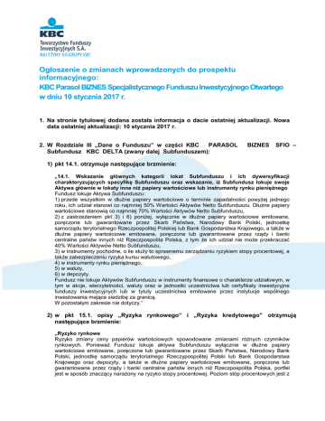Ogłoszenie o zmianach wprowadzonych do prospektu informacyjnego: KBC Parasol BIZNES Specjalistycznego Funduszu Inwestycyjnego Otwartego w dniu 10 stycznia 2017 r. 1. Na stronie tytułowej dodana została informacja o dacie ostatniej aktualizacji. Nowa data ostatniej aktualizacji: 10 stycznia 2017 r. 2. W Rozdziale III „Dane o Funduszu” w części KBC PARASOL Subfundusz KBC DELTA (zwany dalej Subfunduszem): BIZNES SFIO – 1) pkt 14.1. otrzymuje następujące brzmienie: „14.1. Wskazanie głównych kategorii lokat Subfunduszu i ich dywersyfikacji charakteryzujących specyfikę Subfunduszu oraz wskazanie, iż Subfundusz lokuje swoje Aktywa głównie w lokaty inne niż papiery wartościowe lub instrumenty rynku pieniężnego Fundusz lokuje Aktywa Subfunduszu: 1) przede wszystkim w dłużne papiery wartościowe o terminie zapadalności powyżej jednego roku, ich udział stanowi co najmniej 50% Wartości Aktywów Netto Subfunduszu. Dłużne papiery wartościowe stanowią co najmniej 70% Wartości Aktywów Netto Subfunduszu, 2) z zastrzeżeniem pkt 3) i 6) poniżej, wyłącznie w dłużne papiery wartościowe emitowane, poręczone lub gwarantowane przez Skarb Państwa, Narodowy Bank Polski, jednostkę samorządu terytorialnego Rzeczpospolitej Polskiej lub Bank Gospodarstwa Krajowego, a także w dłużne papiery wartościowe emitowane, poręczone lub gwarantowane przez rządy i banki centralne państw innych niż Rzeczpospolita Polska, z tym że ich udział nie może przekraczać 40% Wartości Aktywów Netto Subfunduszu, 3) w instrumenty pochodne, o ile służy to sprawnemu zarządzaniu ryzykiem stopy procentowej, a także zabezpieczeniu ryzyka kursu walutowego, 4) w instrumenty rynku pieniężnego, 5) w waluty, 6) w depozyty. Fundusz nie lokuje Aktywów Subfunduszu w instrumenty finansowe o charakterze udziałowym, w tym w akcje, wierzytelności, waluty oraz w jednostki uczestnictwa lub certyfikaty inwestycyjne funduszy inwestycyjnych lub w tytuły uczestnictwa emitowane przez instytucje wspólnego inwestowania mające siedzibę za granicą. W pozostałym zakresie nie dotyczy.” 2) w pkt 15.1. opisy „Ryzyka rynkowego” i „Ryzyka kredytowego” otrzymują następujące brzmienie: „Ryzyko rynkowe Ryzyko zmiany ceny papierów wartościowych spowodowane zmianami różnych czynników rynkowych. Ponieważ Fundusz lokuje aktywa Subfunduszu wyłącznie w dłużne papiery wartościowe emitowane, poręczone lub gwarantowane przez Skarb Państwa, Narodowy Bank Polski, jednostkę samorządu terytorialnego Rzeczypospolitej Polski lub Bank Gospodarstwa Krajowego oraz depozyty, a także w dłużne papiery wartościowe emitowane, poręczone lub gwarantowane przez rządy i banki centralne państw innych niż Rzeczpospolita Polska, portfel jest w sposób znaczący narażony na ryzyko stopy procentowej. Poziom stóp procentowych jest z kolei pochodną sytuacji gospodarczej, politycznej i uwarunkowań prawnych danego kraju oraz oczekiwań inwestorów, co do przyszłości powyższych czynników. Ryzyko kredytowe Fundusz dokonuje lokat Subfunduszu w depozyty stąd w tym przypadku Fundusz narażony jest na ryzyko niewypłacalności banków będących stroną umów lokat bankowych. Fundusz lokuje aktywa Subfunduszu w dłużne papiery wartościowe emitowane, poręczone lub gwarantowane przez Skarb Państwa, Narodowy Bank Polski, jednostkę samorządu terytorialnego Rzeczypospolitej Polski lub Bank Gospodarstwa Krajowego, a także przez rządy i banki centralne państw innych niż Rzeczpospolita Polska. Zmiana postrzegania wiarygodności kredytowej danego emitenta może prowadzić do zmian w cenach instrumentów będących przedmiotem lokat Subfunduszu.” 3) w pkt 17 dodane zostało nowe oświadczenie podmiotu uprawnionego do badania sprawozdań finansowych o zgodności metod i zasad wyceny aktywów funduszu opisanych w prospekcie informacyjnym z przepisami dotyczącymi rachunkowości funduszy inwestycyjnych, a także o zgodności i kompletności tych zasad z przyjętą przez fundusz polityką inwestycyjną, które zastąpiło wcześniejsze oświadczenie. 3. W Rozdziale III „Dane o Funduszu” w części KBC PARASOL BIZNES SFIO – Subfundusz KBC GAMMA (zwany dalej Subfunduszem) w pkt 17 dodane zostało nowe oświadczenie podmiotu uprawnionego do badania sprawozdań finansowych o zgodności metod i zasad wyceny aktywów funduszu opisanych w prospekcie informacyjnym z przepisami dotyczącymi rachunkowości funduszy inwestycyjnych, a także o zgodności i kompletności tych zasad z przyjętą przez fundusz polityką inwestycyjną, które zastąpiło wcześniejsze oświadczenie. 4. W Rozdziale III „Dane o Funduszu” w części KBC PARASOL BIZNES SFIO – Subfundusz KBC SIGMA Obligacji Plus (zwany dalej Subfunduszem) w pkt 18 dodane zostało nowe oświadczenie podmiotu uprawnionego do badania sprawozdań finansowych o zgodności metod i zasad wyceny aktywów funduszu opisanych w prospekcie informacyjnym z przepisami dotyczącymi rachunkowości funduszy inwestycyjnych, a także o zgodności i kompletności tych zasad z przyjętą przez fundusz polityką inwestycyjną, które zastąpiło wcześniejsze oświadczenie. 5. W Rozdziale V „Dane o podmiotach obsługujących Fundusz” w lit. B wykreślony zostaje pkt 1.4., a ppkt od 1.5. do 1.20. otrzymują numerację od 1.4. do 1.19. 2 -2-