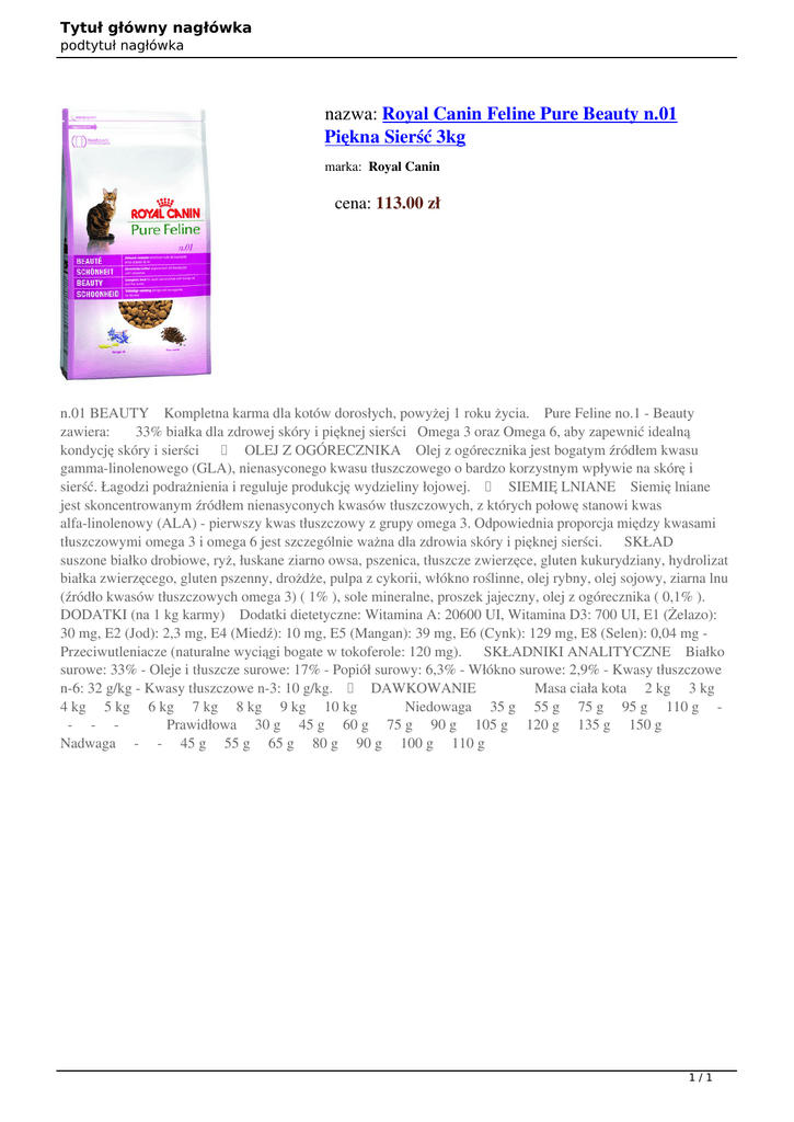 Tytuł główny nagłówka podtytuł nagłówka nazwa: Royal Canin Feline Pure Beauty n.01 Piękna Sierść 3kg marka: Royal Canin cena: 113.00 zł n.01 BEAUTY Kompletna karma dla kotów dorosłych, powyżej 1 roku życia. Pure Feline no.1 - Beauty zawiera: 33% białka dla zdrowej skóry i pięknej sierści Omega 3 oraz Omega 6, aby zapewnić idealną kondycję skóry i sierści OLEJ Z OGÓRECZNIKA Olej z ogórecznika jest bogatym źródłem kwasu gamma-linolenowego (GLA), nienasyconego kwasu tłuszczowego o bardzo korzystnym wpływie na skórę i sierść. Łagodzi podrażnienia i reguluje produkcję wydzieliny łojowej. SIEMIĘ LNIANE Siemię lniane jest skoncentrowanym źródłem nienasyconych kwasów tłuszczowych, z których połowę stanowi kwas alfa-linolenowy (ALA) - pierwszy kwas tłuszczowy z grupy omega 3. Odpowiednia proporcja między kwasami tłuszczowymi omega 3 i omega 6 jest szczególnie ważna dla zdrowia skóry i pięknej sierści. SKŁAD suszone białko drobiowe, ryż, łuskane ziarno owsa, pszenica, tłuszcze zwierzęce, gluten kukurydziany, hydrolizat białka zwierzęcego, gluten pszenny, drożdże, pulpa z cykorii, włókno roślinne, olej rybny, olej sojowy, ziarna lnu (źródło kwasów tłuszczowych omega 3) ( 1% ), sole mineralne, proszek jajeczny, olej z ogórecznika ( 0,1% ). DODATKI (na 1 kg karmy) Dodatki dietetyczne: Witamina A: 20600 UI, Witamina D3: 700 UI, E1 (Żelazo): 30 mg, E2 (Jod): 2,3 mg, E4 (Miedź): 10 mg, E5 (Mangan): 39 mg, E6 (Cynk): 129 mg, E8 (Selen): 0,04 mg Przeciwutleniacze (naturalne wyciągi bogate w tokoferole: 120 mg). SKŁADNIKI ANALITYCZNE Białko surowe: 33% - Oleje i tłuszcze surowe: 17% - Popiół surowy: 6,3% - Włókno surowe: 2,9% - Kwasy tłuszczowe n-6: 32 g/kg - Kwasy tłuszczowe n-3: 10 g/kg. DAWKOWANIE Masa ciała kota 2 kg 3 kg 4 kg 5 kg 6 kg 7 kg 8 kg 9 kg 10 kg Niedowaga 35 g 55 g 75 g 95 g 110 g - - Prawidłowa 30 g 45 g 60 g 75 g 90 g 105 g 120 g 135 g 150 g Nadwaga - - 45 g 55 g 65 g 80 g 90 g 100 g 110 g 1/1