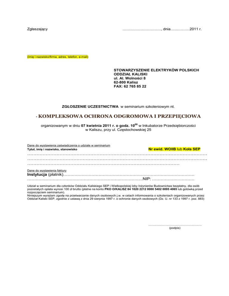 Zgłaszający …………………………, dnia……………2011 r. __________________________ (imię i nazwisko/firma, adres, telefon, e-mail) STOWARZYSZENIE ELEKTRYKÓW POLSKICH ODDZIAŁ KALISKI ul. Al. Wolności 8 62-800 Kalisz FAX: 62 765 85 22 ZGŁOSZENIE UCZESTNICTWA w seminarium szkoleniowym nt. - KOMPLEKSOWA OCHRONA ODGROMOWA I PRZEPIĘCIOWA 00 organizowanym w dniu 07 kwietnia 2011 r. o godz. 10 w Inkubatorze Przedsiębiorczości w Kaliszu, przy ul. Częstochowskiej 25 Dane do wystawienia zaświadczenia o udziale w seminarium Tytuł, imię i nazwisko, stanowisko Nr ewid. WOIIB lub Koła SEP ……………………………………………………………………………………………………… ……………………………………………………………………………………………………… ……………………………………………………………………………………… Dane do wystawienia faktury Instytucja (płatnik)………………………………………………………………………………… ……………………………………………………………………….NIP: ………………………… Udział w seminarium dla członków Oddziału Kaliskiego SEP i Wielkopolskiej Izby Inżynierów Budownictwa bezpłatny, dla osób pozostałych opłata wynosi 100 zł brutto (płatne na konto PKO O/KALISZ 84 1020 2212 0000 5402 0095 4065 lub gotówką przed rozpoczęciem seminarium). Niniejszym wyrażam zgodę na przetwarzanie danych osobowych j.w. w celach informowania o szkoleniach organizowanych przez Oddział Kaliski SEP, zgodnie z ustawą z dnia 29 sierpnia 1997 r. o ochronie danych osobowych (Dz. U. nr 133 z 1997 r. poz. 883) …….……………………………………… (podpis)