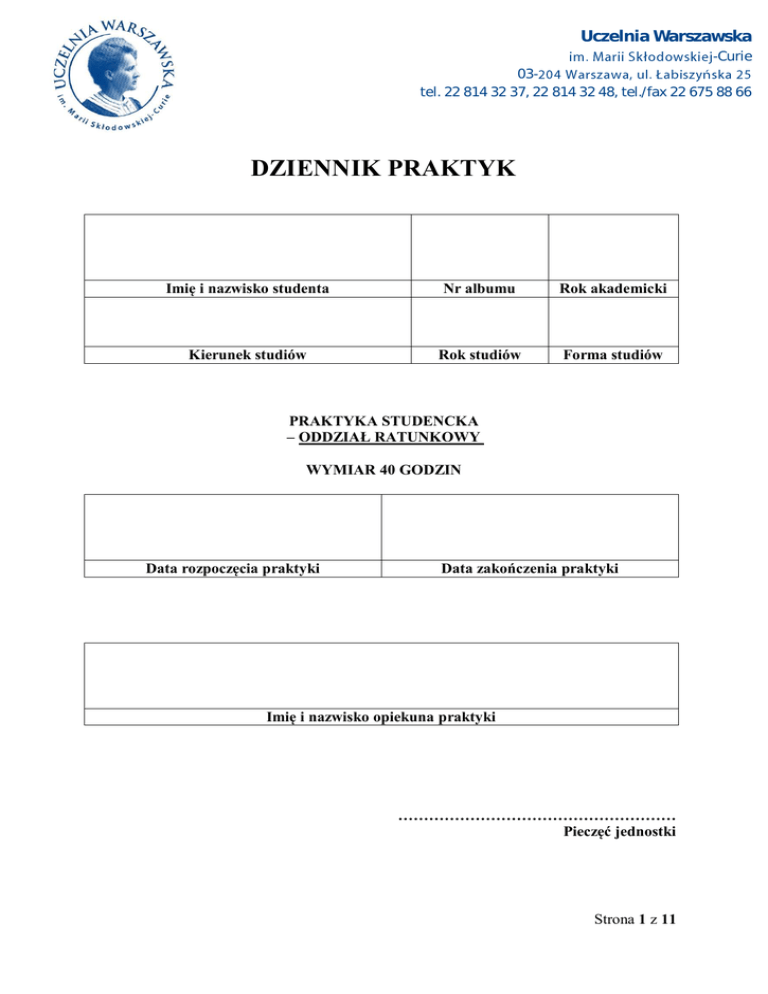 Uczelnia Warszawska -Curie 03tel. 22 814 32 37, 22 814 32 48, tel./fax 22 675 88 66 DZIENNIK PRAKTYK Imię i nazwisko studenta Nr albumu Rok akademicki Kierunek studiów Rok studiów Forma studiów PRAKTYKA STUDENCKA – ODDZIAŁ RATUNKOWY WYMIAR 40 GODZIN Data rozpoczęcia praktyki Data zakończenia praktyki Imię i nazwisko opiekuna praktyki ……………………………………………… Pieczęć jednostki Strona 1 z 11 ODDZIAŁ RATUNKOWY Rodzaj i czas trwania Obowiązkowa praktyka studencka przewidziana w kształceniu dla kierunku ratownictwo medyczne realizowana praktyki zawodowej z zakresu medycyny ratunkowej. Czas trwania: 40 godzin (1 tydzień) - III rok, 6 semestr Liczba punktów ECTS: 2 Szczegółowo: Miejsce praktyki • szpitalny oddział ratunkowy (ogólny lub pediatryczny) • klinika/katedra medycyny ratunkowej (ogólna lub pediatryczna) Celem praktyk jest: Cele ogólne kształcenia 1. kształcenie praktycznych umiejętności niezbędnych do udzielania świadczeń w oddziałach ratunkowych; 2. poznanie zasad funkcjonowania, planowania, dokumentowania i archiwizacji danych w oddziale ratunkowym. Informacje ogólne 1. W czasie realizacji praktyk studenta obowiązuje Regulamin praktyk zawodowych na kierunku ratownictwo medyczne przyjęty w UWMSC oraz przepisy obowiązujące w placówce realizującej praktykę. 2. W czasie praktyki studenckiej osobą wyznaczającą zadania do realizacji jest opiekun praktyk, posiadający co najmniej tytuł zawodowy magistra i co najmniej roczne doświadczenie zawodowe zgodne z tematyką praktyk. 3. Potwierdzeniem odbycia praktyk jest wystawione zaświadczenie o odbyciu praktyk. Poszczególne umiejętności realizowane przez studenta powinny zostać poświadczone w Dzienniku praktyk. Student jest zobowiązany do złożenia w Dziekanacie UWMSC powyższych dokumentów poświadczających odbycie praktyki w nieprzekraczalnym terminie ustalonym przez Władze INM. 4. Informacje dotyczące obowiązującego stroju na praktykach: strój zgodny z wymogami placówki, identyfikator UWMSC. 5. Ubezpieczenie na czas praktyk: NNW i OC. Student powinien: uczestniczyć we wszystkich zajęciach w liczbie godzin, wykonywać czynności zgodnie ze zleceniem, prowadzić dokumentację zgodną z profilem jednostki, odrobić nieobecności z powodu choroby lub innych przyczyn losowych, które muszą być usprawiedliwione formalnym zwolnieniem lekarskim. Strona 2 z 11 ZAKRES TEMATYCZNY 1. Organizacja, funkcjonowanie, dokumentacja w oddziale ratunkowym. 2. Ocena stanu pacjenta w celu ustalenia postępowania i decyzji o podjęciu lub odstąpieniu od medycznych czynności ratunkowych. 3. Układanie pacjenta w pozycji właściwej dla stanu pacjenta lub odniesionych obrażeń. 4. Podjęcie i prowadzenie podstawowej i zaawansowanej resuscytacji krążeniowo- oddechowej u dorosłych i dzieci 5. Bezprzyrządowe przywracanie drożności dróg oddechowych. 6. Przyrządowe przywracanie i zabezpieczanie drożności dróg oddechowych z zastosowaniem w szczególności rurki ustno-gardłowej, rurki nosowo- gardłowej, maski krtaniowej, rurki krtaniowej, konikopunkcji. 7. Odsysanie dróg oddechowych. 8. Podjęcie tlenoterapii biernej lub wspomagania oddechu lub wentylacji zastępczej powietrzem lub tlenem. 9. Intubacja dotchawicza w laryngoskopii bezpośredniej w nagłym zatrzymaniu krążenia przez usta lub przez nos, bez użycia środków zwiotczających oraz prowadzenie wentylacji zastępczej. 10. Wykonanie defibrylacji ręcznej na podstawie EKG. 11. Wykonanie defibrylacji zautomatyzowanej. 12. Wykonanie EKG. 13. Monitorowanie czynności układu oddechowego. 14. Monitorowanie czynności układu krążenia metodami nieinwazyjnymi. 15. Wykonanie kaniulacji żył obwodowych kończyn górnych i dolnych oraz żyły szyjnej zewnętrznej. 16. Wykonanie dojścia doszpikowego przy użyciu gotowego zestawu. 17. Podawanie leków drogą dożylną, domięśniową, podskórną, dotchawiczą, doustną, doodbytniczą i wziewną oraz doszpikową, przy użyciu gotowego zestawu. 18. Odbarczenie odmy prężnej drogą nakłucia jamy opłucnowej. 19. Pobieranie krwi żylnej i włośniczkowej do badań laboratoryjnych. 20. Oznaczanie poziomu parametrów krytycznych z użyciem dostępnego sprzętu, w tym w szczególności poziomu glukozy w surowicy, poziomu elektrolitów w surowicy, badania gazometrycznego krwi włośniczkowej. 21. Opatrywanie ran. 22. Tamowanie krwotoków. 23. Unieruchamianie złamań, zwichnięć i skręceń. 24. Unieruchamianie kręgosłupa ze szczególnym uwzględnieniem odcinka szyjnego. 25. Odebranie porodu nagłego. 26. Triage wewnątrzszpitalny. 27. Podejmowanie działań zabezpieczających w celu ograniczenia skutków zdrowotnych zdarzenia. 28. Przygotowanie pacjenta i opieka medyczna podczas transportu. 29. Podawanie leków dogodną (zleconą) drogą. 30. Intubacja dotchawicza w laryngoskopii bezpośredniej w przypadku innym niż nagłe zatrzymanie krążenia z użyciem środków zwiotczających. 31. Wykonywanie kardiowersji elektrycznej i elektrostymulacji zewnętrznej. 32. Asystowanie przy drobnych zabiegach chirurgicznych (zszywanie ran, zakładanie drenów) i innych procedurach medycznych. 33. Cewnikowanie pęcherza moczowego. 34. Zakładanie sondy żołądkowej i płukanie żołądka. 35. Nauka zabiegów w zakresie higieny osobistej i pielęgnowania chorego. 36. Przygotowanie pacjenta do badań diagnostycznych i zabiegów leczniczych. Strona 3 z 11 PRZEBIEG PRAKTYKI STUDENCKIEJ Szczegółowy opis zadań realizowanych w ramach praktyki. ...................................................... podpis opiekuna Strona 4 z 11 KRYTERIA OCENY STUDENTA W TRAKCIE ODBYWANIA PRAKTYKI 1. Zakres tematyczny praktyk powinien zostać opanowany. 2. Student powinien prezentować wysoki poziom zaangażowania w trakcie wykonywania zadań zleconych przez opiekuna praktyk. 3. Każdy efekt kształcenia musi zostać osiągnięty oraz poświadczony przez opiekuna praktyk swoim podpisem. 4. Opiek