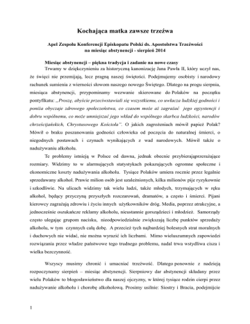 Kochająca matka zawsze trzeźwa Apel Zespołu Konferencji Episkopatu Polski ds. Apostolstwa Trzeźwości na miesiąc abstynencji - sierpień 2014 Miesiąc abstynencji – piękna tradycja i zadanie na nowe czasy Trwamy w dziękczynieniu za historyczną kanonizację Jana Pawła II, który uczył nas, że święci nie przemijają, lecz pragną naszej świętości. Podejmujemy osobisty i narodowy rachunek sumienia z wierności słowom naszego nowego Świętego. Dlatego na progu sierpnia, miesiąca abstynencji, przypominamy wezwanie skierowane do Polaków na początku pontyfikatu: „Proszę, abyście przeciwstawiali się wszystkiemu, co uwłacza ludzkiej godności i poniża obyczaje zdrowego społeczeństwa, co czasem może aż zagrażać jego egzystencji i dobru wspólnemu, co może umniejszać jego wkład do wspólnego skarbca ludzkości, narodów chrześcijańskich, Chrystusowego Kościoła”. O jakich zagrożeniach mówił papież Polak? Mówił o braku poszanowania godności człowieka od poczęcia do naturalnej śmierci, o niegodnych postawach i czynach wynikających z wad narodowych. Mówił także o nadużywaniu alkoholu. Te problemy istnieją w Polsce od dawna, jednak obecnie przybierająprzerażające rozmiary. Widzimy to w alarmujących statystykach pokazujących ogromne społeczne i ekonomiczne koszty nadużywania alkoholu. Tysiące Polaków umiera rocznie przez legalnie sprzedawany alkohol. Prawie milion osób jest uzależnionych, kilka milionów pije ryzykownie i szkodliwie. Na ulicach widzimy tak wielu ludzi, także młodych, trzymających w ręku alkohol, będący przyczyną przyszłych rozczarowań, dramatów, a często i śmierci. Pijani kierowcy zagrażają zdrowiu i życiu innych użytkowników dróg. Media, poprzez atrakcyjne, a jednocześnie oszukańcze reklamy alkoholu, nieustannie gorsządzieci i młodzież. Samorządy często ulegając grupom nacisku, nieodpowiedzialnie zwiększają liczbę punktów sprzedaży alkoholu, w tym czynnych całą dobę. A przecież tych najbardziej bolesnych strat moralnych i duchowych nie widać, nie można wyrazić ich liczbami. Mimo wieluszumnych zapowiedzi rozwiązania przez władze państwowe tego trudnego problemu, nadal trwa wstydliwa cisza i wielka bezczynność. Wszyscy musimy chronić i umacniać trzeźwość. Dlatego ponownie z nadzieją rozpoczynamy sierpień – miesiąc abstynencji. Sierpniowy dar abstynencji składany przez wielu Polaków to błogosławieństwo dla naszej ojczyzny, w której tysiące rodzin cierpi przez nadużywanie alkoholu i chorobę alkoholową. Prosimy usilnie: Siostry i Bracia, podejmijcie 1 dobrowolną abstynencję. Pokażcie, że nie jesteście zakładnikami chwytliwych, lecz nieprawdziwych sloganów reklamowych i szkodliwych nawyków. Pokażcie, że jesteście mądrzy, wolni, odpowiedzialni i odważni. Od lat przypominamy, że rodzina jest najważniejszą szkołą trzeźwości, jest ostoją w budowaniu trzeźwego społeczeństwa. Przed rokiem mówiliśmy o ojcach. Podkreślaliśmy, że powinni być świadkami wiary i trzeźwości. W tym roku naszą uwagę poświęcamy matkom. Mówimy: Kochająca matka jest zawsze trzeźwa! Kochająca matka dba o trzeźwość rodziny i dzieci! Kochająca matka pomaga budować trzeźwe społeczeństwo! Troska o życie i zdrowie dziecka od poczęcia Od pierwszych chwil życia dziecka kobieta staje się strażniczką jego zdrowia. To ona przez pierwszych dziewięć miesięcy istnienia jest dla niego domem i schronieniem. Podczas ciąży nawet niewielka ilość alkoholu wypitego przez matkę może bardzo poważnie zaszkodzić dziecku, zadziałać toksycznie na jego rozwijający się organizm. Im większa ilość alkoholu, tym większe jest ryzyko poważnych uszkodzeń. Szkody wyrządzone przez alkohol znane pod nazwą Alkoholowego Zespołu Płodowego (tzw. Zespołu FAS –Fetal Alcohol Syndrome), mają poważne konsekwencje zarówno w sferze fizycznego, jak i psychicznego rozwoju dziecka. FAS jest chorobą nieuleczalną, która trwa do końca życia człowieka, a której można całkowicie uniknąć zachowując abstynencję w okresie oczekiwania na narodziny dziecka. Gdyby nienarodzone dzieci mogły mówić, to prosiłyby, wręcz wołałyby z wielką mocą: „Mamo, nigdy nie pij za moje zdrowie!”. Duchowni, lekarze, pielęgniarki i położne mają obowiązek przestrzegać matki przed skutkami picia alkoholu w ciąży. A zadaniem ojców, najbliższej rodziny i przyjaciół jest wspieranie kobiet w ciąży w zachowywaniu całkowitej abstynencji od alkoholu. Pokażmy wszyscy, że potrafimy być odpowiedzialni za życie i zdrowie innych, zwłaszcza tych najbardziej bezbronnych, nienarodzonych. Misją matki – prowadzenie dzieci do bliskości z Jezusem Przejawem kobiecego geniuszu jest wielka wrażliwość i gotowość do chronienia dziecka przed wszelkimi zagrożeniami.Matki przez swą obecność, miłość i czułość chronią najmniejsze dzieci przed światem zewnętrznym oraz przed wewnętrznymi niepokojami. One budują poczucie bezpieczeństwa, otwartość na wiarę, nadzieję i miłość. Najlepszą 2 wychowawczynią jest matka dobra, mądra i szczęśliwa, która bardziej swoim przykładem życia niż słowami pozytywnie wpływa na męża i dzieci. Mądra matka rozumie, że dzieci sięgają po alkohol nie tylko z ciekawości. Czynią tak, ponieważ w jakimś stopniu nie radzą sobie z życiem, z emocjami, z własnymi słabościami. Ona wie, że sięganie po alkohol nawet w najmniejszych ilościach przez dzieci czy młodzież to szybka droga do uzależnienia i zablokowania ich rozwoju fizycznego, psychicznego, duchowego, religijnego, moralnego i społecznego. Mądra matka nie ulega nieodpowiedzialnym reklamom, które zachęcają do sięgania po alkohol, które tworzą proalkoholową mentalność. Ona uczy, jak pięknie i szczęśliwie żyć bez substancji uzależniających. Daje wraz z ojcem przykład świętowania i dobrej zabawy bez alkoholu. To rodzice uczą 