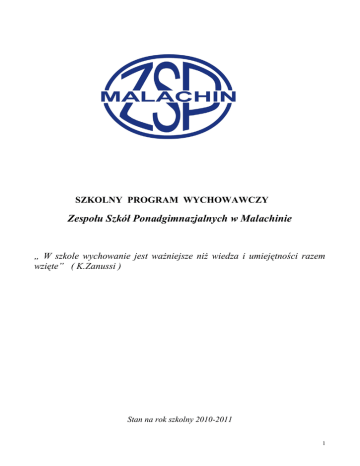 SZKOLNY PROGRAM WYCHOWAWCZY Zespołu Szkół Ponadgimnazjalnych w Malachinie „ W szkole wychowanie jest ważniejsze niż wiedza i umiejętności razem wzięte” ( K.Zanussi ) Stan na rok szkolny 2010-2011 1 WSTĘP Wychowanie określamy jako całokształt zabiegów mających na celu kształtowanie człowieka pod względem fizycznym, moralnym i intelektualnym oraz przygotowanie go do życia w społeczeństwie. Celem procesu wychowawczego jest kształtowanie pełnej osobowości, wrażliwej intelektualnie i społecznie, dążącej do ciągłego doskonalenia się do pogłębiania wiedzy i podnoszenia kwalifikacji samowychowania, samo wykształcenia, a więc wyposażenie w niezbędne do tego kompetencje. W realizacji programu ważne jest kształtowanie pozytywnych postaw / lub zmiana negatywnych zachowań na pozytywne/, a ich utrwalenie można przyjąć za jedną z form procesu wychowania. PROGRAM WYCHOWAWCZY SZKOŁY 1. Zadanie szkoły w zakresie wychowania a/ zadanie ogólne b/ zadanie szczegółowe 2. Założenia wychowawcze szkoły 3. Treści wychowawcze szkoły 4. Organizacja i tematyka godzin do dyspozycji wychowawców 5. Formy i zasady współpracy wychowawcy klasy z rodzicami 6. Cele i zadanie samorządu uczniowskiego 7. Program działań przeciwstawiających się złu, zagrożeniu i patologii 8. Szkolny system zajęć rozwijających talenty i zainteresowanie a/ zajęcia i imprezy sportowe b/ biblioteka szkolna itp. 9. Rytuał szkolny – imprezy i uroczystości klasowe i ogólnoszkolne 10.Współpraca szkoły ze środowiskiem 2 Rozdział I Zadania szkoły w zakresie wychowania Zadania ogólne Nauczyciele w swojej pracy wychowawczej, wspierając w tym zakresie obowiązki rodziców, winni zmierzać do tego, aby uczniowie w szczególności: 1/ Znajdowali w szkole środowisko wszechstronnego rozwoju osobowego/ w wymiarze intelektualnym, psychicznym, społecznym, zdrowotnym, estetycznym, moralnym, duchowym/. 2/ Rozwijali w sobie dociekliwość poznawczą ukierunkowaną na poszukiwaniu prawdy, dobra i piękna w świecie. 3/ Mieli świadomość życiowej użyteczności zarówno poszczególnych przedmiotów szkolnych jak i całej edukacji. 4/ Stawali się coraz bardziej samodzielni w dążeniu do dobra w jego wymiarze indywidualnym i społecznym, godząc umiejętne dążenie do dobra własnego z dobrem innych, odpowiedzialność za siebie i odpowiedzialność za innych, wolność własną z wolnością innych. 5/ Poszukiwali, odkrywali i dążyli na drodze rzetelnej pracy do osiągnięcia wszelkich leków życiowych i wartości ważnych dla odnalezienia własnego miejsca w świecie. 6/ Uczyli się szacunku dla dobra wspólnego jako podstawy życia społecznego oraz przygotowywali się do życia w rodzinie , w społeczności i w państwie w duchu przekazu dziedzictwa kulturowego i kształtowania postaw patriotycznych. 7/ Przygotowywali się do rozpoznawania wartości moralnych, dokonywanie wyborów i hierarchii wartości oraz mieli możliwości doskonalenia się. 8/ Kształtowali w sobie postawę dialogu, umieli współdziałać i współtworzyć w szkole wspólnotę nauczycieli i uczniów. Zadania szczegółowe 1/ Czynny udział w życiu społecznym – młodzież i środowisko społeczne a/ rozwijamy współpracę ze środowiskiem codziennym b/ podnosimy poziom wiedzy i umiejętności uczniów c/ kształtujemy zainteresowanie czytelnicze d/ przygotowujemy się do życia w rodzinie i społeczeństwie - kultura życia codziennego - rozwijamy zainteresowanie sprawami rodziny e/ kształtowanie nawyków kultury przed i w czasie zajęć lekcyjnych f/ bierzemy udział w życiu kulturalnym i rozrywkowym g/ działamy na rzecz ochrony środowiska 3 h/ wdrażamy do życia w demokracji 2/ Człowiek – istota ludzka a/ umiejętność skutecznej komunikacji w rodzinie b/ wartości codzienne związane z wartościami kulturowymi wspólnoty lokalnej c/ podstawowe zasady i reguły obowiązujące w relacjach międzyludzkich, pomoc osobom niepełnosprawnym, obłożnie chorym i w wieku podeszłym, udzielanie pierwszej pomocy d/ prawidłowy rozwój emocjonalny i społeczny w tym koleżeństwo i przyjaźń e/ ambitność i systematyczność młodzieży oraz organizowanie czasu wolnego f/ podstawy patriotyczne związane z tożsamością kultury regionalnej poprzez przyznawanie najbliższego otoczenia i specyfiki swojego regionu g/ działanie na rzecz środowiska naturalnego , odpowiednie zachowanie w domu i w szkole 3/ Życie w epoce przemian a/ żyję w epoce przemian włączam się do nich b/ obserwujemy swoje zachowanie w różnych sytuacjach c/ mam swoje miejsce w zespole klasowym d/ jestem częścią natury e/ dążę do bycia zdrowym f/ wiem jak żyć z ludźmi g/ dbam o mój rozwój intelektualny i emocjonalny h/ umiem być operatywny i przedsiębiorczy - przygotowuję moją propozycję do planu wychowawczego klasy - godz. wychowawczej , gazetki , przygotowuje wywiadówkę prezentując mocne i słabe strony i klasy 4/ Człowiek w kulturze europejskiej a/ poszukiwanie naszego miejsca w kulturze europejskiej, kształtowanie świadomości zmienności etapów i kolei życia ludzkiego b/ rozpoznawanie własnych mocnych i słabych stron zalet i wad c/ uwrażliwianie na wartości ponadczasowe wobec postępu cywilizacyjnego i technicznego d/ poznawanie różnorodności świata przy wykorzystaniu środków audiowizualnych e/ zwiedzanie naszego kraju 5/ Zrozumieć jakie jest miejsce i rola człowieka we własnych świecie a/ człowiek i jego emocje b/ prawa człowieka c/ człowiek we współczesnym świecie 4 Rozdział II Założenie wychowawcze szkoły. Działania wychowawcze szkoły opierać się będą na założeniach pedagogiki personalistycznej. Celem działalności dydaktyczno-wychowawczej szkoły jest wykształcenie ucznia zespołu pozytywnych cech, do których należą: - samodzielność - otwartość - odpowiedzialność - ciekawość świata - krytycyzm - równowaga - prawność - tolerancja - sumiennoś