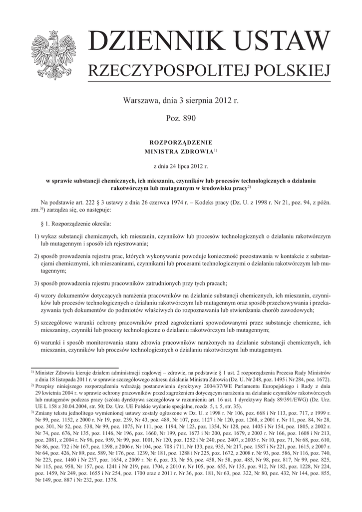 DZIENNIK USTAW RZECZYPOSPOLITEJ POLSKIEJ Warszawa, dnia 3 sierpnia 2012 r. Poz. 890 ROZPORZĄDZENIE MINISTRA ZDROWIA 1) z dnia 24 lipca 2012 r. w sprawie substancji chemicznych, ich mieszanin, czynników lub procesów technologicznych o działaniu rakotwórczym lub mutagennym w środowisku pracy2) Na podstawie art. 222 § 3 ustawy z dnia 26 czerwca 1974 r. – Kodeks pracy (Dz. U. z 1998 r. Nr 21, poz. 94, z późn. zm.3)) zarządza się, co następuje: § 1. Rozporządzenie określa: 1) wykaz substancji chemicznych, ich mieszanin, czynników lub procesów technologicznych o działaniu rakotwórczym lub mutagennym i sposób ich rejestrowania; 2) sposób prowadzenia rejestru prac, których wykonywanie powoduje konieczność pozostawania w kontakcie z substancjami chemicznymi, ich mieszaninami, czynnikami lub procesami technologicznymi o działaniu rakotwórczym lub mutagennym; 3) sposób prowadzenia rejestru pracowników zatrudnionych przy tych pracach; 4) wzory dokumentów dotyczących narażenia pracowników na działanie substancji chemicznych, ich mieszanin, czynników lub procesów technologicznych o działaniu rakotwórczym lub mutagennym oraz sposób przechowywania i przekazywania tych dokumentów do podmiotów właściwych do rozpoznawania lub stwierdzania chorób zawodowych; 5) szczegółowe warunki ochrony pracowników przed zagrożeniami spowodowanymi przez substancje chemiczne, ich mieszaniny, czynniki lub procesy technologiczne o działaniu rakotwórczym lub mutagennym; 6) warunki i sposób monitorowania stanu zdrowia pracowników narażonych na działanie substancji chemicznych, ich mieszanin, czynników lub procesów technologicznych o działaniu rakotwórczym lub mutagennym. inister Zdrowia kieruje działem administracji rządowej – zdrowie, na podstawie § 1 ust. 2 rozporządzenia Prezesa Rady Ministrów M z dnia 18 listopada 2011 r. w sprawie szczegółowego zakresu działania Ministra Zdrowia (Dz. U. Nr 248, poz. 1495 i Nr 284, poz. 1672). 2) Przepisy niniejszego rozporządzenia wdrażają postanowienia dyrektywy 2004/37/WE Parlamentu Europejskiego i Rady z dnia 29 kwietnia 2004 r. w sprawie ochrony pracowników przed zagrożeniem dotyczącym narażenia na działanie czynników rakotwórczych lub mutagenów podczas pracy (szósta dyrektywa szczegółowa w rozumieniu art. 16 ust. 1 dyrektywy Rady 89/391/EWG) (Dz. Urz. UE L 158 z 30.04.2004, str. 50; Dz. Urz. UE Polskie wydanie specjalne, rozdz. 5, t. 5, str. 35). 3) Zmiany tekstu jednolitego wymienionej ustawy zostały ogłoszone w Dz. U. z 1998 r. Nr 106, poz. 668 i Nr 113, poz. 717, z 1999 r. Nr 99, poz. 1152, z 2000 r. Nr 19, poz. 239, Nr 43, poz. 489, Nr 107, poz. 1127 i Nr 120, poz. 1268, z 2001 r. Nr 11, poz. 84, Nr 28, poz. 301, Nr 52, poz. 538, Nr 99, poz. 1075, Nr 111, poz. 1194, Nr 123, poz. 1354, Nr 128, poz. 1405 i Nr 154, poz. 1805, z 2002 r. Nr 74, poz. 676, Nr 135, poz. 1146, Nr 196, poz. 1660, Nr 199, poz. 1673 i Nr 200, poz. 1679, z 2003 r. Nr 166, poz. 1608 i Nr 213, poz. 2081, z 2004 r. Nr 96, poz. 959, Nr 99, poz. 1001, Nr 120, poz. 1252 i Nr 240, poz. 2407, z 2005 r. Nr 10, poz. 71, Nr 68, poz. 610, Nr 86, poz. 732 i Nr 167, poz. 1398, z 2006 r. Nr 104, poz. 708 i 711, Nr 133, poz. 935, Nr 217, poz. 1587 i Nr 221, poz. 1615, z 2007 r. Nr 64, poz. 426, Nr 89, poz. 589, Nr 176, poz. 1239, Nr 181, poz. 1288 i Nr 225, poz. 1672, z 2008 r. Nr 93, poz. 586, Nr 116, poz. 740, Nr 223, poz. 1460 i Nr 237, poz. 1654, z 2009 r. Nr 6, poz. 33, Nr 56, poz. 458, Nr 58, poz. 485, Nr 98, poz. 817, Nr 99, poz. 825, Nr 115, poz. 958, Nr 157, poz. 1241 i Nr 219, poz. 1704, z 2010 r. Nr 105, poz. 655, Nr 135, poz. 912, Nr 182, poz. 1228, Nr 224, poz. 1459, Nr 249, poz. 1655 i Nr 254, poz. 1700 oraz z 2011 r. Nr 36, poz. 181, Nr 63, poz. 322, Nr 80, poz. 432, Nr 144, poz. 855, Nr 149, poz. 887 i Nr 232, poz. 1378. 1) Dziennik Ustaw –2– Poz. 890 § 2. Wykaz substancji chemicznych, ich mieszanin, czynników lub procesów technologicznych o działaniu rakotwórczym lub mutagennym stanowią: 1) substancje chemiczne zaklasyfikowane jako rakotwórcze lub mutagenne: a) kategorii 1A lub 1B zgodnie z rozporządzeniem Parlamentu Europejskiego i Rady (WE) nr 1272/2008 z dnia 16 grudnia 2008 r. w sprawie klasyfikacji, oznakowania i pakowania substancji i mieszanin, zmieniającym i uchylającym dyrektywy 67/548/EWG i 1999/45/WE oraz zmieniającym rozporządzenie (WE) nr 1907/2006 (Dz. Urz. UE L 353 z 31.12.2008, str. 1), b) kategorii 1 lub 2 zgodnie z przepisami wydanymi na podstawie art. 19 ust. 5 ustawy z dnia 25 lutego 2011 r. o substancjach chemicznych i ich mieszaninach (Dz. U. Nr 63, poz. 322), zwanej dalej „ustawą”; 2) mieszaniny zawierające substancje wymienione w pkt 1 w stężeniach powodujących klasyfikację mieszaniny jako rakotwórczej lub mutagennej: a) kategorii 1A lub 1B zgodnie z rozporządzeniem, o którym mowa w pkt 1 lit. a, b) kategorii 1 lub 2 zgodnie z przepisami wydanymi na podstawie art. 19 ust. 5 ustawy; 3) czynniki lub procesy technologiczne o działaniu rakotwórczym lub mutagennym określone w załączniku nr 1 do rozporządzenia. § 3. Pracodawca zatrudniający pracownika w warunkach narażenia na działanie substancji chemicznych, ich mieszanin, czynników lub procesów technologicznych o działaniu rakotwórczym lub mutagennym, zwany dalej „pracodawcą”, jest obowiązany wykonywać ich pomiary w trybie i z częstotliwością określonymi w przepisach wydanych na podstawie art. 227 § 2 ustawy z dnia 26 czerwca 1974 r. – Kodeks pracy, a w szczególności stosować metody wczesnego wykrywania narażenia podczas awarii lub w przypadku wystąpienia innych nieprzewidzianych okoliczności. § 4. 1. Pracodawca prowadzi rejestr prac, których wykonywanie powoduje konieczność pozostawania w kontakcie z substancjami chemicznymi, ich mieszaninami, czynnikami lub procesami technologicznymi o działaniu rakotwórczym lub mutagennym, zawierający następujące dane: 1) wykaz procesów technologi