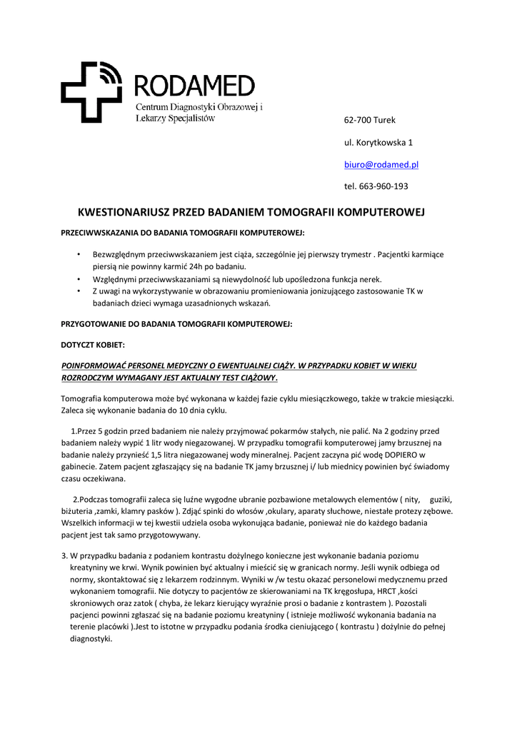 62-700 Turek ul. Korytkowska 1 [email protected] tel. 663-960-193 KWESTIONARIUSZ PRZED BADANIEM TOMOGRAFII KOMPUTEROWEJ PRZECIWWSKAZANIA DO BADANIA TOMOGRAFII KOMPUTEROWEJ: • • • Bezwzględnym przeciwwskazaniem jest ciąża, szczególnie jej pierwszy trymestr . Pacjentki karmiące piersią nie powinny karmić 24h po badaniu. Względnymi przeciwwskazaniami są niewydolność lub upośledzona funkcja nerek. Z uwagi na wykorzystywanie w obrazowaniu promieniowania jonizującego zastosowanie TK w badaniach dzieci wymaga uzasadnionych wskazań. PRZYGOTOWANIE DO BADANIA TOMOGRAFII KOMPUTEROWEJ: DOTYCZT KOBIET: POINFORMOWAĆ PERSONEL MEDYCZNY O EWENTUALNEJ CIĄŻY. W PRZYPADKU KOBIET W WIEKU ROZRODCZYM WYMAGANY JEST AKTUALNY TEST CIĄŻOWY. Tomografia komputerowa może być wykonana w każdej fazie cyklu miesiączkowego, także w trakcie miesiączki. Zaleca się wykonanie badania do 10 dnia cyklu. 1.Przez 5 godzin przed badaniem nie należy przyjmować pokarmów stałych, nie palić. Na 2 godziny przed badaniem należy wypić 1 litr wody niegazowanej. W przypadku tomografii komputerowej jamy brzusznej na badanie należy przynieść 1,5 litra niegazowanej wody mineralnej. Pacjent zaczyna pić wodę DOPIERO w gabinecie. Zatem pacjent zgłaszający się na badanie TK jamy brzusznej i/ lub miednicy powinien być świadomy czasu oczekiwana. 2.Podczas tomografii zaleca się luźne wygodne ubranie pozbawione metalowych elementów ( nity, guziki, biżuteria ,zamki, klamry pasków ). Zdjąć spinki do włosów ,okulary, aparaty słuchowe, niestałe protezy zębowe. Wszelkich informacji w tej kwestii udziela osoba wykonująca badanie, ponieważ nie do każdego badania pacjent jest tak samo przygotowywany. 3. W przypadku badania z podaniem kontrastu dożylnego konieczne jest wykonanie badania poziomu kreatyniny we krwi. Wynik powinien być aktualny i mieścić się w granicach normy. Jeśli wynik odbiega od normy, skontaktować się z lekarzem rodzinnym. Wyniki w /w testu okazać personelowi medycznemu przed wykonaniem tomografii. Nie dotyczy to pacjentów ze skierowaniami na TK kręgosłupa, HRCT ,kości skroniowych oraz zatok ( chyba, że lekarz kierujący wyraźnie prosi o badanie z kontrastem ). Pozostali pacjenci powinni zgłaszać się na badanie poziomu kreatyniny ( istnieje możliwość wykonania badania na terenie placówki ).Jest to istotne w przypadku podania środka cieniującego ( kontrastu ) dożylnie do pełnej diagnostyki. 4. Pacjenci z niewydolnością nerek, nadczynnością oraz niedoczynnością tarczycy powinni przed zarejestrowaniem się skontaktować się z pracownia tomografii komputerowej !. Jeżeli poziom kreatyniny jest powyżej 2- nie wykonujemy badań z kontrastem bez wyraźnej zgody nefrologa. 5. W przypadku badania z kontrastem należy zaprzestania stosowania METAFORMINY ( lek stosowany u cukrzyków ) na 2 doby przed badaniem, poinformować swojego lekarza diabetologa o zaleceniu wykonania w/w badania przez innego specjalistę. Inne leki powinny zostać zażyte tak jak zwykle .Pacjenci powinni znać dawki i nazwy przyjmowanych leków lub posiadać ich spis. Jest to bardzo istotne w przypadku badań z podaniem środka cieniującego. 6. W przypadku chorób tarczycy wymagana jest zgoda endokrynologa na podanie kontrast. 7. Prosimy o przyniesienie i przekazanie do wglądu posiadanej dokumentacji medycznej np. kart wypisowych leczenia szpitalnego, opisów poprzednio wykonanych badań TK z płytami CD oraz wyniki RTG. 8. Osoby wymagające okularów do czytania proszone są o zabranie ich ze sobą. 9. Wyznaczona godzina badania może ulec przesunięciu ponieważ czas trwania zabiegów jest trudny do przewidzenia. 10. W razie wątpliwości i jakichkolwiek pytań można dzwonić do placówki RODAMED na podany wyżej numer telefony lub e-mail. W CZASIE BADANIA: 1. 2. Podczas badania pacjent ma stały kontakt z personelem medycznym za pośrednictwem intercomu (system telewizyjny do obserwacji pacjenta ). Pacjent powinien natychmiast zgłaszać wystąpienie nagłych dolegliwości tj. duszność, zawroty głowy, nudności, uczucie gorąca, metaliczny smak w ustach, kołatanie serca, uczucie klaustrofobii. PO BADANIU: 1. 2. Jeśli podczas badania został podany środek kontrastowy to w celu jego eliminacji z organizmu konieczne jest w ciągu 24 godzin spożycie około 2,5 litra wody niegazowanej lub napojów niesłodzonych. W rzadkich przypadkach po podaniu środka kontrastowego mogą pojawić się nudności, wysypka czy świąd, zawroty głowy, uczucie gorąca, metaliczny posmak, kołatanie serca. W razie wystąpienia powyższych lub innych niepokojących objawów wskazana jest jak najszybsza konsultacja lekarska. Pacjent 30 minut po badaniu przebywa na terenie placówki ,w celu wnikliwej obserwacji przez personel medyczny( wykluczenie ewentualnych następstw po podaniu kontrastu ). Prosimy o wypełnienie poniższej ankiety Imię i nazwisko pacjenta………………………………………………….................... wiek ……………. waga…………… Data……………………………………………………………………………………………………… nr. badania …………………….. Czy jest pani w ciąży? TAK NIE NIEWIEM Czy występowały lub występują u Pana / Pani poniższe choroby lub uczulenia: Choroby tarczycy TAK NIE Choroby nerek TAK NIE Cukrzyca TAK NIE Astma lub POCHP TAK NIE Nadciśnienie tętnicze TAK NIE Treść kwestionariusza jest dla mnie zrozumiała, a zaznaczone odpowiedzi są zgodne ze stanem faktycznym. ……………………………………………………………… Reakcja uczuleniowa na leki lub po podaniu dożylnego środka kontrastowego TAK NIE data, podpis pacjenta POWIKŁANIA I REAKCJE NIEPOŻADANE MOGACE WYSTAPIĆ PO PODANIU ŚRODKA CIENIUJĄCEGO: WCZESNE .>do 1 godziny po podaniu ( bardzo rzadko ): wynaczynienie środka cieniującego poza naczynie krwionośne, nudności, wymioty, uderzenie ciepła, uder