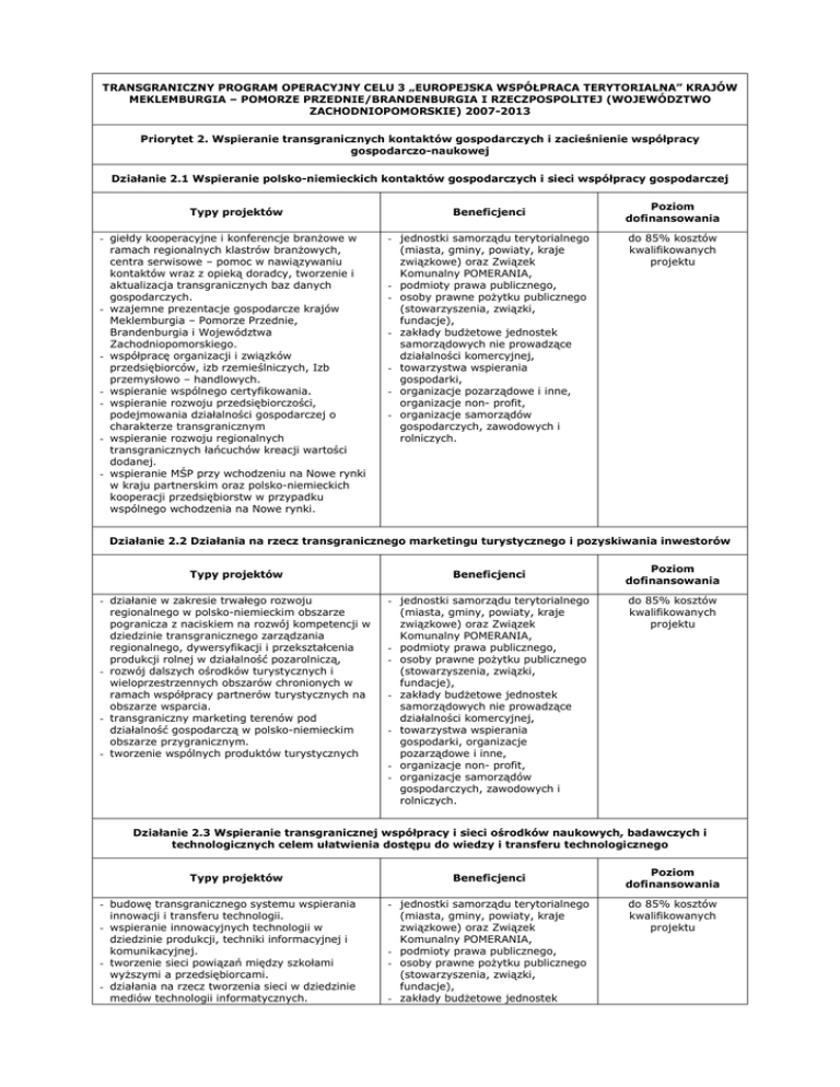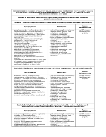 TRANSGRANICZNY PROGRAM OPERACYJNY CELU 3 „EUROPEJSKA WSPÓŁPRACA TERYTORIALNA” KRAJÓW MEKLEMBURGIA – POMORZE PRZEDNIE/BRANDENBURGIA I RZECZPOSPOLITEJ (WOJEWÓDZTWO ZACHODNIOPOMORSKIE) 2007-2013 Priorytet 2. Wspieranie transgranicznych kontaktów gospodarczych i zacieśnienie współpracy gospodarczo-naukowej Działanie 2.1 Wspieranie polsko-niemieckich kontaktów gospodarczych i sieci współpracy gospodarczej Typy projektów - giełdy kooperacyjne i konferencje branŜowe w ramach regionalnych klastrów branŜowych, centra serwisowe – pomoc w nawiązywaniu kontaktów wraz z opieką doradcy, tworzenie i aktualizacja transgranicznych baz danych gospodarczych. - wzajemne prezentacje gospodarcze krajów Meklemburgia – Pomorze Przednie, Brandenburgia i Województwa Zachodniopomorskiego. - współpracę organizacji i związków przedsiębiorców, izb rzemieślniczych, Izb przemysłowo – handlowych. - wspieranie wspólnego certyfikowania. - wspieranie rozwoju przedsiębiorczości, podejmowania działalności gospodarczej o charakterze transgranicznym - wspieranie rozwoju regionalnych transgranicznych łańcuchów kreacji wartości dodanej. - wspieranie MŚP przy wchodzeniu na Nowe rynki w kraju partnerskim oraz polsko-niemieckich kooperacji przedsiębiorstw w przypadku wspólnego wchodzenia na Nowe rynki. Beneficjenci - jednostki samorządu terytorialnego (miasta, gminy, powiaty, kraje związkowe) oraz Związek Komunalny POMERANIA, - podmioty prawa publicznego, - osoby prawne poŜytku publicznego (stowarzyszenia, związki, fundacje), - zakłady budŜetowe jednostek samorządowych nie prowadzące działalności komercyjnej, - towarzystwa wspierania gospodarki, - organizacje pozarządowe i inne, organizacje non- profit, - organizacje samorządów gospodarczych, zawodowych i rolniczych. Poziom dofinansowania do 85% kosztów kwalifikowanych projektu Działanie 2.2 Działania na rzecz transgranicznego marketingu turystycznego i pozyskiwania inwestorów Typy projektów Beneficjenci - działanie w zakresie trwałego rozwoju regionalnego w polsko-niemieckim obszarze pogranicza z naciskiem na rozwój kompetencji w dziedzinie transgranicznego zarządzania regionalnego, dywersyfikacji i przekształcenia produkcji rolnej w działalność pozarolniczą, - rozwój dalszych ośrodków turystycznych i wieloprzestrzennych obszarów chronionych w ramach współpracy partnerów turystycznych na obszarze wsparcia. - transgraniczny marketing terenów pod działalność gospodarczą w polsko-niemieckim obszarze przygranicznym. - tworzenie wspólnych produktów turystycznych - jednostki samorządu terytorialnego (miasta, gminy, powiaty, kraje związkowe) oraz Związek Komunalny POMERANIA, - podmioty prawa publicznego, - osoby prawne poŜytku publicznego (stowarzyszenia, związki, fundacje), - zakłady budŜetowe jednostek samorządowych nie prowadzące działalności komercyjnej, - towarzystwa wspierania gospodarki, organizacje pozarządowe i inne, - organizacje non- profit, - organizacje samorządów gospodarczych, zawodowych i rolniczych. Poziom dofinansowania do 85% kosztów kwalifikowanych projektu Działanie 2.3 Wspieranie transgranicznej współpracy i sieci ośrodków naukowych, badawczych i technologicznych celem ułatwienia dostępu do wiedzy i transferu technologicznego Typy projektów - budowę transgranicznego systemu wspierania innowacji i transferu technologii. - wspieranie innowacyjnych technologii w dziedzinie produkcji, techniki informacyjnej i komunikacyjnej. - tworzenie sieci powiązań między szkołami wyŜszymi a przedsiębiorcami. - działania na rzecz tworzenia sieci w dziedzinie mediów technologii informatycznych. Beneficjenci - jednostki samorządu terytorialnego (miasta, gminy, powiaty, kraje związkowe) oraz Związek Komunalny POMERANIA, - podmioty prawa publicznego, - osoby prawne poŜytku publicznego (stowarzyszenia, związki, fundacje), - zakłady budŜetowe jednostek Poziom dofinansowania do 85% kosztów kwalifikowanych projektu - działania na rzecz wprowadzenia transgranicznych platform internetowych, banków danych i e-Commerce samorządowych nie prowadzące działalności komercyjnej, - towarzystwa wspierania gospodarki, organizacje pozarządowe i inne, - organizacje non- profit, - organizacje samorządów gospodarczych, zawodowych i rolniczych.