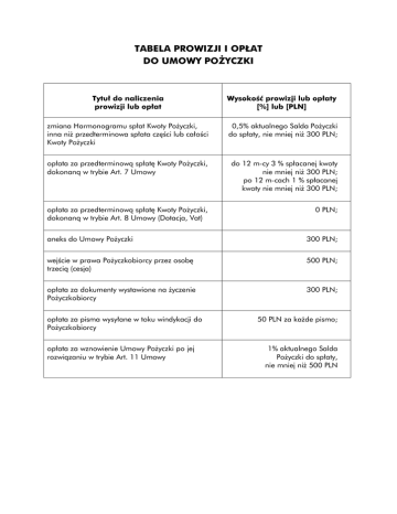 TABELA PROWIZJI I OPŁAT DO UMOWY POŻYCZKI Tytuł do naliczenia prowizji lub opłat Wysokość prowizji lub opłaty [%] lub [PLN] zmiana Harmonogramu spłat Kwoty Pożyczki, inna niż przedterminowa spłata części lub całości Kwoty Pożyczki 0,5% aktualnego Salda Pożyczki do spłaty, nie mniej niż 300 PLN; opłata za przedterminową spłatę Kwoty Pożyczki, dokonaną w trybie Art. 7 Umowy do 12 m-cy 3 % spłacanej kwoty nie mniej niż 300 PLN; po 12 m-cach 1 % spłacanej kwoty nie mniej niż 300 PLN; opłata za przedterminową spłatę Kwoty Pożyczki, dokonaną w trybie Art. 8 Umowy (Dotacja, Vat) 0 PLN; aneks do Umowy Pożyczki 300 PLN; wejście w prawa Pożyczkobiorcy przez osobę trzecią (cesja) 500 PLN; opłata za dokumenty wystawione na życzenie Pożyczkobiorcy 300 PLN; opłata za pisma wysyłane w toku windykacji do Pożyczkobiorcy opłata za wznowienie Umowy Pożyczki po jej rozwiązaniu w trybie Art. 11 Umowy 50 PLN za każde pismo; 1% aktualnego Salda Pożyczki do spłaty, nie mniej niż 500 PLN