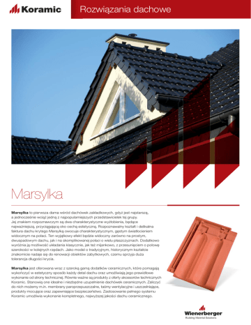 Rozwiązania dachowe Marsylka Marsylka to pierwsza dama wśród dachówek zakładkowych, gdyż jest najstarszą, a jednocześnie wciąż jedną z najpopularniejszych przedstawicielek tej grupy. Jej znakiem rozpoznawczym są dwa charakterystyczne wyżłobienia, będące najważniejszą, przyciągającą oko cechą estetyczną. Rozpoznawalny kształt i delikatna faktura dachu krytego Marsylką owocuje charakterystycznym, gęstym światłocieniem widocznym na połaci. Ten wyjątkowy efekt będzie widoczny zarówno na prostym, dwuspadowym dachu, jak i na skomplikowanej połaci o wielu płaszczyznach. Dodatkowo wyróżnia ją możliwość układania klasycznie, jak też mijankowo, z przesunięciem o połowę szerokości w kolejnych rzędach. Jako model o tradycyjnym, historycznym kształcie znakomicie nadaje się do renowacji obiektów zabytkowych, czemu sprzyja duża tolerancja długości krycia. Marsylka jest oferowana wraz z szeroką gamą dodatków ceramicznych, które pomagają wykończyć w estetyczny sposób każdy detal dachu oraz umożliwiają jego prawidłowe wykonanie od strony technicznej. Równie ważne są produkty z oferty akcesoriów technicznych Koramic. Stanowią one idealne i niezbędne uzupełnienie dachówek ceramicznych. Zaliczyć do nich możemy m.in. membrany paroprzepuszczalne, taśmy wentylacyjne i uszczelniające, produkty mocujące oraz zapewniające bezpieczeństwo. Zastosowanie pełnego systemu Koramic umożliwia wykonanie kompletnego, najwyższej jakości dachu ceramicznego. Rozwiązania dachowe Marsylka Dachówka podstawowa Dane techniczne Minimalne zapotrzebowanie [szt./m2] Zapotrzebowanie gąsiora [szt./mb] 23,2 33,0 - 36,0 42,5 Długość krycia [cm] 27,0 Średnia długość krycia [cm] 34,5 Szerokość krycia [cm] 23,2 Wymiary [cm] 42,5 x 27,0 Orientacyjny ciężar dachówki [kg] 3,6 Ilość na palecie [szt.] 240 Ilość w paczce [szt.] 6 *przy zastosowaniu membrany dachowej Dostępność kolorów naturalna czerwień czerwona angoba ceglasta angoba szlachetna ciemnobrązowa angoba ceglasta angoba szlachetna antracytowa angoba ok. 2,5 33,0 - 36,0 Minimalny kąt nachylenia* [ ˚ ] naturalna czerwień 12,0 czarna angoba szlachetna antracytowa angoba 30 / 24* Akcesoria ceramiczne szczytowa lewa wentylacyjna zamknięcie końcowe kalenicy nr 11 23,2 6,0 27,0 szczytowa prawa 24,5 33,0 - 36,0 42,5 42,5 33,0 - 36,0 6,5 28,5 27,0 kominek odpowietrzający 23,2 trójnik początkowy nr 11 23,2 14,0 48,0 6,0 17,0 25 5,5 ,5 33,0 - 36,0 42,5 41,0 42,5 27,0 27,0 10,5 antenowa + nasadka szczytowa połówkowa lewa 42,0 33,0 - 36,0 2 24,8 trójnik końcowy nr 11 23,2 14,0 6,0 48,0 5,5 25 ,5 27,0 25,5 25,5 40,8 10,5 43,8 15,5 24,8 10,0 25,9 13,0 20,5 11,0 22,9 25,9 13,0 11,5 20,5 11,0 16,5 46,0 33,0 - 36,0 42,5 gąsior pulpitowy końcowy 17,5 33,0 - 36,0 42,5 11,0 ,0 zamknięcie początkowe kalenicy nr 11 11,7 20,5 gąsior pulpitowy początkowy 2, 27,0 połówkowa 13,0 11,5 10, zamknięcie początkowe grzbietu nr 11 dwufalowa 22,9 25,9 40,8 33,0- 36,0 42,5 14,0 28,5 6,0 46,0 11,7 gąsior pulpitowy 40,8 gąsior nr 11 46,0 szczytowa połówkowa prawa 33,0 - 36,0 42,5 42,5 15,5 45,0 33,0 - 36,0 2 25,5 15,5 Wymiary prezentowane na rysunkach są wymiarami nominalnymi Rozwiązania dachowe Marsylka Polecane akcesoria techniczne Koramic Light Koramic Plus Koramic Premium 2P Koramic Flexi aluminium + tkanina techniczna Koramic Alu aluminium Elementy wentylacyjne okapu Taśma KoraFlex Standard Taśma KoraFlex Super System przeciwśniegowy System komunikacji dachowej Firma Wienerberger posiada w swojej ofercie nie tylko zróżnicowane i atrakcyjne Membrany dachowe chronią warstwę izolacji termicznej przed zawilgoceniem, modele dachówek ceramicznych, lecz także produkty nieceramiczne, które a jednocześnie umożliwiają odprowadzenie nadmiaru wilgoci z domu. Elementy razem z dachówkami tworzą kompletny system umożliwiający budowę dachu okapu zabezpieczają przed dostawaniem się pod pokrycie zanieczyszczeń oraz czyniący go bezpiecznym i trwałym. Oferowane są one pod wspólną i drobnych zwierząt oraz umo-żliwiają wlot powietrza wentylującego dach. nazwą jako akcesoria techniczne Koramic. Jest to cała gama produktów, które Jego ujście znajduje się na kalenicy, którą z kolei zabezpieczają specjalne po zakoń-czeniu budowy często pozostają niewidoczne na pierwszy rzut oka, taśmy wentylacyjno-uszczelniające. Newralgiczne miejsce, w którym przez dach ale bez których żaden nowoczesny dach nie może prawidłowo funkcjonować. przechodzi komin, najlepiej chroni taśma i listwy KoraFlex. Spinki i klamry Każdy z tych produktów ma do spełnienia ściśle określoną rolę. skutecznie mocują elementy ceramiczne użyte do budowy dachu. Elementy przeciwśniegowe zapewniają bezpieczeństwo w okresach zimowych, a system komunikacji dachowej umożliwia bezpieczne inspekcje dachu i kominów. Detale architektoniczne Detal wykończenia kalenicy dachu i okapu dachu. K OW 0 33, 033, 033, ,0 - 36 KWD 0 36, 0 36, 033, 033, 0 36, 0 36, 8 38, min. 1 cm 2/3 L L 1/3 L Detal krawędzi dachu z dachówką dwufalową. Detal krawędzi dachu z dachówkami szczytowymi i szczytowymi połówkowymi. 6,0 3,0 20, 23,2 23,2 23,2 24,0 7,0 3,0 16,2 23,2 23,2 23,2 20,0 7,0 àąF]QDV]HURNRĞüGDFKX àąF]QDV]HURNRĞüGDFKX 6,0 7,0 4,7 23,2 23,2 23,2 23,2 8,5 7,0 àąF]QDV]HURNRĞüGDFKX Wartości OWK i KWD dla właściwego kąta nachylenia ND [°] ND [°] 20 25 30 35 40 45 OWK [mm] 40 45 50 55 55 50 KWD [mm] 115 110 105 90 80 75 ND - kąt nachylenia dachu OWK - odległość ostatniej łaty od teoretycznego wierzchołka kalenicy KWD - odległość góry łaty kalenicowej od teoretycznego wierzchołka kalenicy Wienerberger jest wiodącym producentem ceramicznych materiałów budowlanych na świecie. Na rynku polskim obecny od prawie 20 lat, jest krajowym liderem wśród producentów materiałów ceramicznych, oferując cegły konstrukcyjne i stropy Porotherm, dachówki ceramiczne i niezbędne akces