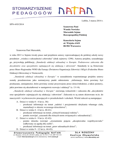 Lublin, 3 marca 2014 r. SPN-4/03/2014 Szanowna Pani Wanda Nowicka Marszałek Sejmu Rzeczpospolitej Polskiej Kancelaria Sejmu ul. Wiejska 4/6/8 00-902 Warszawa Szanowna Pani Marszałek, w roku 2013 w Sejmie trwały prace nad projektem ustawy wprowadzającej do polskiej szkoły nowy przedmiot: „wiedza o seksualności człowieka” (druk sejmowy 1298). Autorzy projektu, uzasadniając go, przywołują publikację „Standardy edukacji seksualnej w Europie. Podstawowe zalecenia dla decydentów oraz specjalistów zajmujących się edukacją i zdrowiem”. Standardy te są firmowane przez Biuro Regionalne WHO dla Europy (Światowa Organizacja Zdrowia) i BZgA (Federalne Biuro Edukacji Zdrowotnej w Niemczech). „Standardy edukacji seksualnej w Europie” w uzasadnieniu wspomnianego projektu ustawy zostały przedstawione jako normatywny punkt odniesienia: „informacje, które powinny być przekazane, umiejętności, które powinny zostać przyswojone przez dzieci/młodzież, a także postawy, jakie powinno się ukształtować w następstwie rozwoju i edukacji” (s. 13-14). „Standardy edukacji seksualnej w Europie” zawierają wskazówki i zalecenia dla „decydentów oraz specjalistów zajmujących się edukacją i zdrowiem”. Zalecenia te są zatem skierowane m.in. do nauczycieli i wychowawców pracujących w przedszkolach i szkołach. Wśród zaleceń są następujące: A. Dzieci w wieku 0 - 4 lat (s. 38): przekazać informacje na temat „radości i przyjemności dotykania własnego ciała, masturbacji w okresie wczesnego dzieciństwa”; B. Dzieci w wieku 4 - 6 lat (s. 40-41): przekazać informacje na temat „różnych koncepcji rodziny”; pomóc rozwijać „szacunek dla różnych norm związanych z seksualnością”; C. Dzieci w wieku 6 - 9 lat (s. 42-43): pomóc dziecku rozwijać „zrozumienie pojęcia „akceptowalne współżycie/seks” (odbywany za zgodą obu osób)”; przekazać informacje na temat „praw seksualnych dzieci”; D. Dzieci w wieku 9 - 12 lat (s. 44-45): Stowarzyszenie Pedagogów NATAN ul. Skautów 11b m 29, 20-055 Lublin, tel.: 81 533 17 25, 609 734 114 e-mail: [email protected] serwis internetowy: www.natan.pl DLA RODZINY Koalicja Obywatelska serwis internetowy: www.dlarodziny.net przekazać informacje na temat „różnic pomiędzy tożsamością płciową i płcią biologiczną”; nauczyć „skutecznego stosowania prezerwatyw i środków antykoncepcyjnych w przyszłości”; E. Dzieci w wieku 12 - 15 lat (s. 46-49) nauczyć „umiejętności negocjowania i komunikowania się w celu uprawiania bezpiecznego i przyjemnego seksu”; pomóc dziecku rozwijać „krytyczne podejście do norm kulturowych / religijnych w odniesieniu do ciąży, rodzicielstwa itp.”. Pani Marszałek podpisała się pod tym projektem. Została też wskazana jako osoba upoważniona do reprezentowania wnioskodawców podczas prac nad tym projektem ustawy. Chciałbym w związku z tym, w imieniu Stowarzyszenia Pedagogów NATAN – uczestnika Koalicji Obywatelskiej DLA RODZINY, zapytać Panią Marszałek: 1. Czy podpis Pani Marszałek pod projektem ustawy o edukacji seksualnej oznacza pełną akceptację „Standardów edukacji seksualnej w Europie”? 2. Czy w publikacji „Standardy edukacji seksualnej w Europie” są zalecenia, których Pani Marszałek nie akceptuje? Jeśli tak, to których? Dlaczego? 3. Jak Pani Marszałek ocenia szczególnie takie zalecenia, aby: dzieciom w wieku do 4 lat przekazać informacje na temat „radości i przyjemności dotykania własnego ciała, masturbacji w okresie wczesnego dzieciństwa”? (s. 38) dzieciom w wieku 6 – 9 lat pomóc rozwijać „zrozumienie pojęcia „akceptowalne współżycie/seks” (odbywany za zgodą obu osób)”, przekazać informacje na temat „praw seksualnych dzieci”? (s. 42) dzieci w wieku 9 – 12 lat nauczyć „skutecznego stosowania prezerwatyw i środków antykoncepcyjnych w przyszłości”? (s. 44); dzieci w wieku 12 – 15 lat nauczyć „umiejętności negocjowania i komunikowania się w celu uprawiania bezpiecznego i przyjemnego seksu”, pomóc dziecku rozwijać „krytyczne podejście do norm kulturowych / religijnych w odniesieniu do ciąży, rodzicielstwa itp.”? (s. 48) 4. Czy Pani Marszałek chce, aby „Standardy edukacji seksualnej w Europie” stały się dokumentem obowiązującym polskich nauczycieli i pedagogów? Z wyrazami szacunku W imieniu Stowarzyszenia Pedagogów NATAN – uczestnika Koalicji Obywatelskiej DLA RODZINY Stowarzyszenie Pedagogów NATAN ul. Skautów 11b m 29, 20-055 Lublin, tel.: 81 533 17 25, 609 734 114 e-mail: [email protected] serwis internetowy: www.natan.pl DLA RODZINY Koalicja Obywatelska serwis internetowy: www.dlarodziny.net