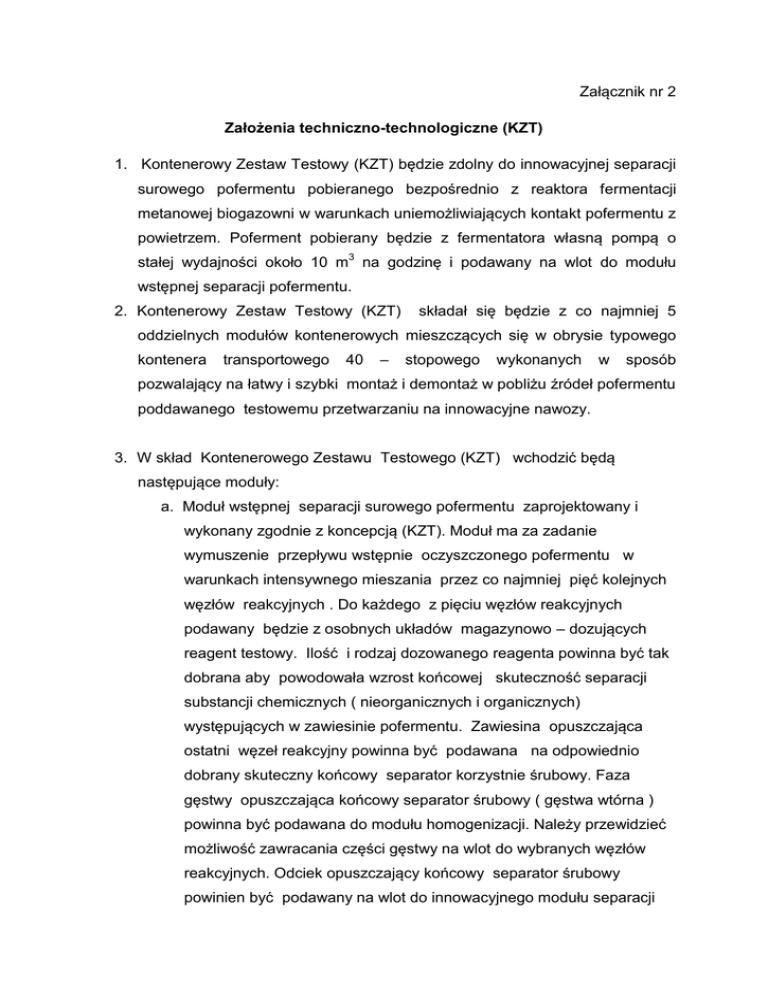 Załącznik nr 2 Założenia techniczno-technologiczne (KZT) 1. Kontenerowy Zestaw Testowy (KZT) będzie zdolny do innowacyjnej separacji surowego pofermentu pobieranego bezpośrednio z reaktora fermentacji metanowej biogazowni w warunkach uniemożliwiających kontakt pofermentu z powietrzem. Poferment pobierany będzie z fermentatora własną pompą o stałej wydajności około 10 m3 na godzinę i podawany na wlot do modułu wstępnej separacji pofermentu. 2. Kontenerowy Zestaw Testowy (KZT) składał się będzie z co najmniej 5 oddzielnych modułów kontenerowych mieszczących się w obrysie typowego kontenera transportowego 40 – stopowego wykonanych w sposób pozwalający na łatwy i szybki montaż i demontaż w pobliżu źródeł pofermentu poddawanego testowemu przetwarzaniu na innowacyjne nawozy. 3. W skład Kontenerowego Zestawu Testowego (KZT) wchodzić będą następujące moduły: a. Moduł wstępnej separacji surowego pofermentu zaprojektowany i wykonany zgodnie z koncepcją (KZT). Moduł ma za zadanie wymuszenie przepływu wstępnie oczyszczonego pofermentu w warunkach intensywnego mieszania przez co najmniej pięć kolejnych węzłów reakcyjnych . Do każdego z pięciu węzłów reakcyjnych podawany będzie z osobnych układów magazynowo – dozujących reagent testowy. Ilość i rodzaj dozowanego reagenta powinna być tak dobrana aby powodowała wzrost końcowej skuteczność separacji substancji chemicznych ( nieorganicznych i organicznych) występujących w zawiesinie pofermentu. Zawiesina opuszczająca ostatni węzeł reakcyjny powinna być podawana na odpowiednio dobrany skuteczny końcowy separator korzystnie śrubowy. Faza gęstwy opuszczająca końcowy separator śrubowy ( gęstwa wtórna ) powinna być podawana do modułu homogenizacji. Należy przewidzieć możliwość zawracania części gęstwy na wlot do wybranych węzłów reakcyjnych. Odciek opuszczający końcowy separator śrubowy powinien być podawany na wlot do innowacyjnego modułu separacji amoniaku ( opcja dodatkowa). Należy przewidzieć dwie opcje rozwiązania: w pierwszej na węzeł separacji amoniaku podawana będzie zawiesina opuszczająca piąty węzeł reakcyjny, w wersji alternatywnej na węzeł separacji amoniaku podawany będzie wyłącznie odciek z separatora końcowego. b. Moduł magazynowo-dozujący – powinien zapewniać możliwość podawania określonej ilości dodatków wykorzystywanych w procesie poprawy skuteczności separacji ( modyfikacji rodzaju, kolejności i ilości dozowanych dodatków poprawiających skuteczność separacji). Moduł ten powinien być zintegrowany procesowo z modułem separacji. c. Moduł homogenizacji obu strumieni gęstw i dozowania uzyskanej łącznej homogenicznej gęstwy pofermentu końcowego ( gęstwy pierwotnej i wtórnej ) do innowacyjnej suszarni chemicznej realizującej proces suszenia w oparciu o ciepło zachodzących egzotermicznych reakcji chemicznych. d. Moduł schładzania, granulacji, modyfikacji składu i pakowania wytworzonych nawozów. W module tym powstały nawóz po ostygnięciu i ewentualnie dosuszeniu powinien być poddawany procesom granulacji i pakowania oraz w specyficznych sytuacjach uzupełniania o dodatkowe składniki zwiększające wartość wytworzonego nawozu. e. Moduł separacji amoniaku z odcieku ( z węzłem denitryfikacji - Opcja) . Moduł ten powinien umożliwiać skuteczne obniżenie zawartości amoniaku w roztworze odcieku wykorzystanie przetworzonego do poziomu umożliwiającego odcieku jako źródła wody technologicznej. Oferent musi posiadać prawo do korzystania z wszystkich innowacyjnych rozwiązań technicznych i technologicznych zastosowanych w projekcie włącznie z prawem o cesji uprawnień licencyjnych na wytwarzane nawozy w skali i zakresie niezbędnym do zagospodarowania całości gęstwy uzyskiwanej podczas pracy (KZT).
